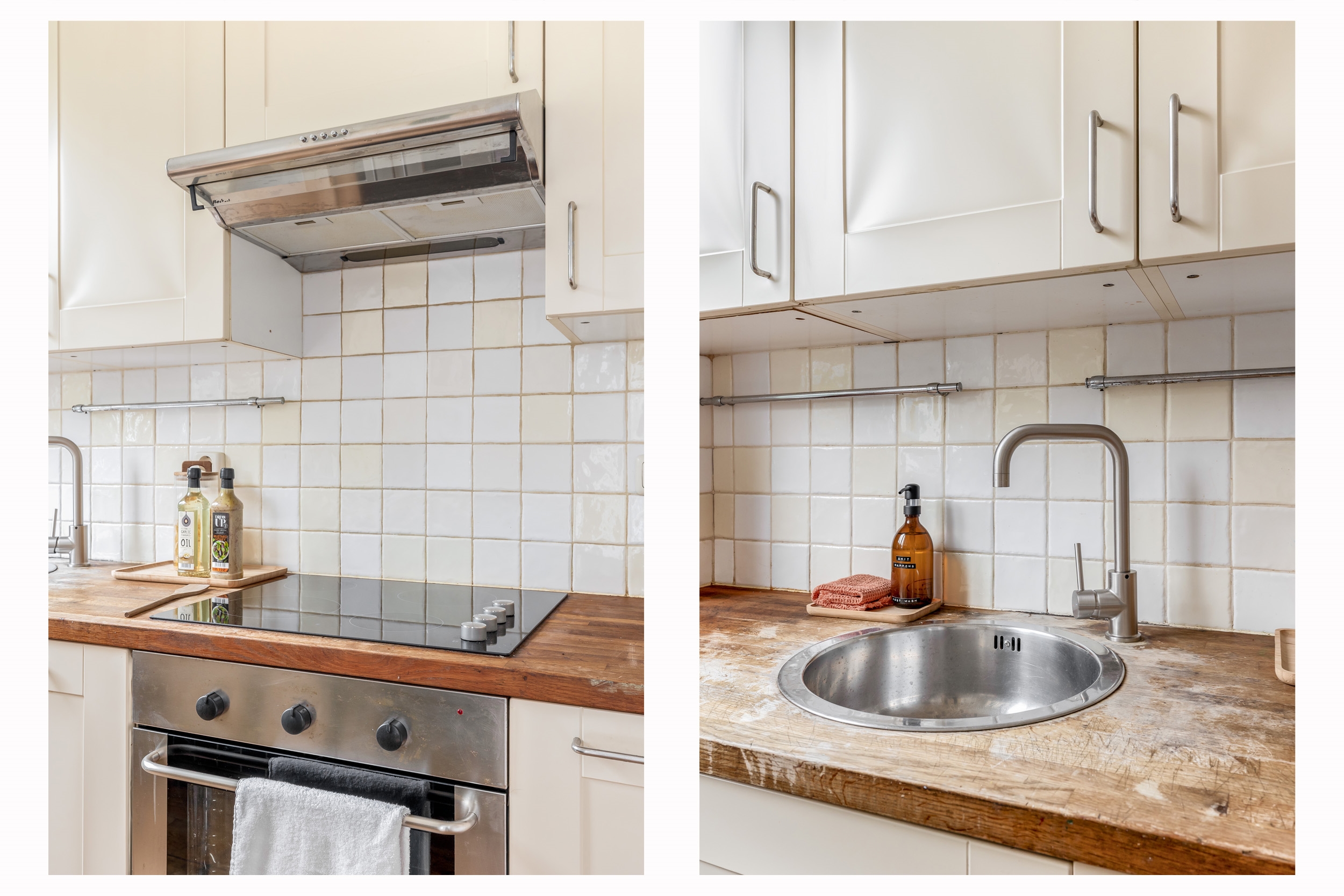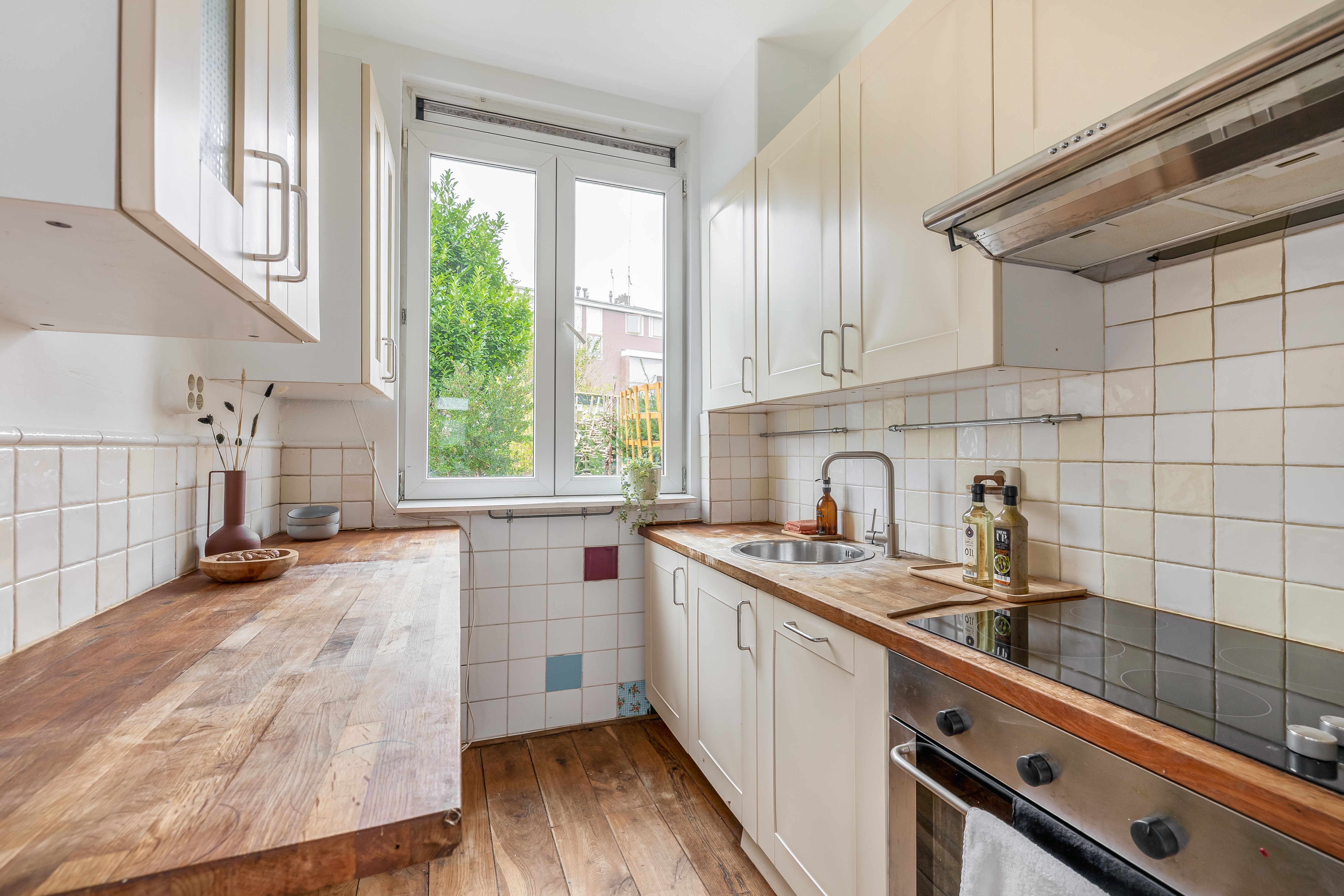 De keuken is praktisch ingedeeld en voorzien van diverse inbouwapparatuur. Direct naast de keuken vind je de badkamer, die is uitgerust met een ligbad/douchecombinatie en wastafel.
