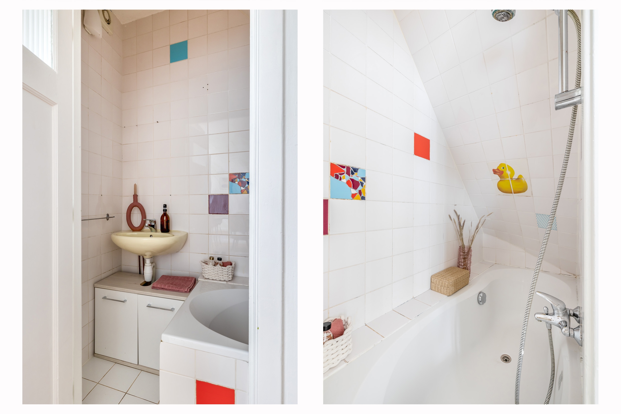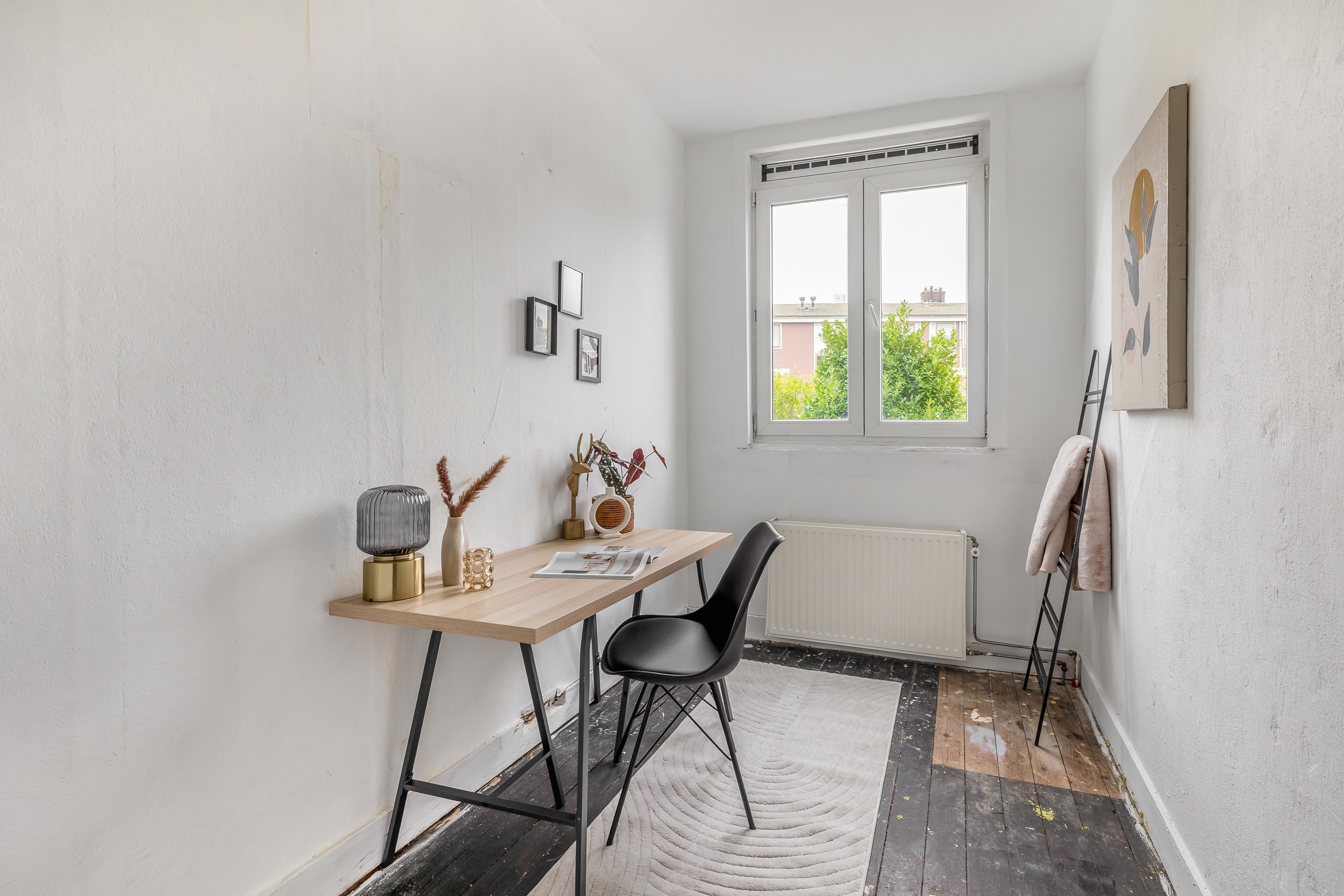 Op de eerste verdieping bevindt zich een tweede slaapkamer, gelegen aan de achterzijde van de woning. Dankzij het schuine dak en de goede lichtinval is dit een perfect als logeerkamer of werkkamer.