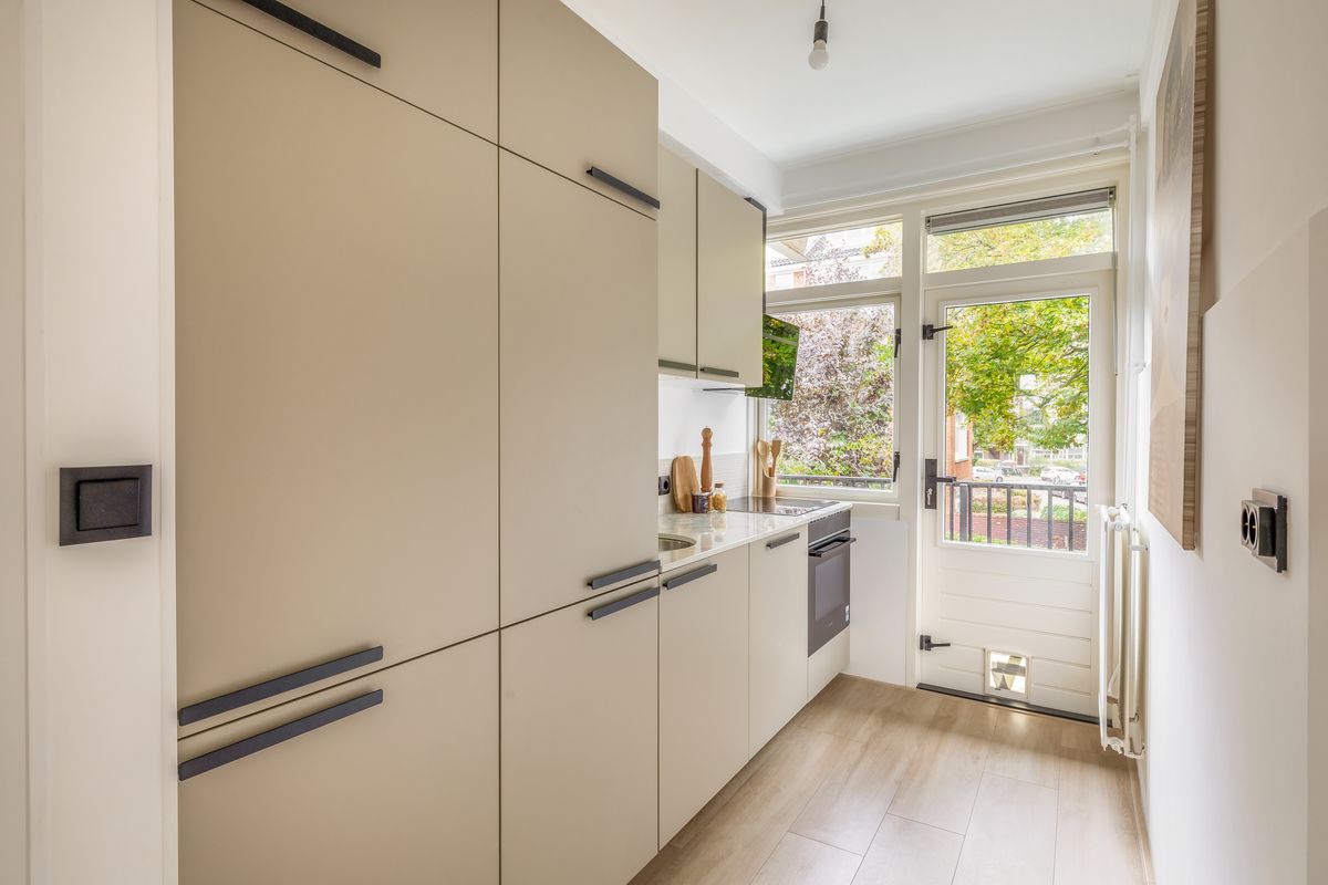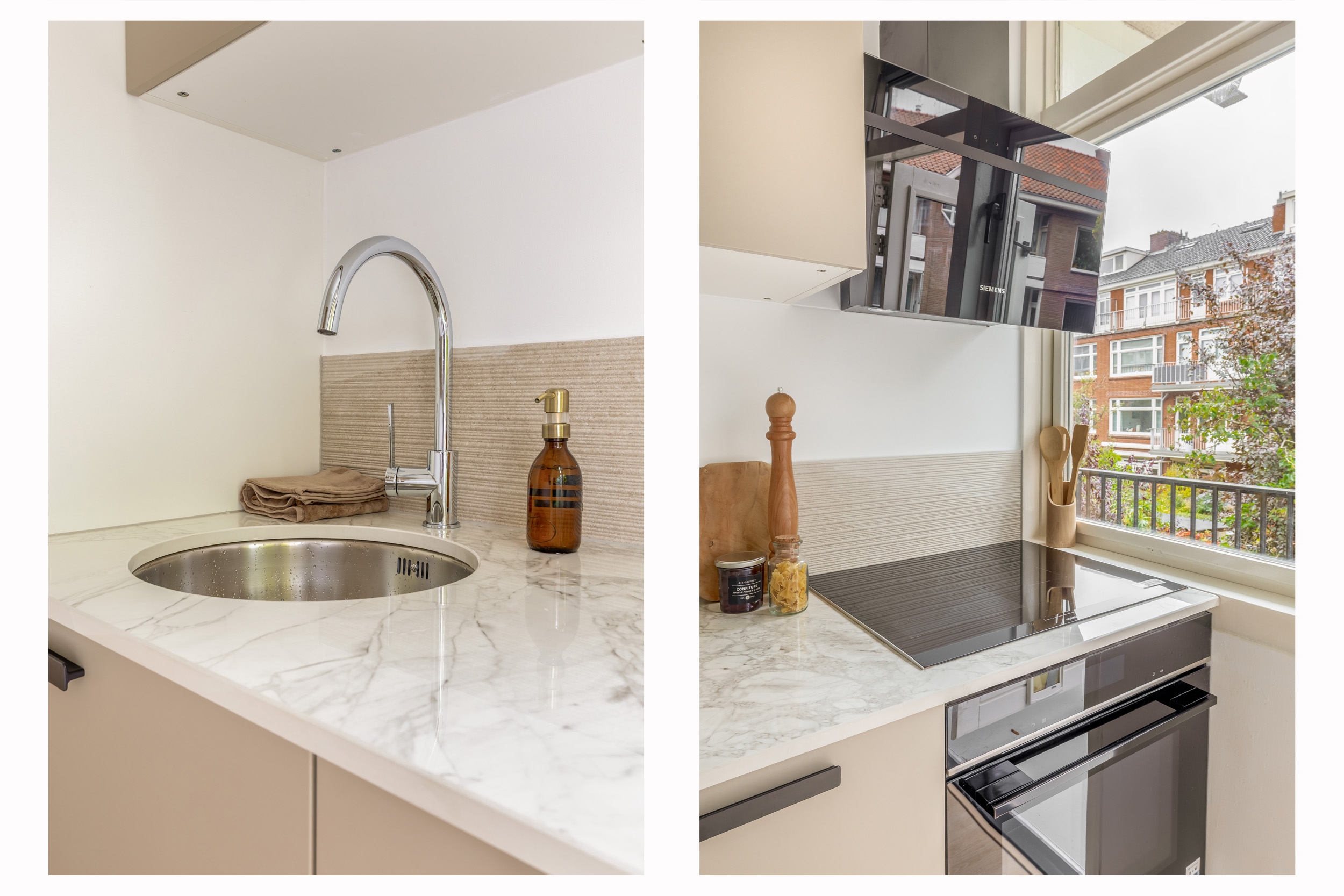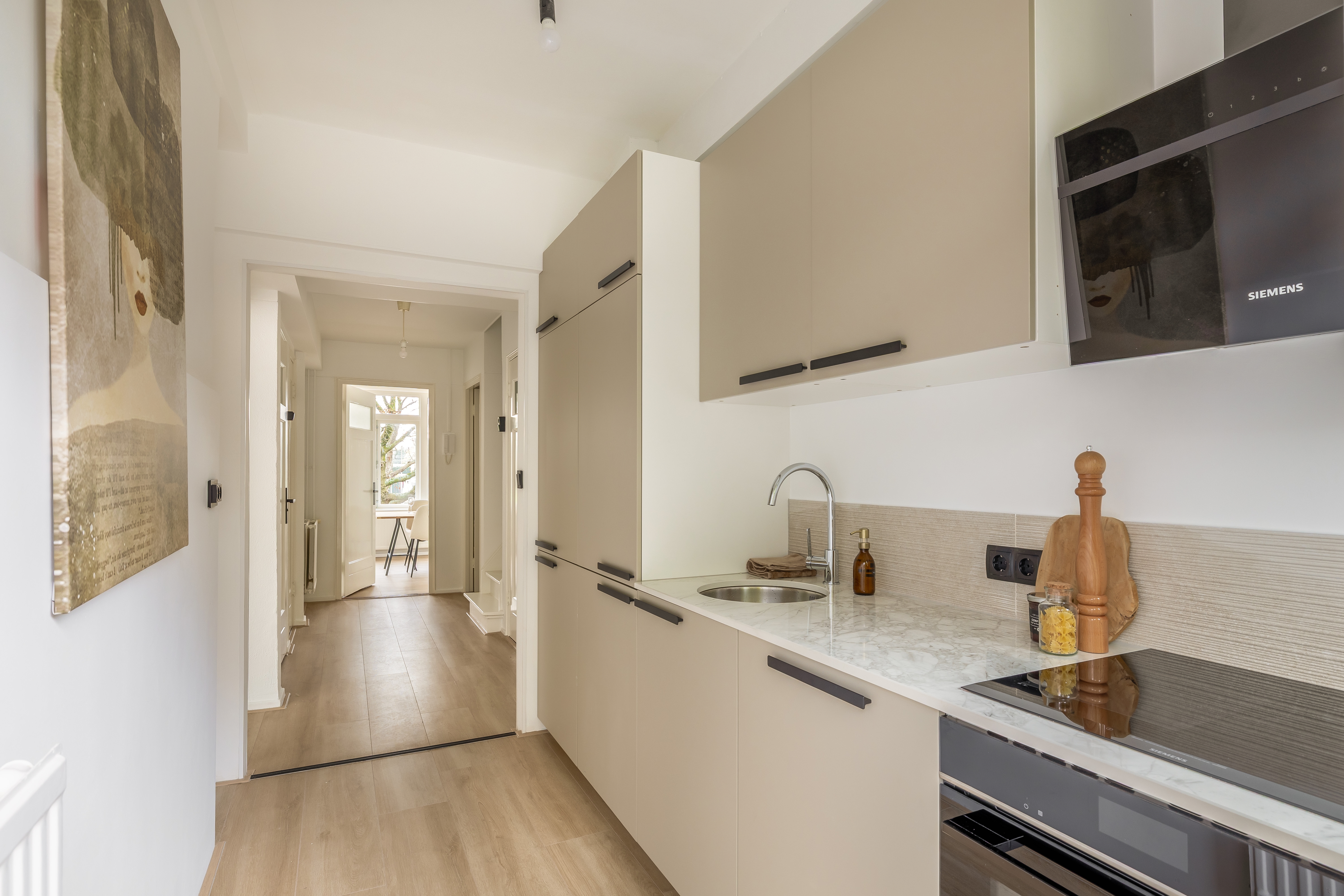De recent gerenoveerde keuken is gelegen aan de achterzijde van de woning en is uitgevoerd in een wandopstelling. De modern en hoogwaardig afgewerkte keuken is voorzien van een stenen marmerlook werkblad, voldoende kastruimte, een spoelbak en diverse Siemens inbouwapparatuur, waaronder een inductiekookplaat, afzuigkap, koelkast, vriezer, oven en vaatwasser. Tevens bevindt zich hier de opstelplaats van de C.V.-ketel en is er toegang tot het balkon aan de achterzijde.