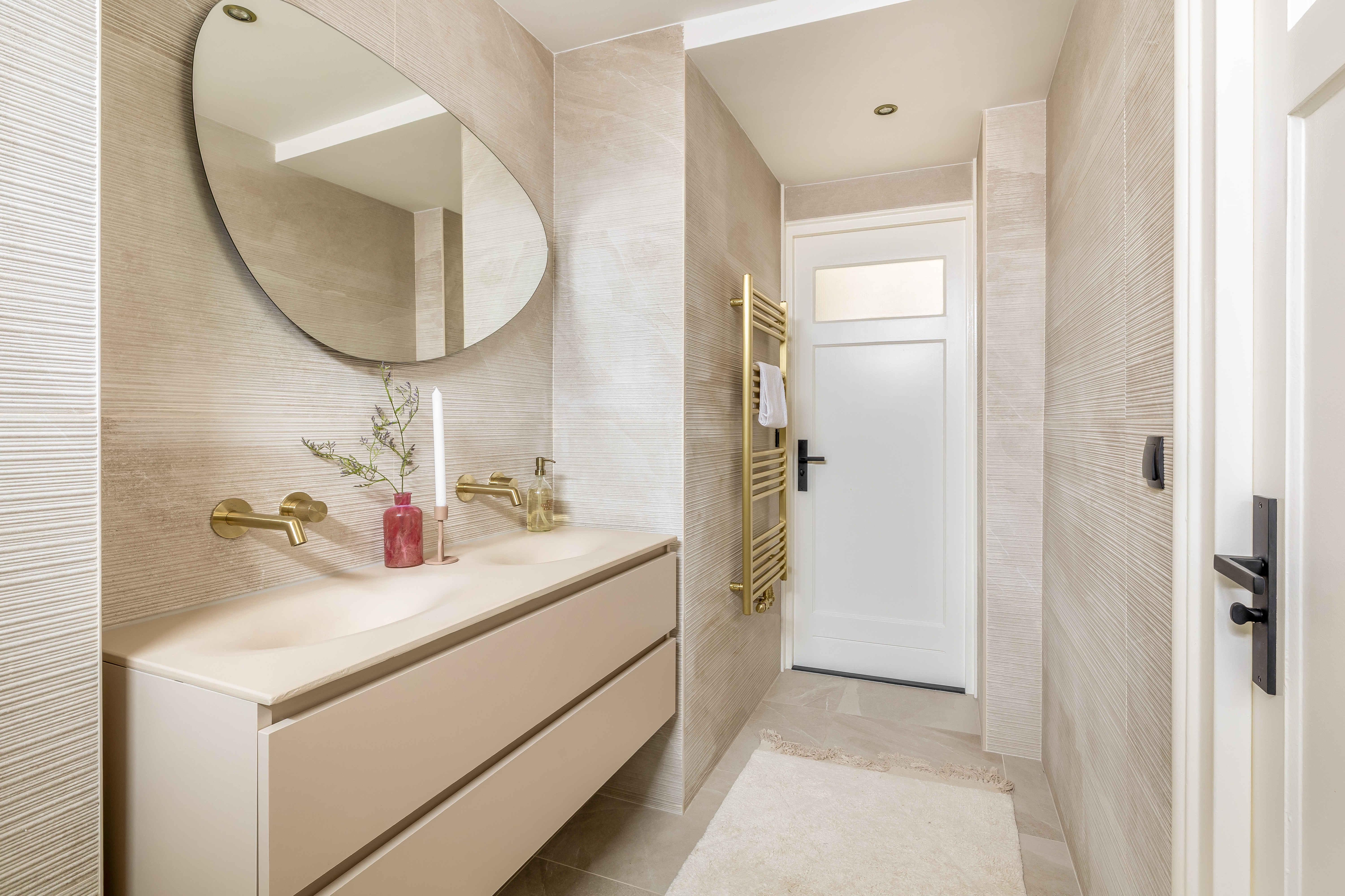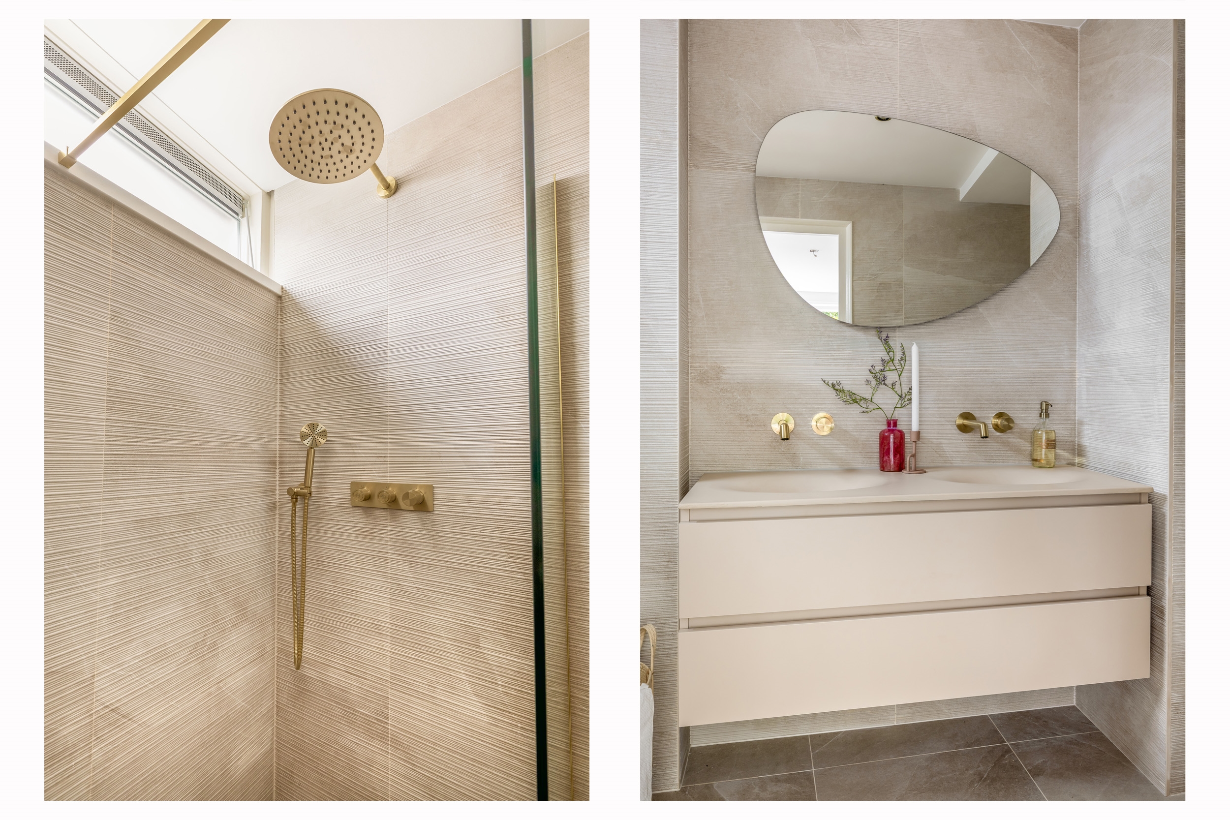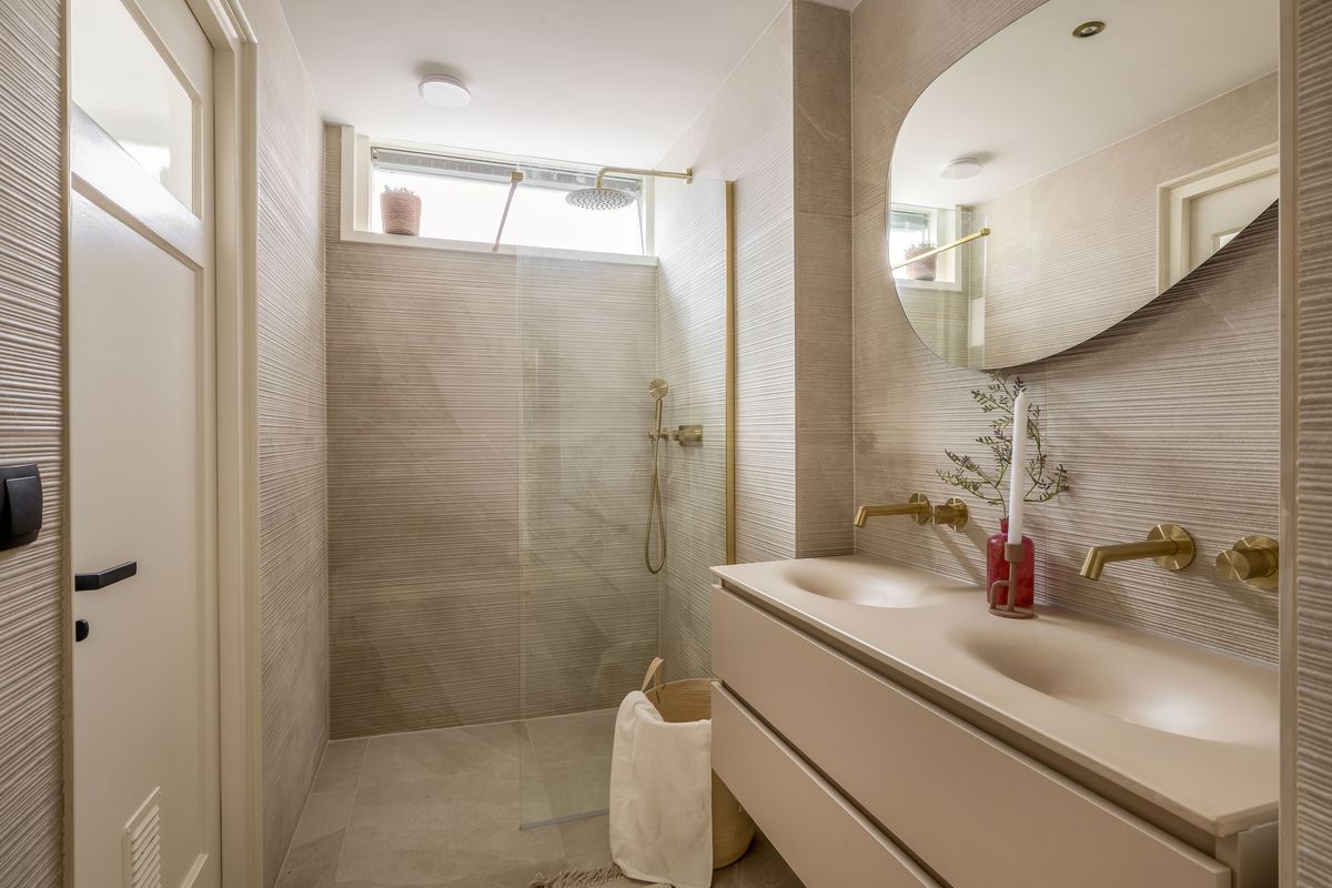 De luxe afgewerkte en recent gerenoveerd badkamer is volledig betegeld in een beige kleurstelling met messing details. De badkamer is voorzien van een inloopdouche met regendouche, dubbel wastafelmeubel, spiegel en handdoekradiator.