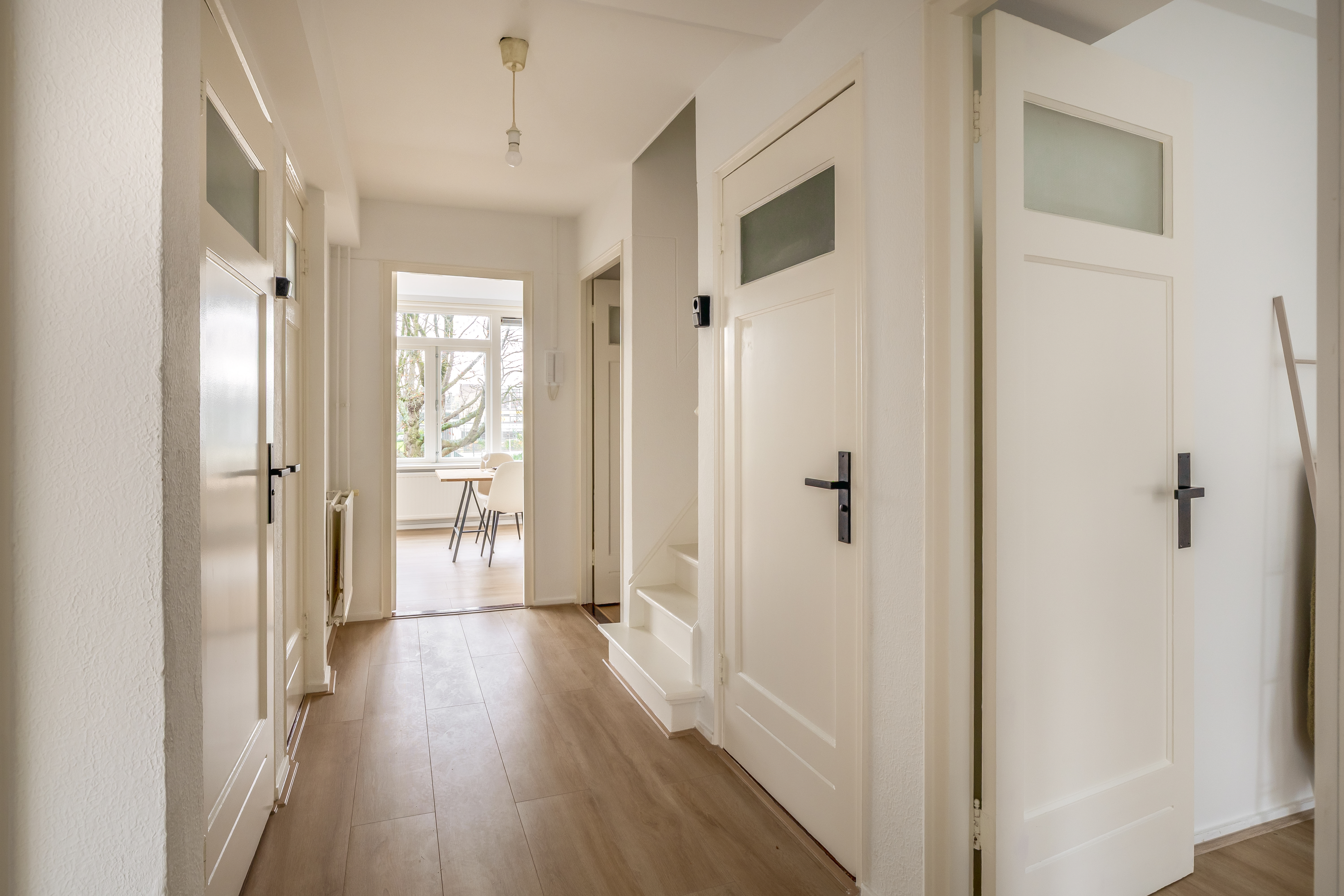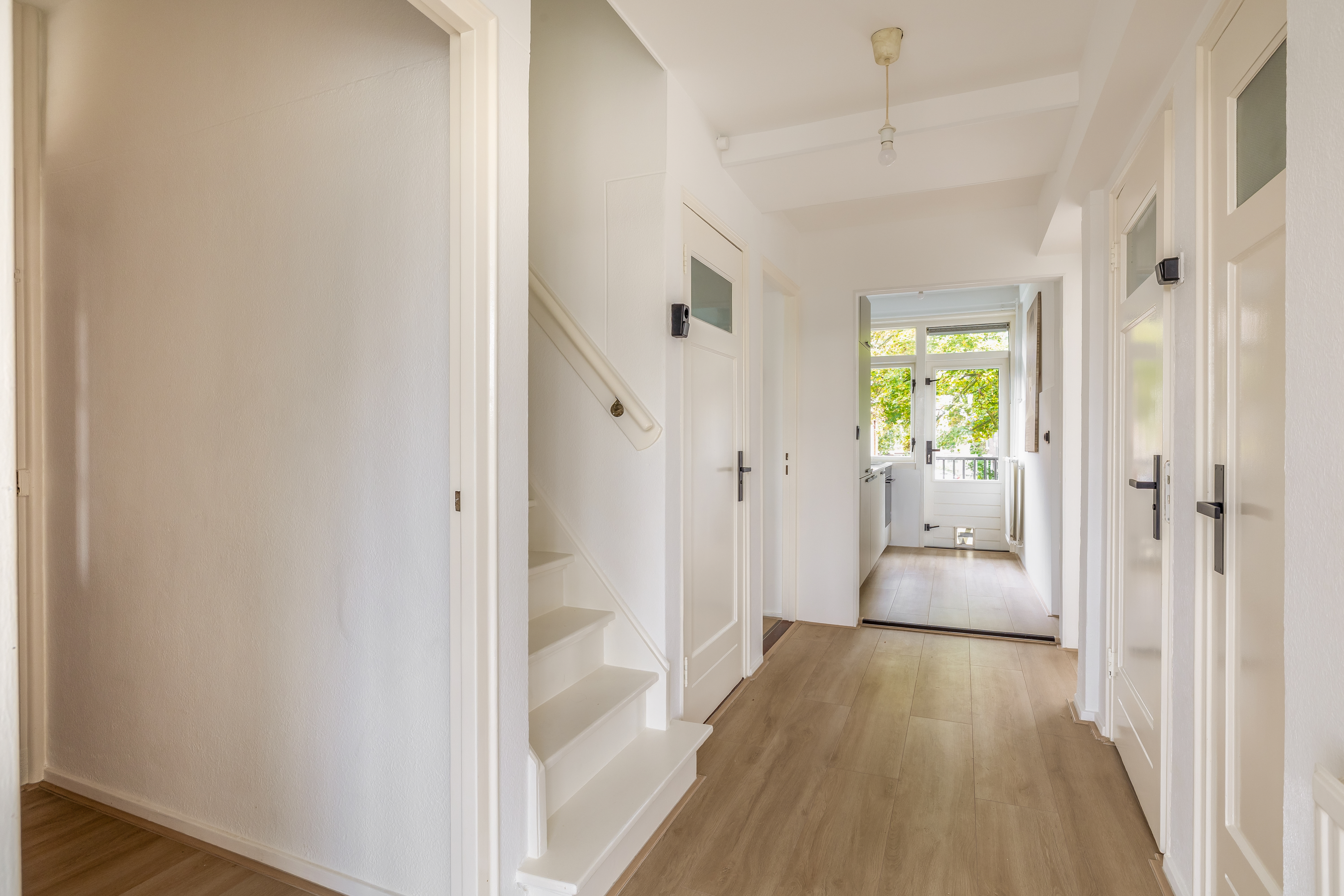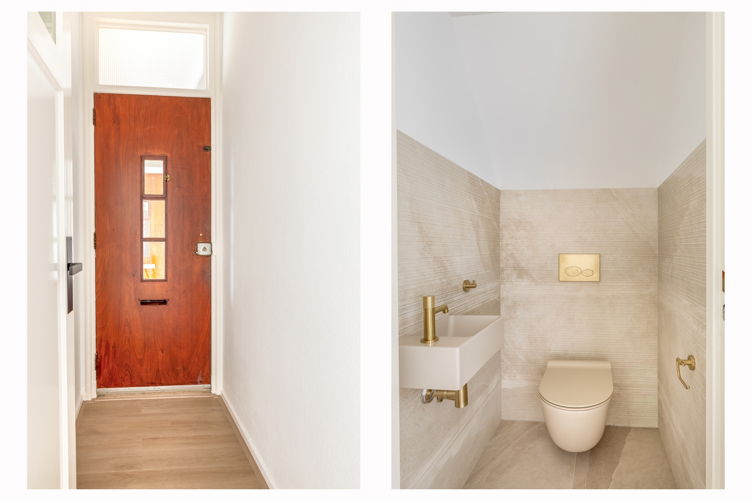 Via de entree kom je in de ruime hal. De hal is voorzien van de meterkast, toiletruimte, trapopgang naar de 2e verdieping en geeft toegang tot alle vertrekken. De toiletruimte is half betegeld in een beige kleurstelling met messing details en is voorzien van een zwevend toilet met fonteintje.