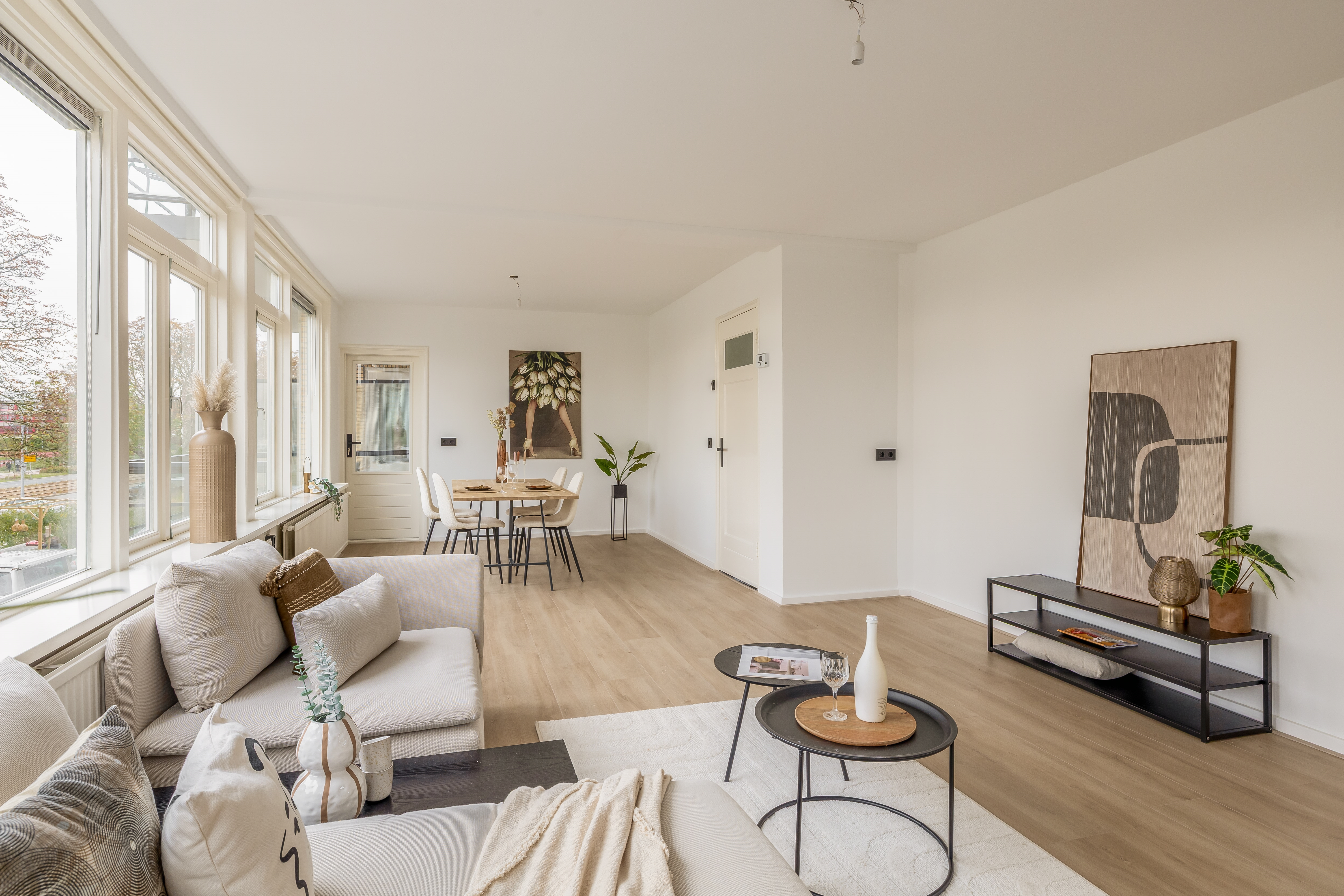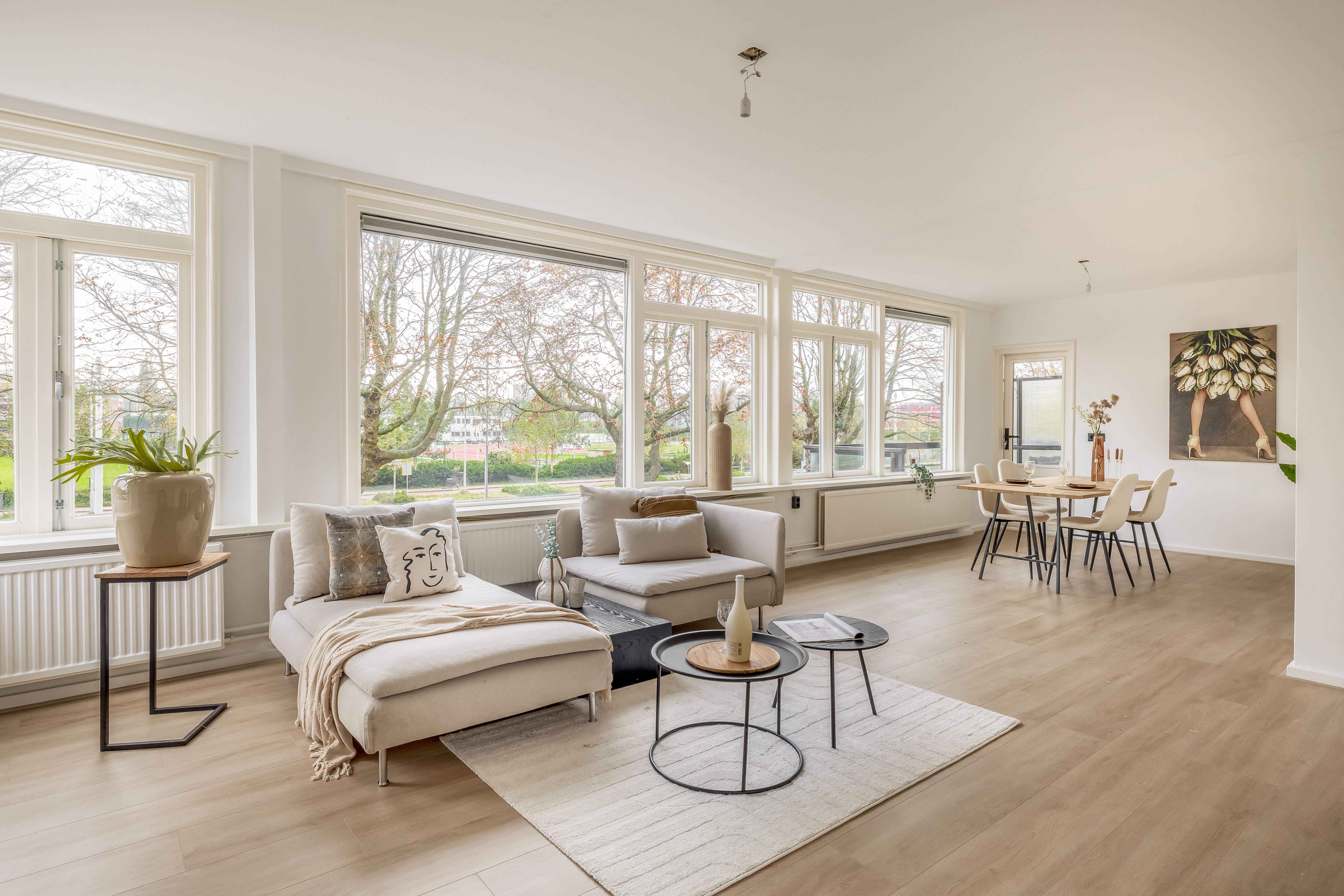 De woonkamer is heerlijk ruim en licht van opzet door de hoekligging van het appartement. De woonkamer is eenvoudig in te delen in een woon- en eetgedeelte en geeft toegang tot het balkon aan de voorzijde.