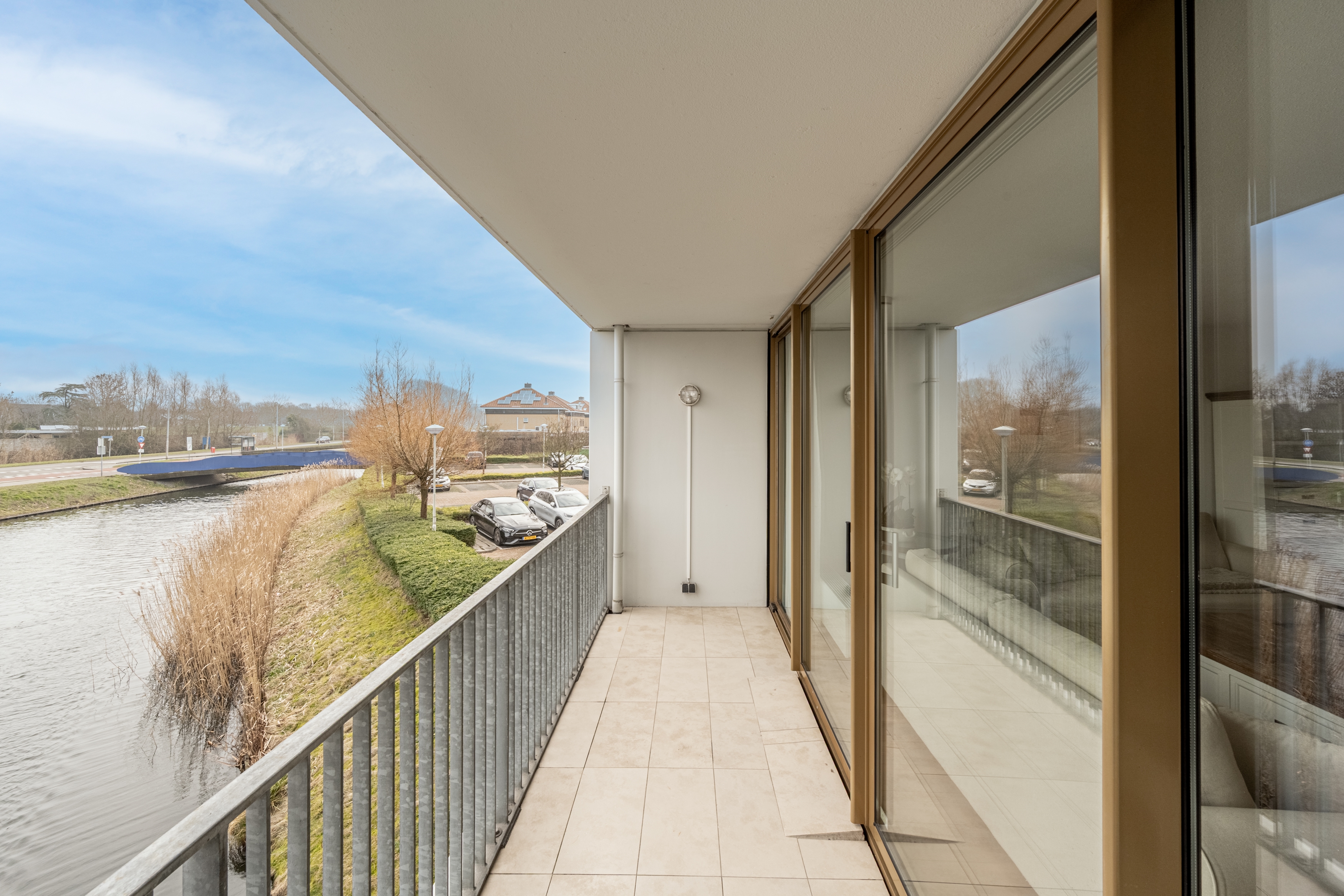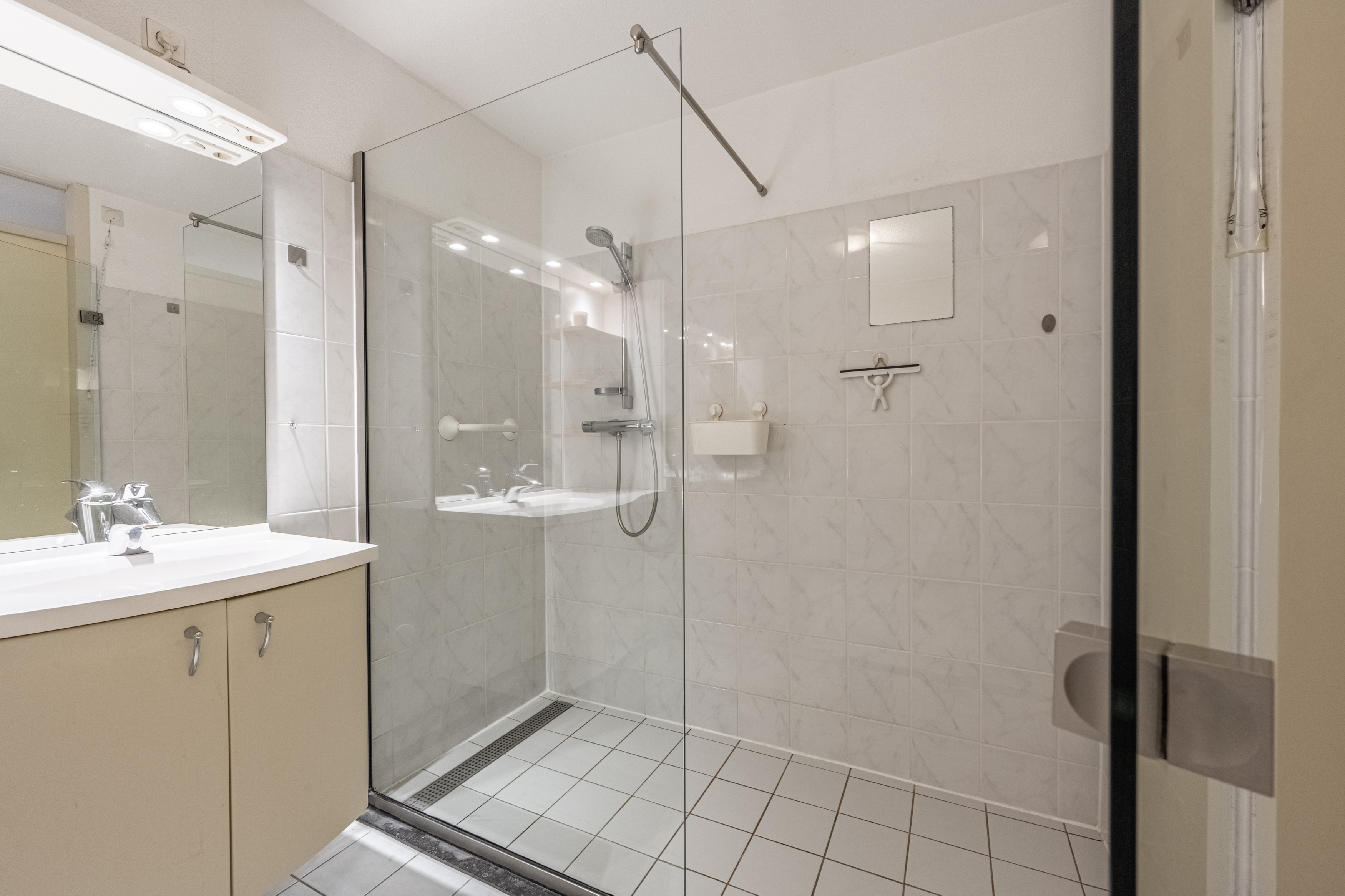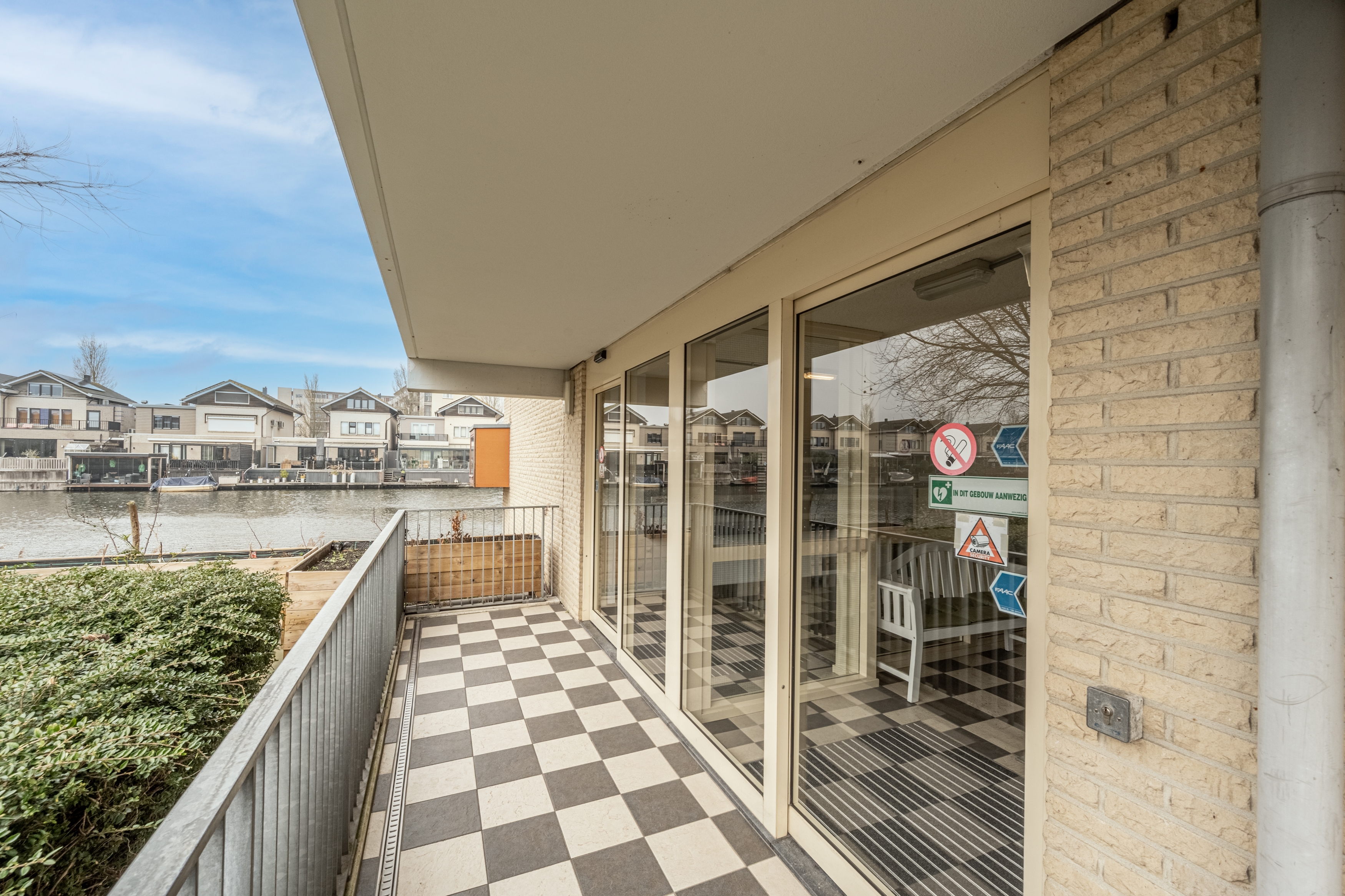 Aan de galerijzijde bevindt zich de ruime slaapkamer met een vaste kastenwand, ideaal voor al je kleding en spullen. De badkamer is geheel betegeld en voorzien van een inloopdouche, toilet en wastafelmeubel.