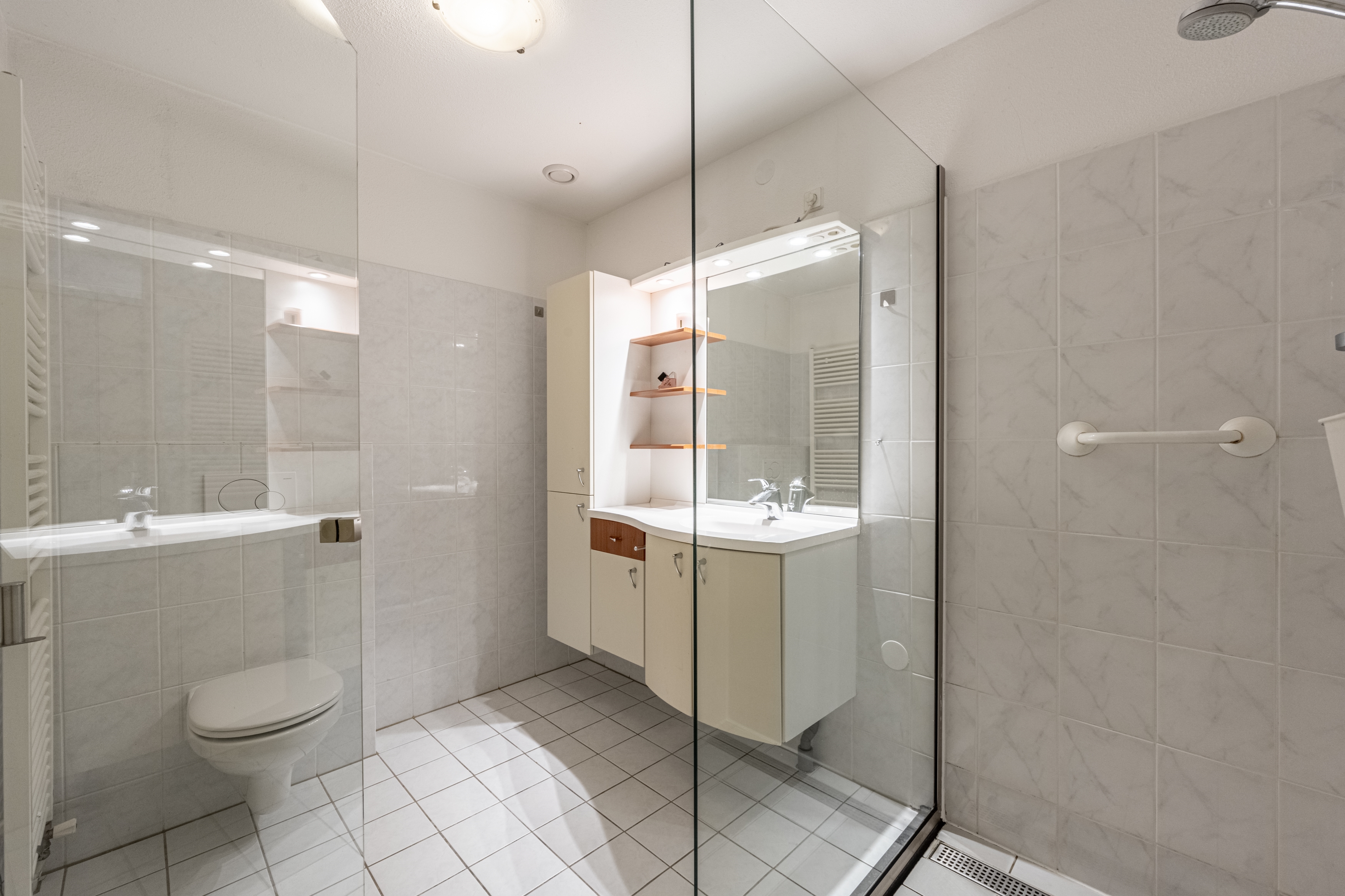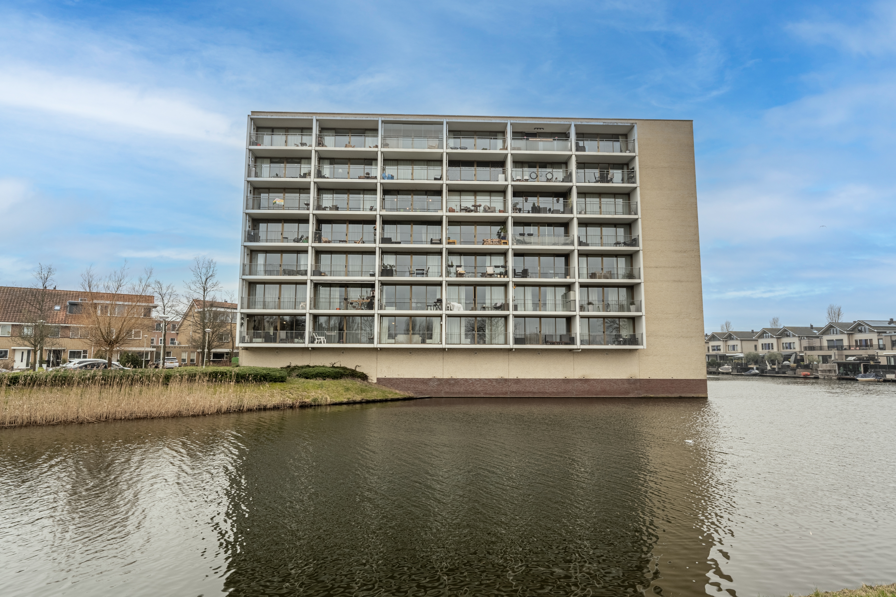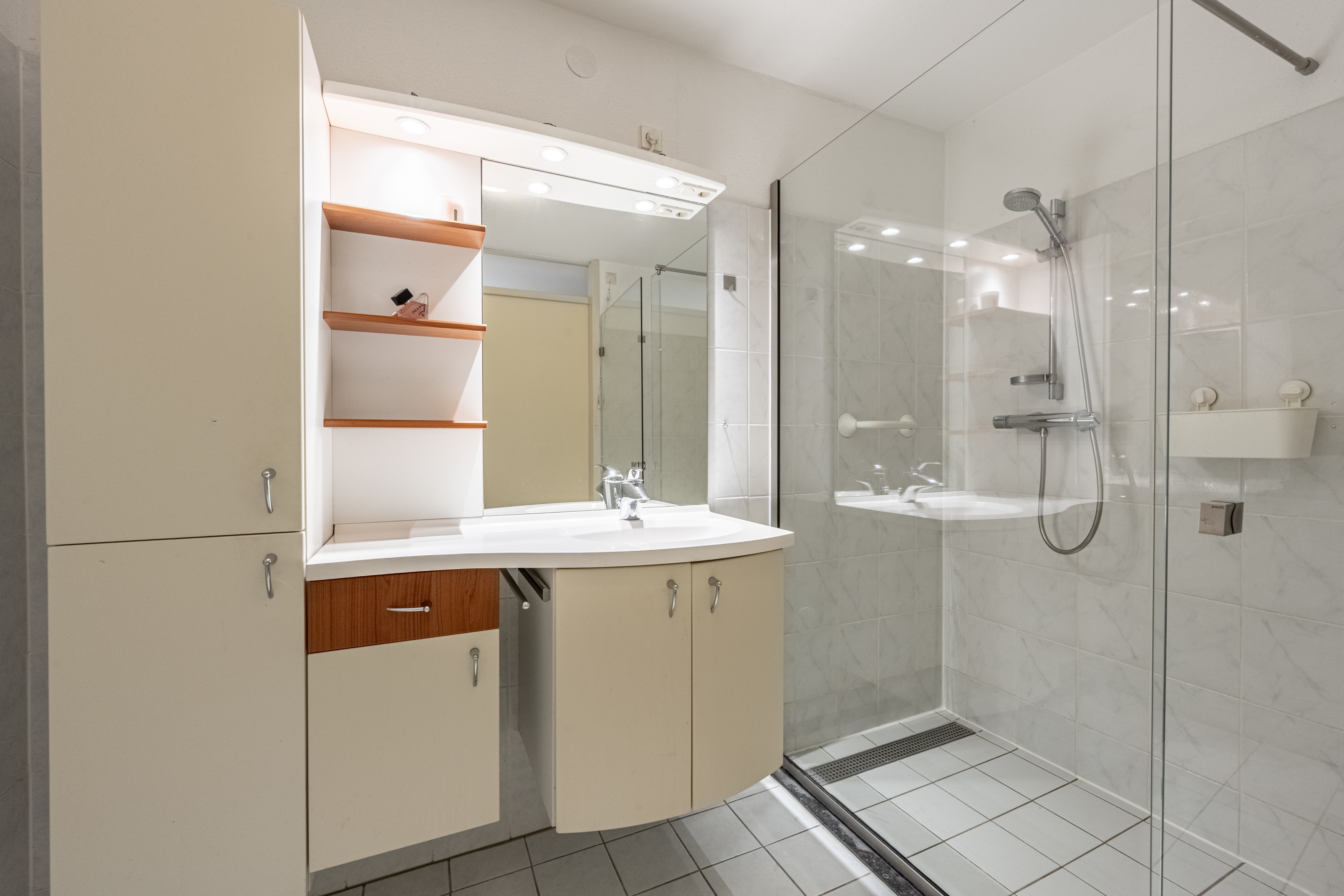 Aan de galerijzijde bevindt zich de ruime slaapkamer met een vaste kastenwand, ideaal voor al je kleding en spullen. De badkamer is geheel betegeld en voorzien van een inloopdouche, toilet en wastafelmeubel.
