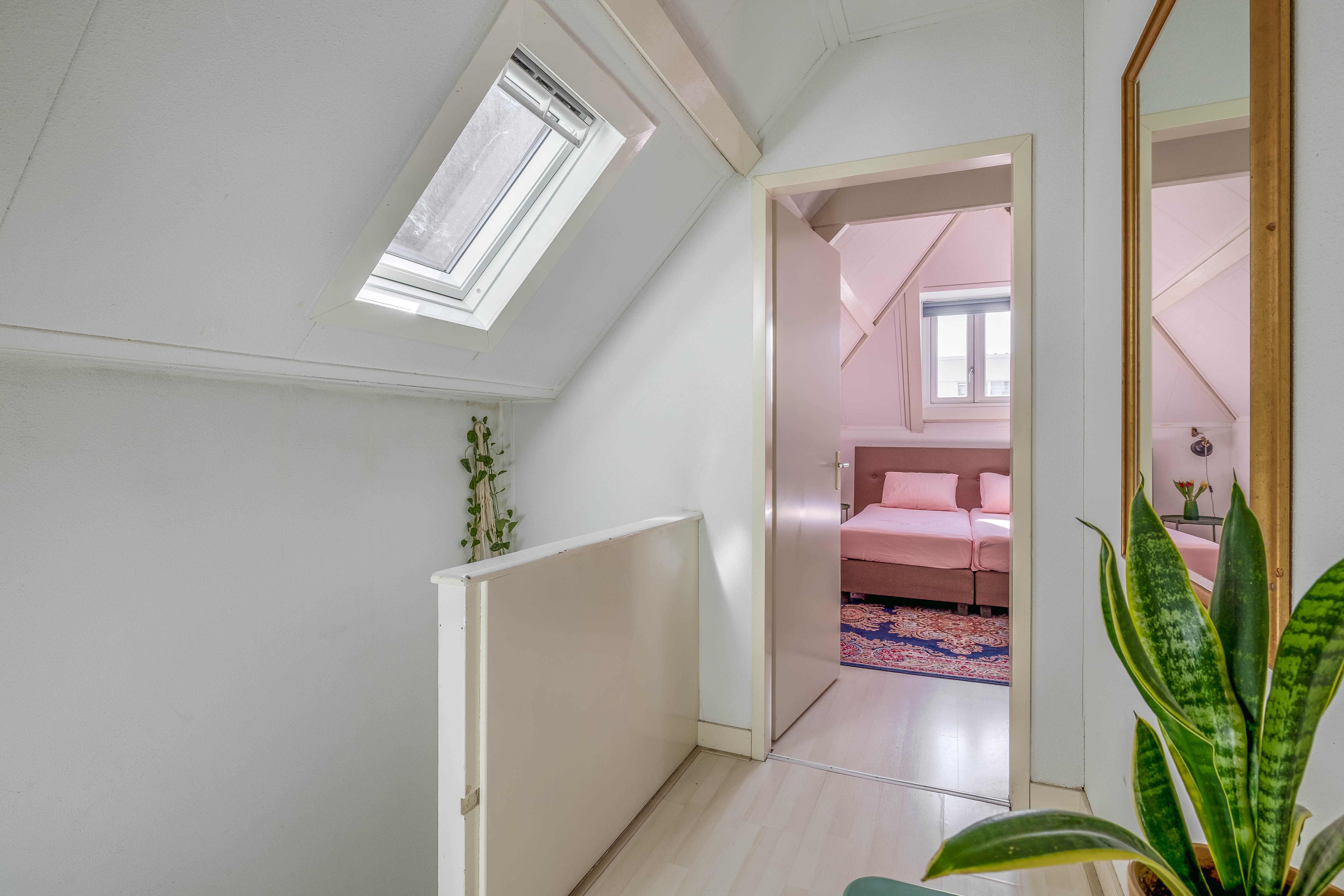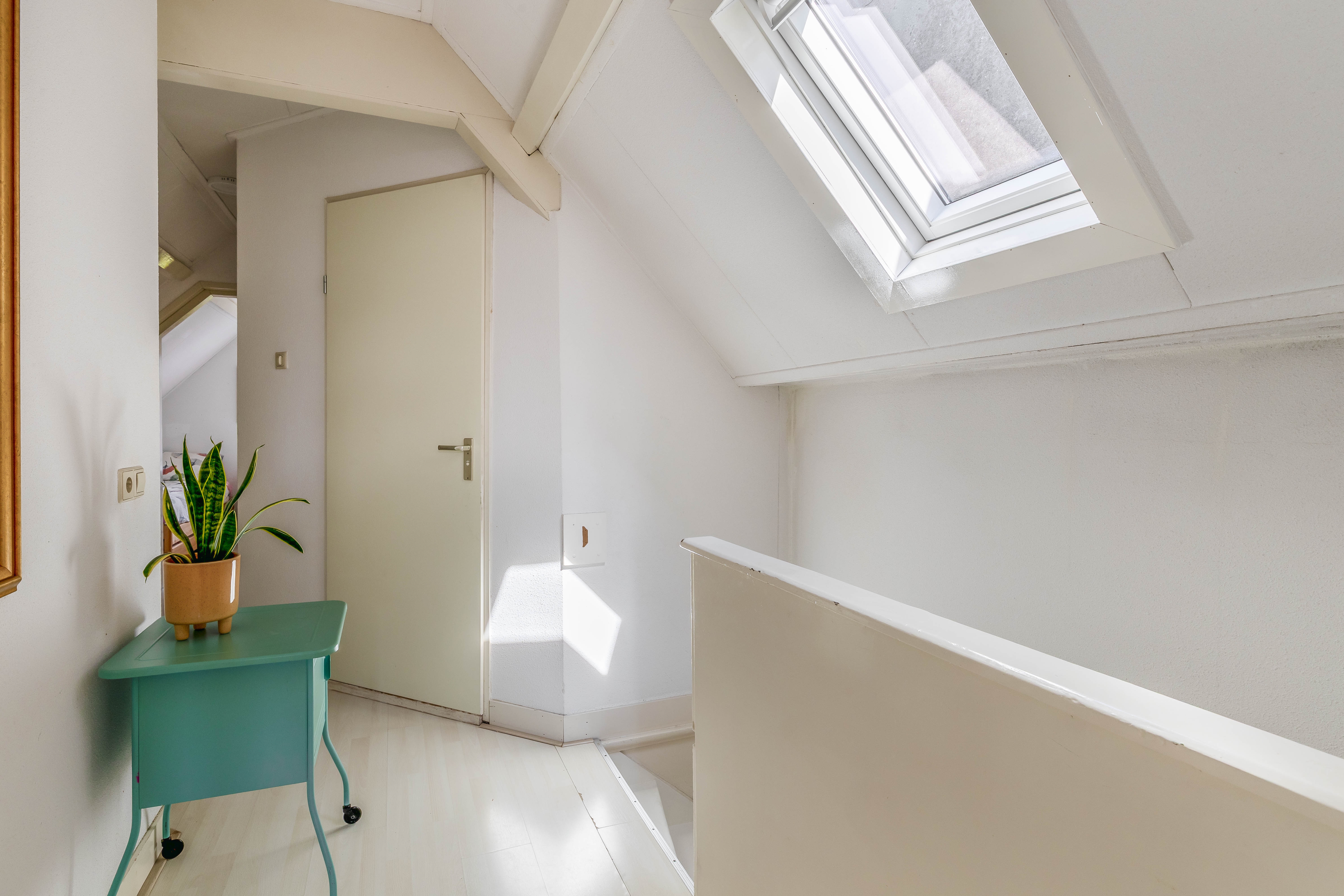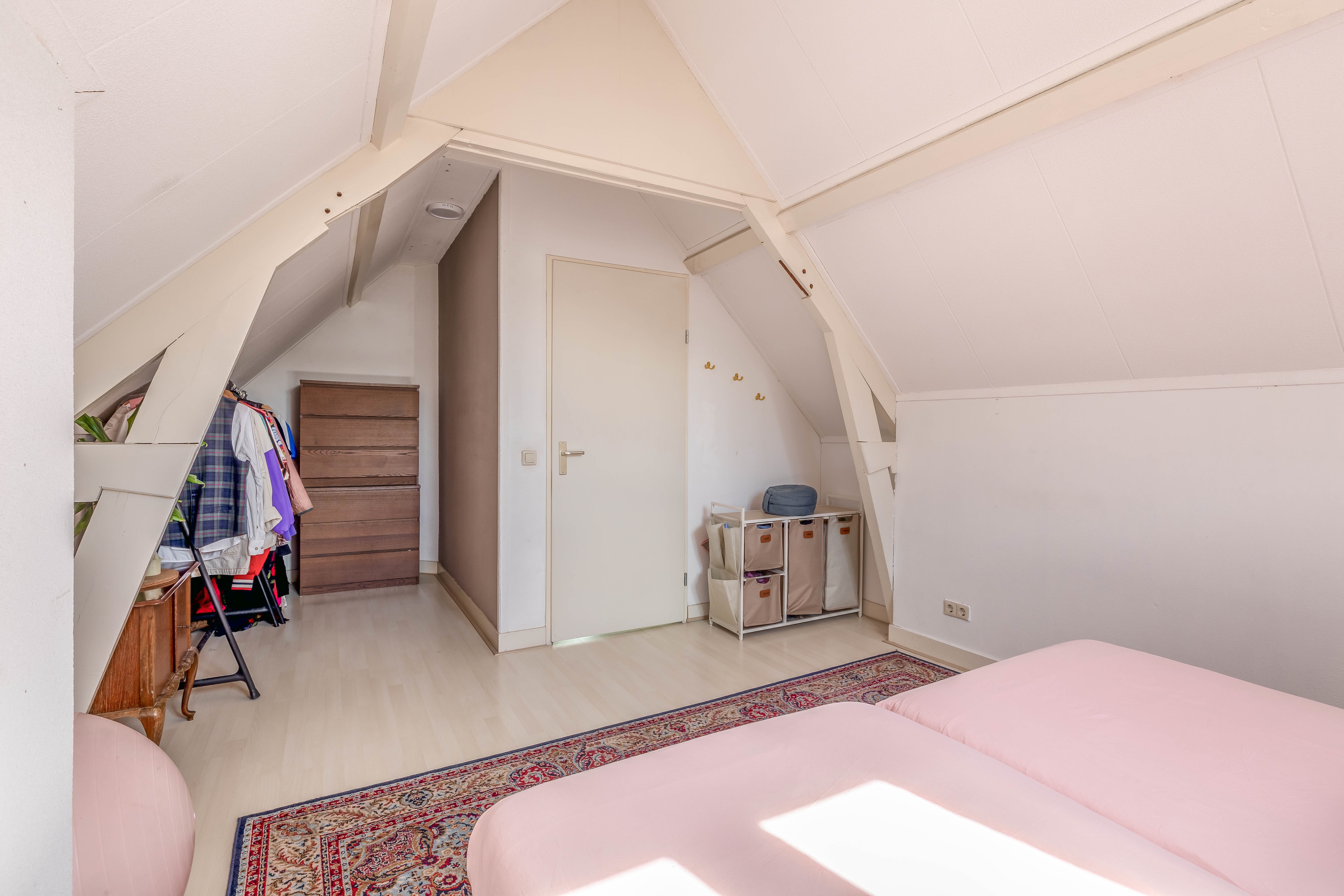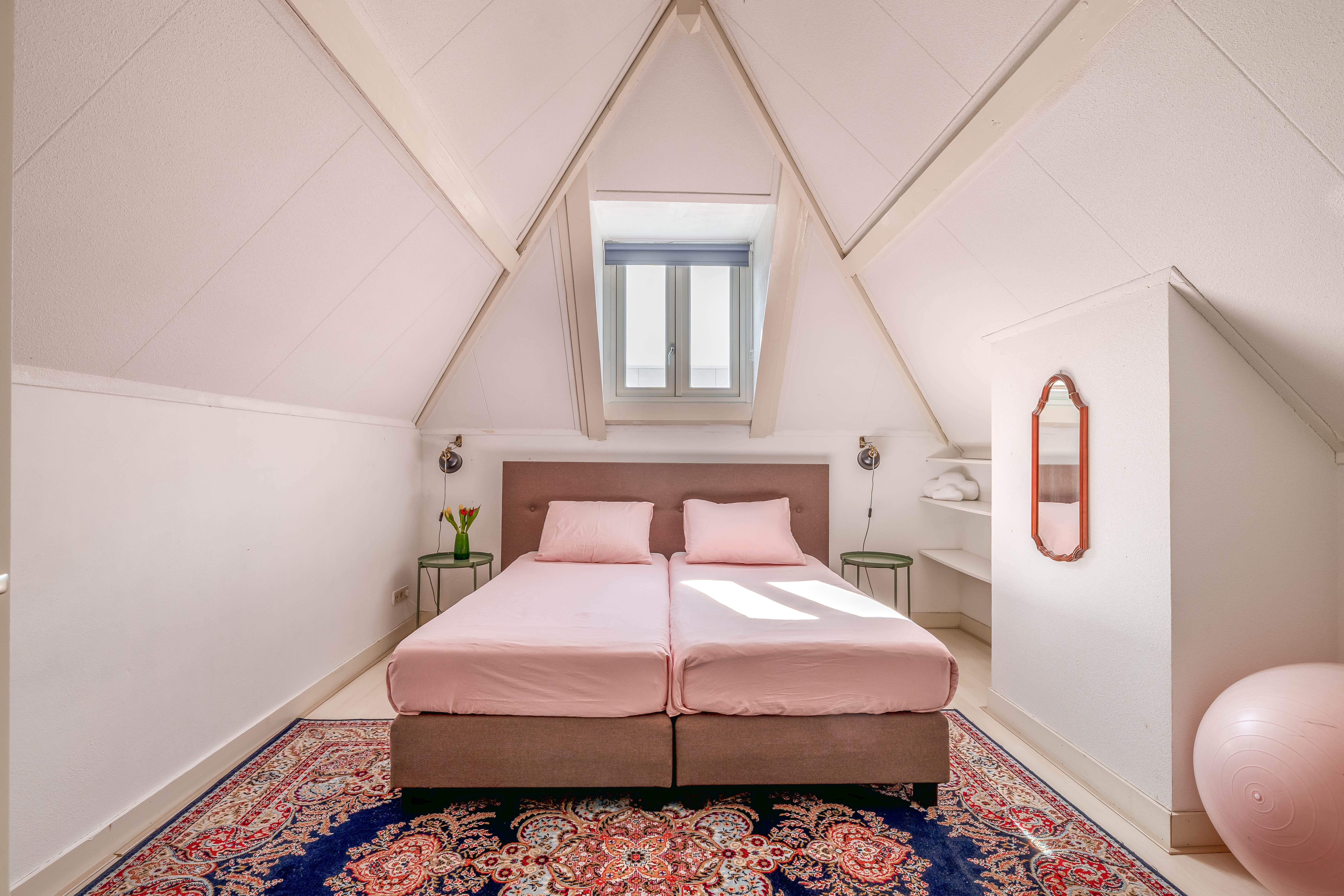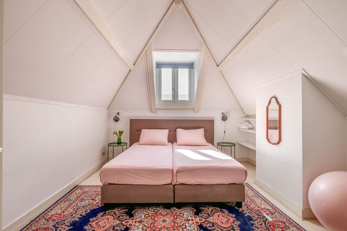The top floor features two pleasant bedrooms, each with its own charm. The master bedroom is a real eye-catcher: the characteristic beams, the height up to the ridge, and the warm feel of the roof structure give this room a calming, almost loft-like atmosphere—an ideal retreat.
