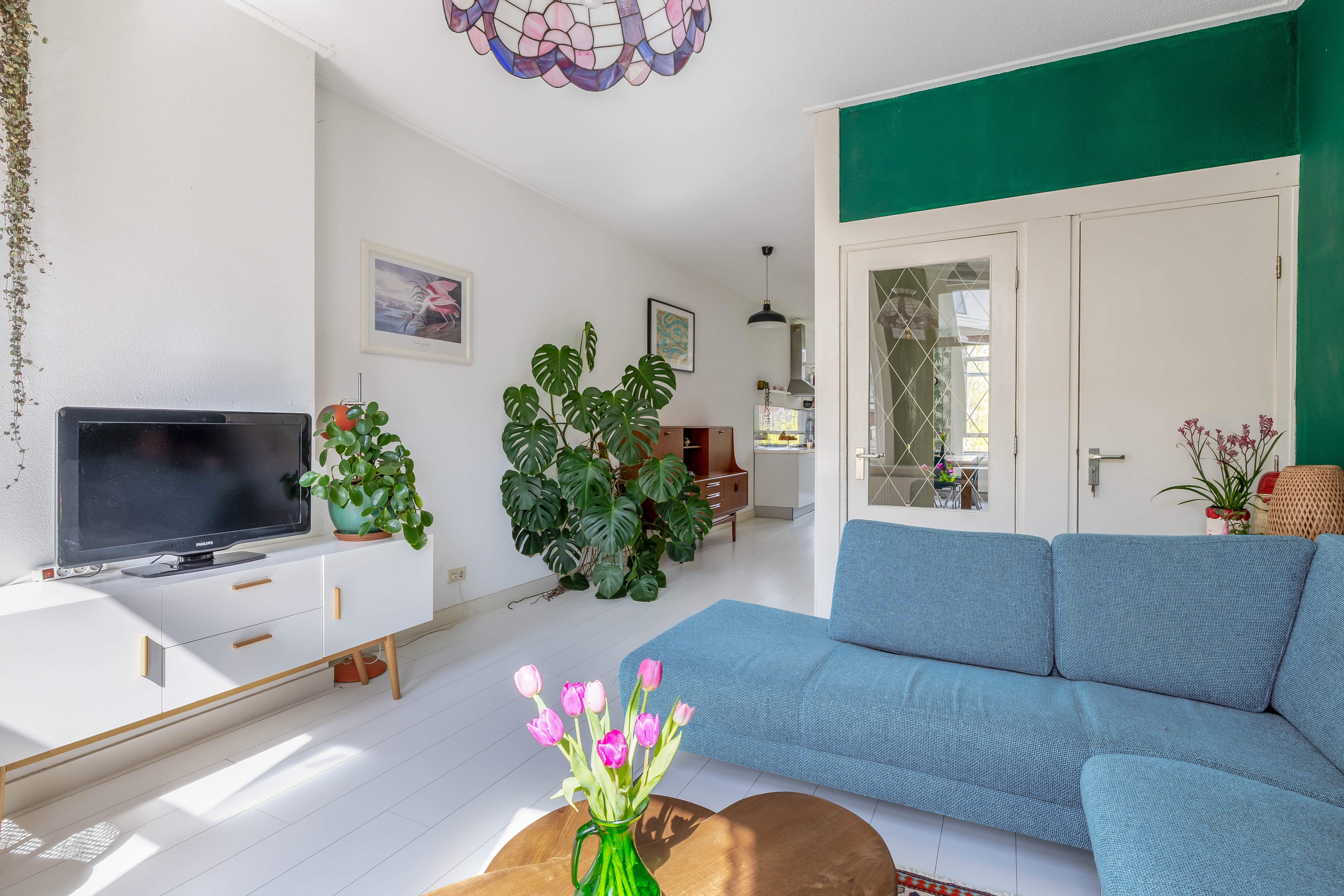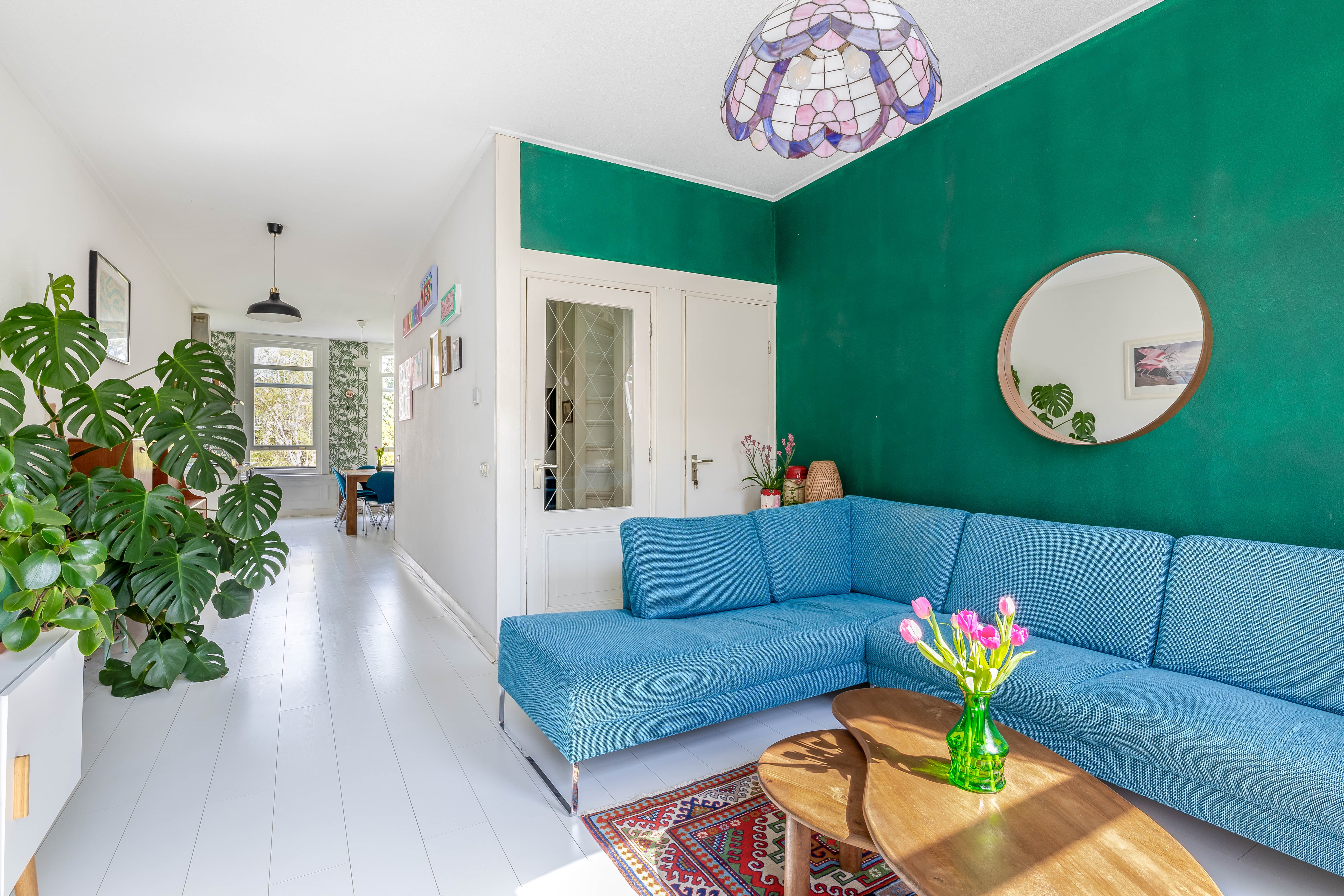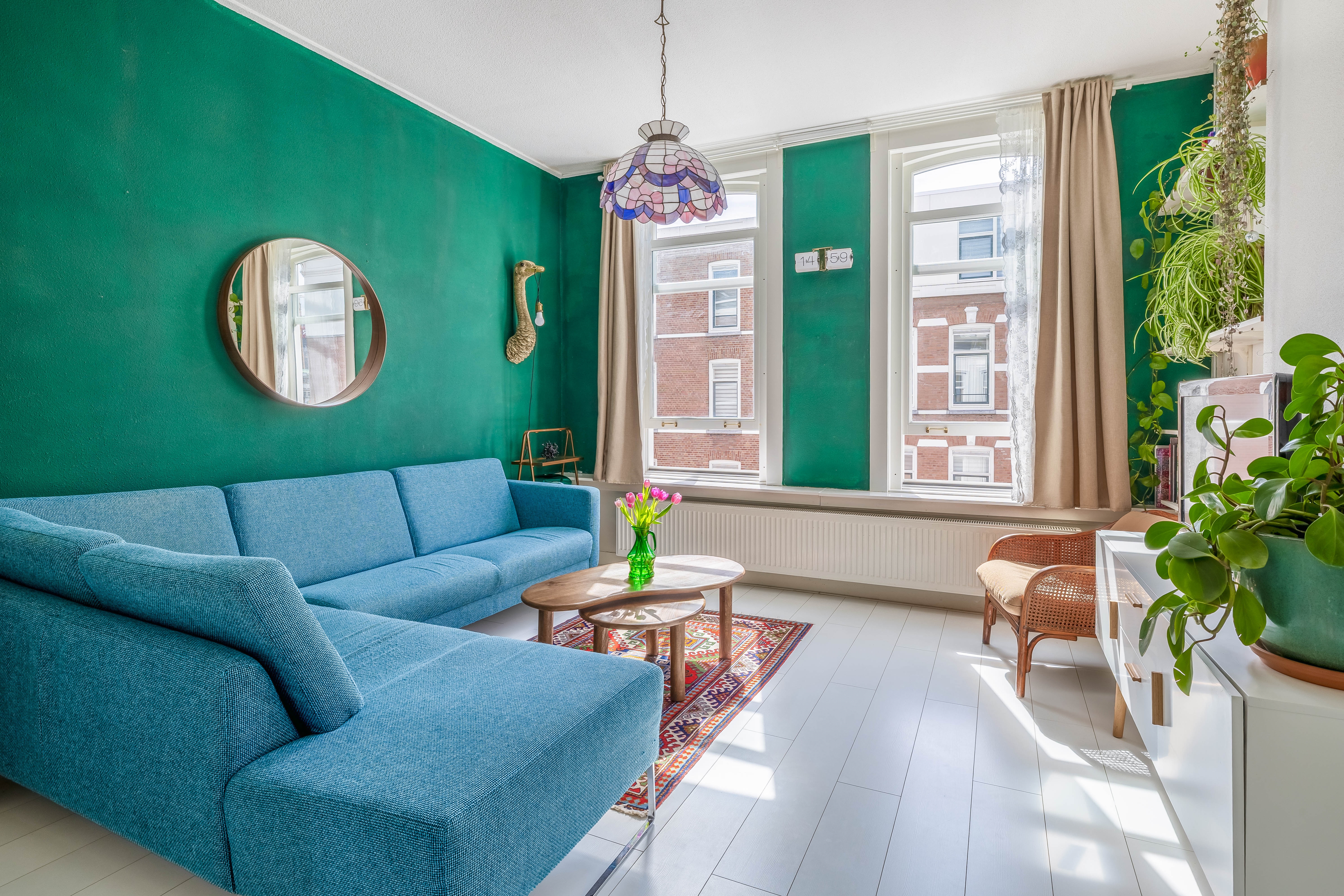 4. Ruime, lichte woonkamer met hoge ramen;