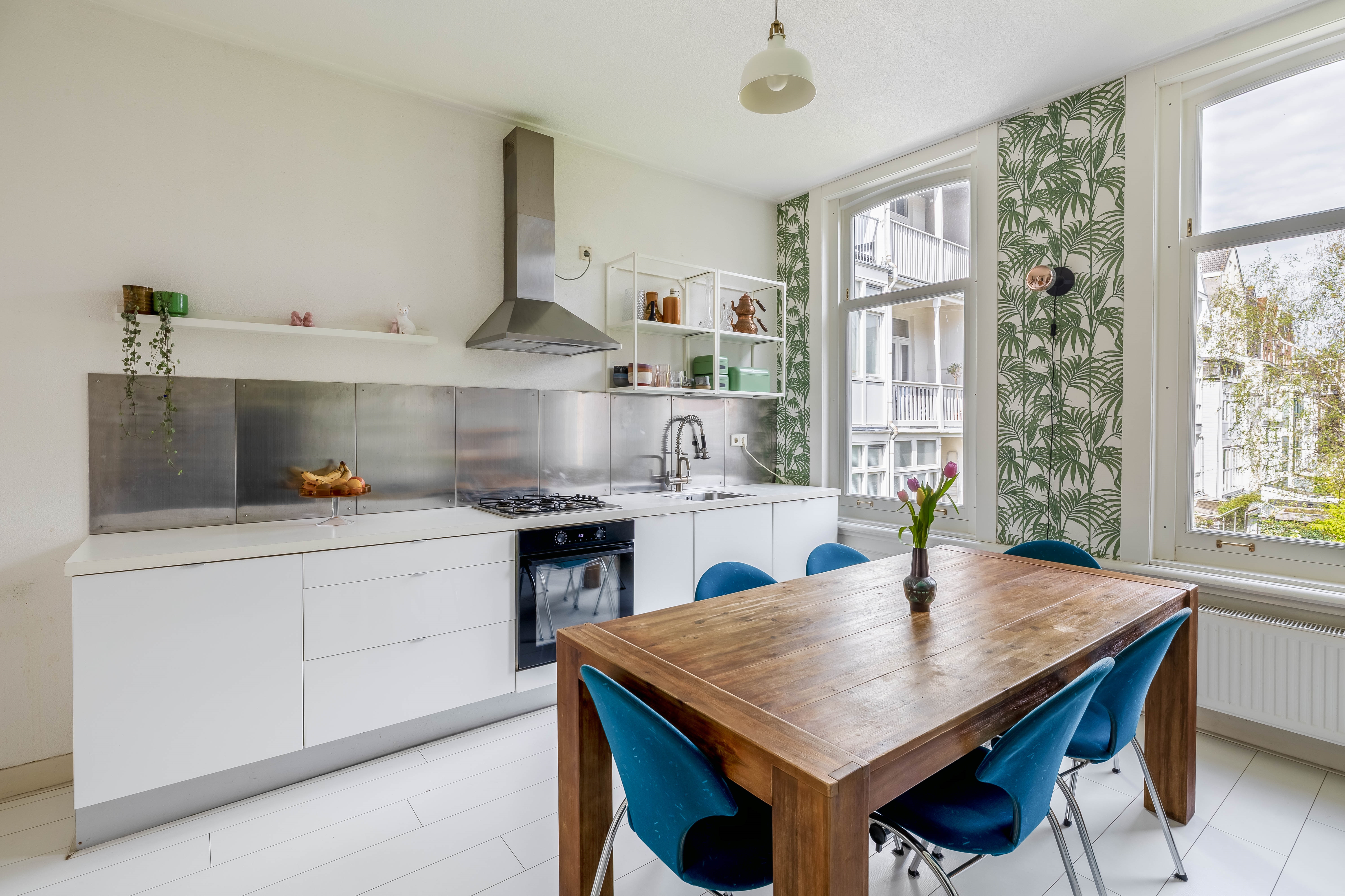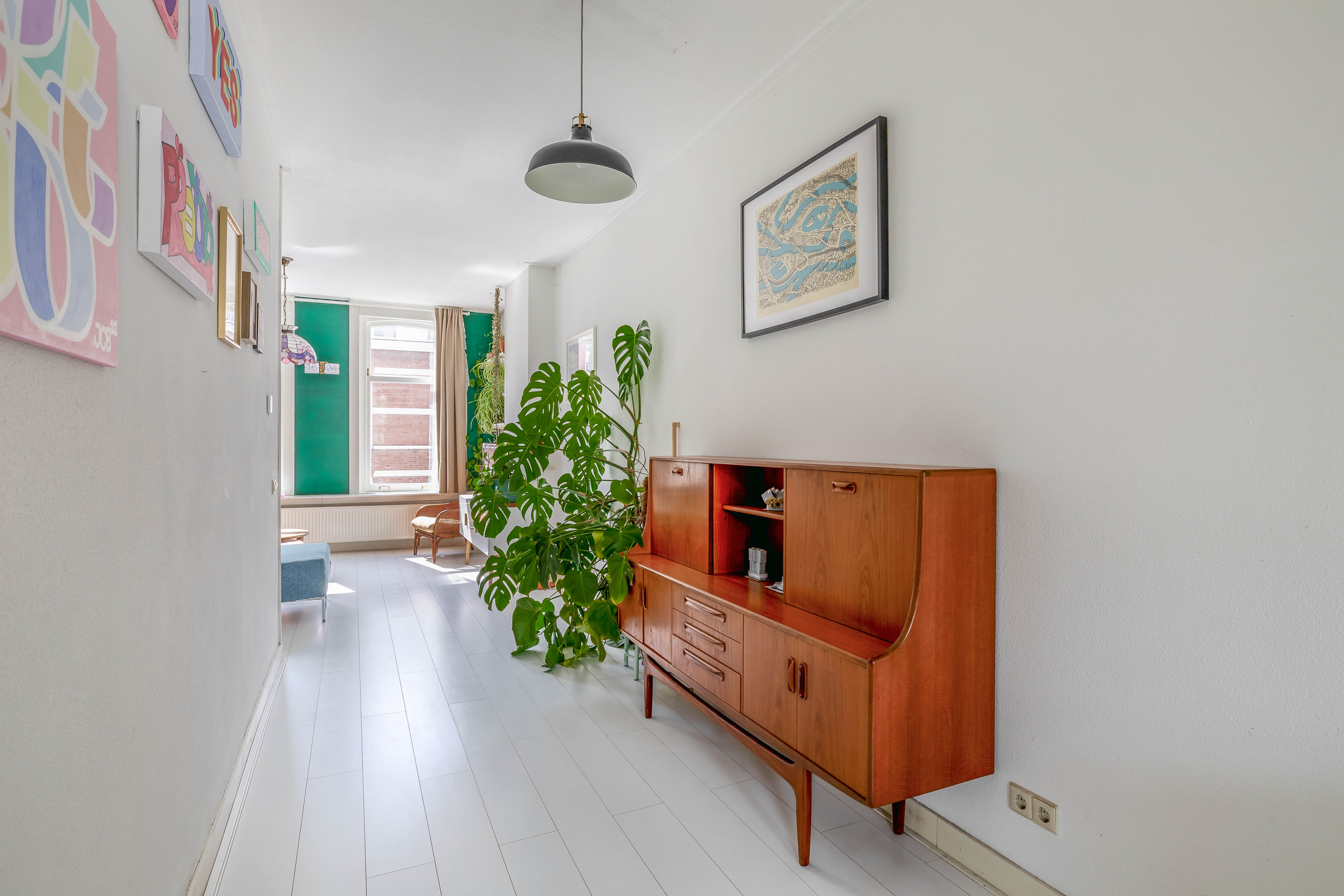 On the landing you’ll find the separate toilet and the staircase to the top floor. From the landing you enter the bright and inviting living room at the front of the property. Thanks to the high windows, daylight flows in abundantly, giving the room an open and pleasant feel. The attractive flooring and warm ambiance make this a space where you immediately feel at home—ideal for unwinding after a busy day.
