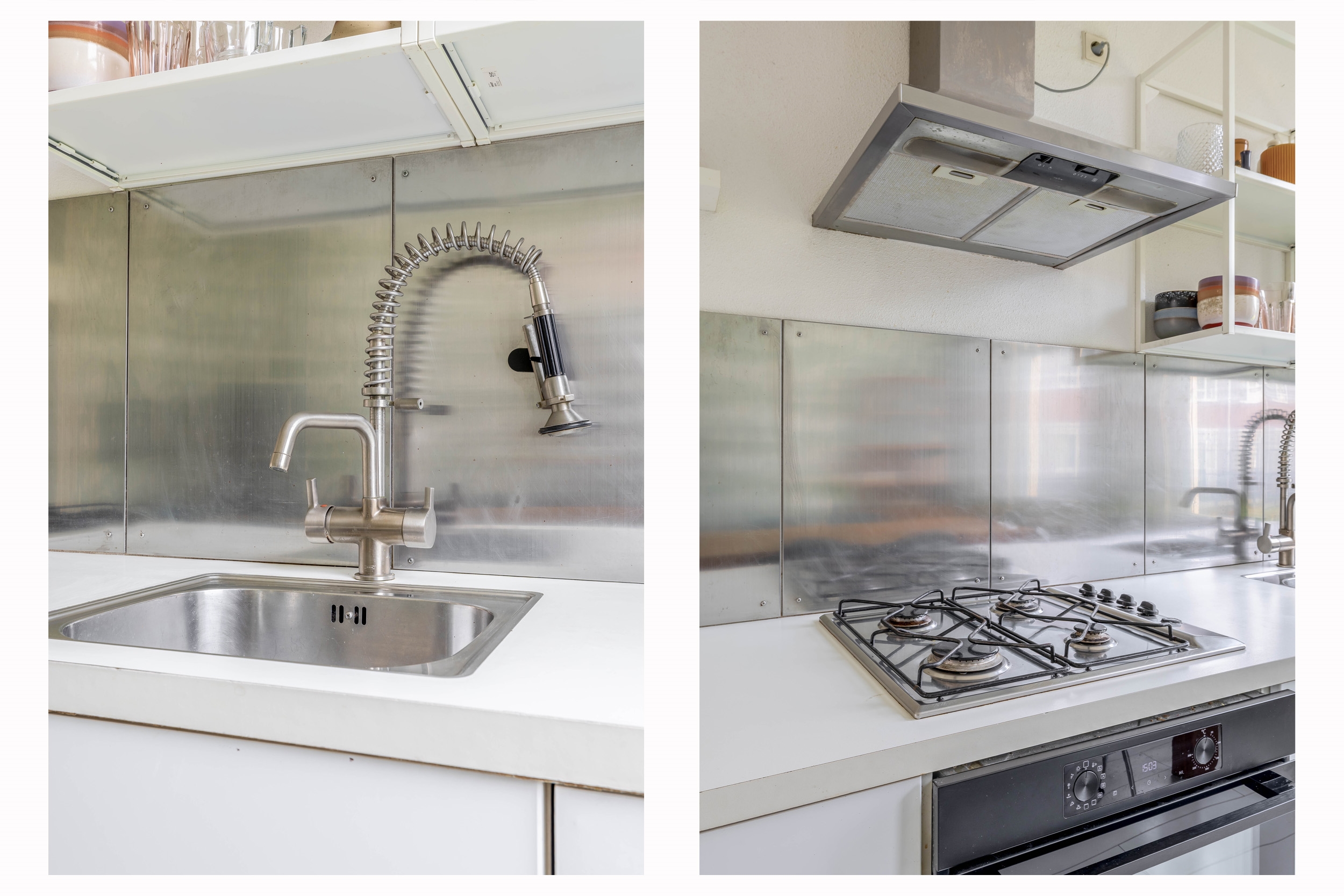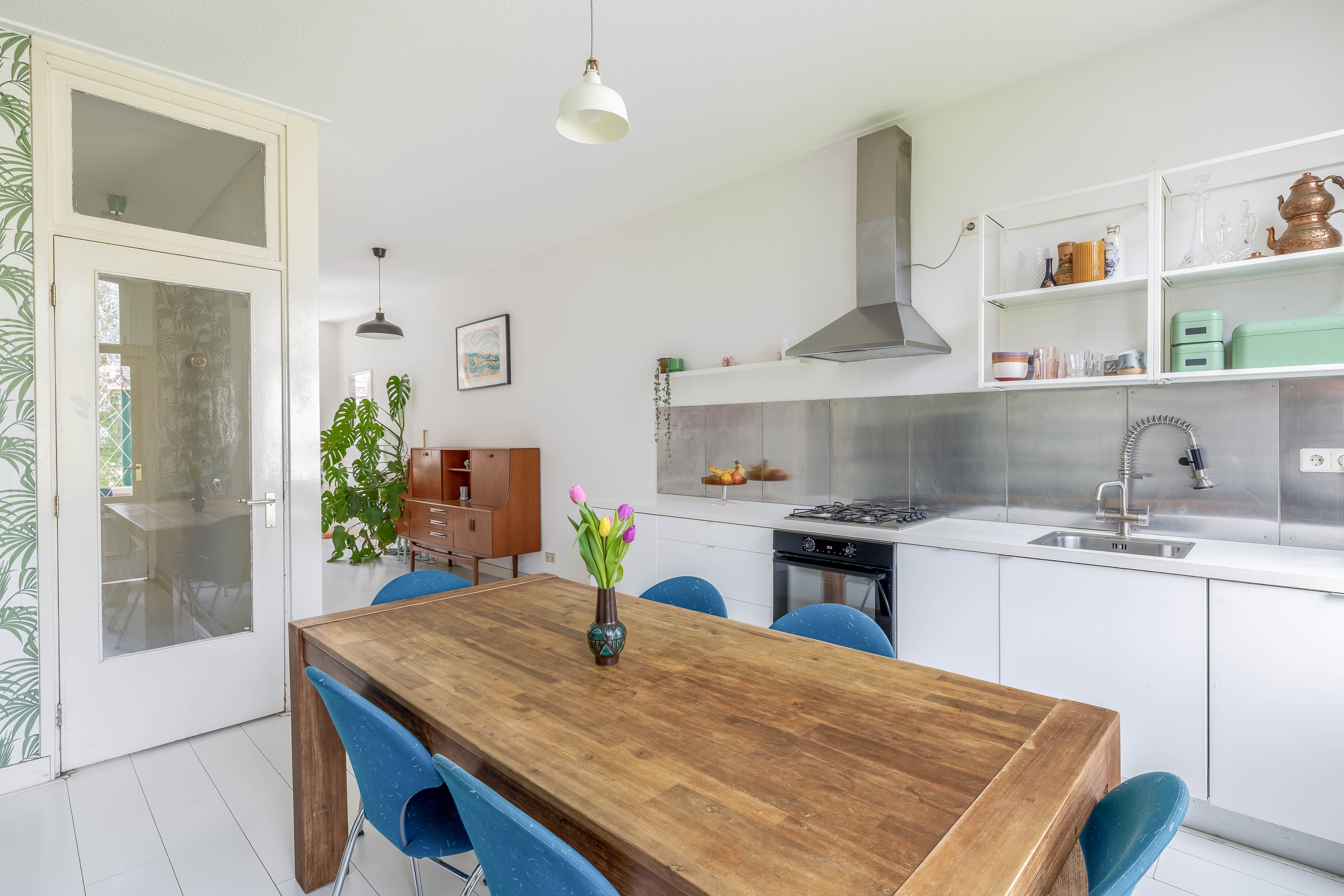 Aan de achterzijde van de woning bevindt zich de ruime eetkeuken. Dit is werkelijk een heerlijke leefruimte waar koken, tafelen en gezellig samen zijn centraal staan. Door de royale lichtinval en de mogelijkheid om een grote eettafel te plaatsen, voelt deze keuken als het hart van de woning. De keuken is praktisch ingedeeld en voorzien van een afzuigkap, 4-pits gasstel, oven (geplaatst in 2024) vaatwasser (vernieuwd in 2025) en losse koelkast. Hier geniet je van lange, gezellige avonden met vrienden of familie.