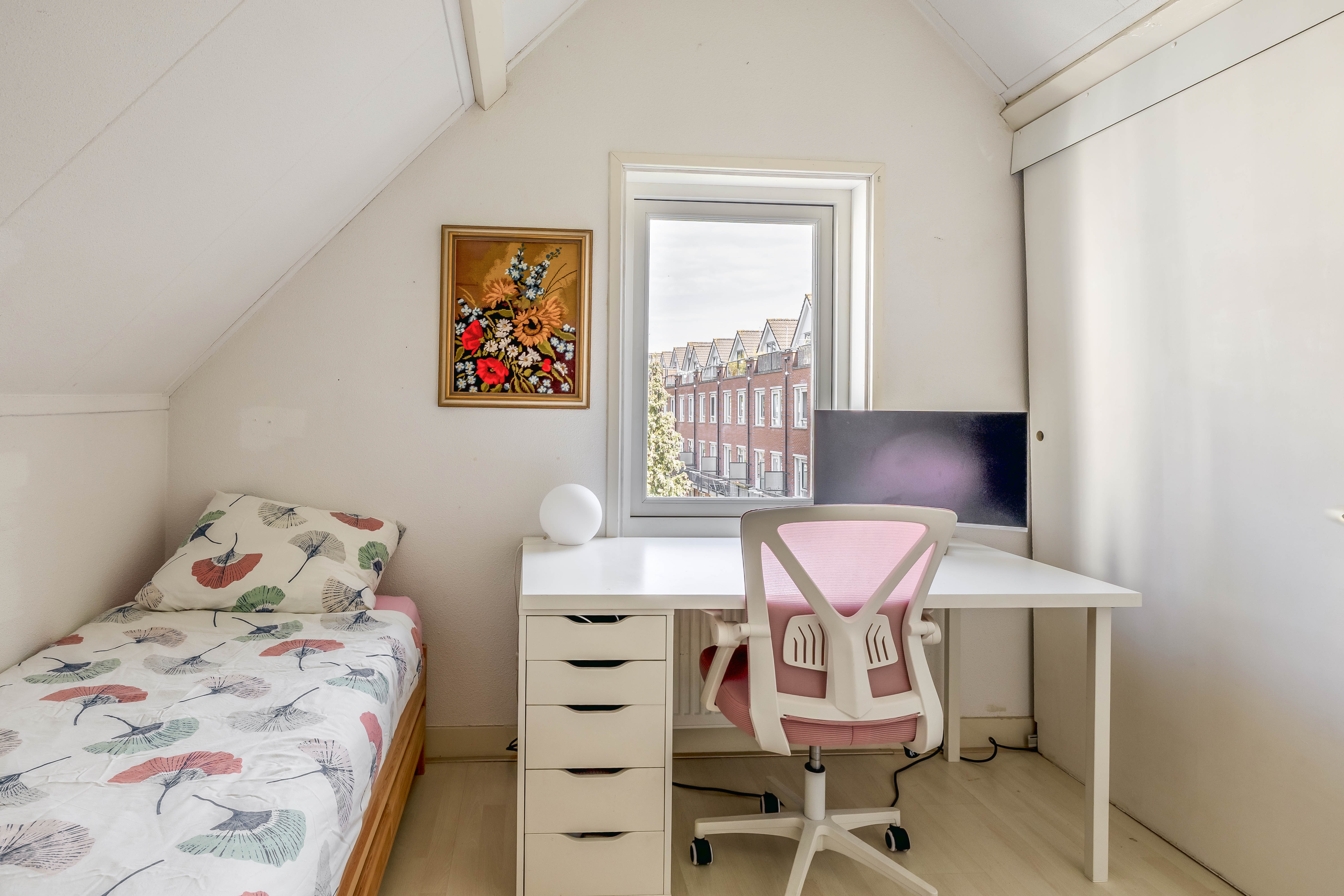 De tweede slaapkamer is een fijne, multifunctionele ruimte die perfect dienst kan doen als kinder-, werk- of logeerkamer. De praktische indeling biedt volop mogelijkheden. In de kamer is bovendien een handige bergkast aanwezig met de cv-ketel en witgoedaansluiting, ideaal voor extra opbergruimte en een efficiënte indeling.