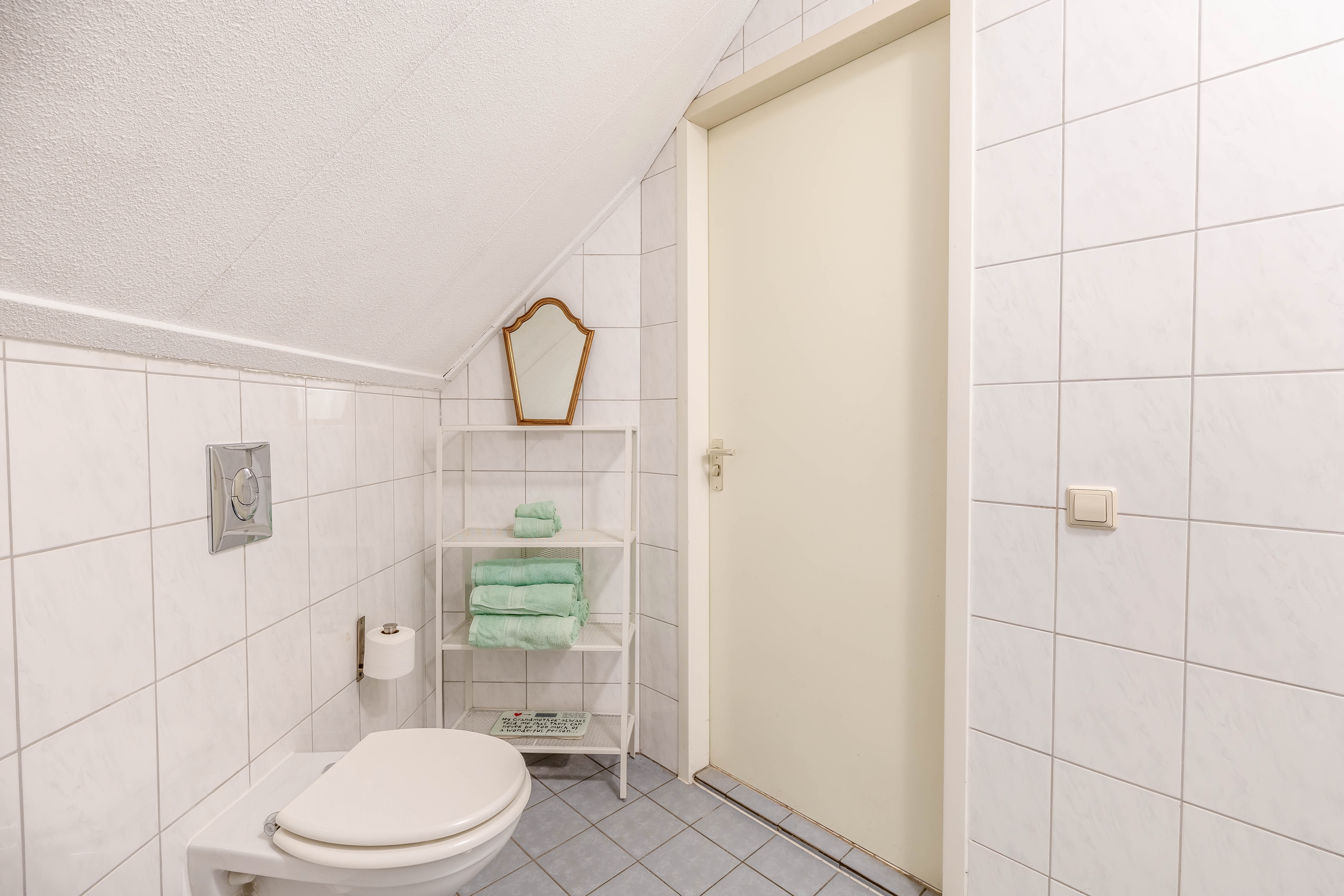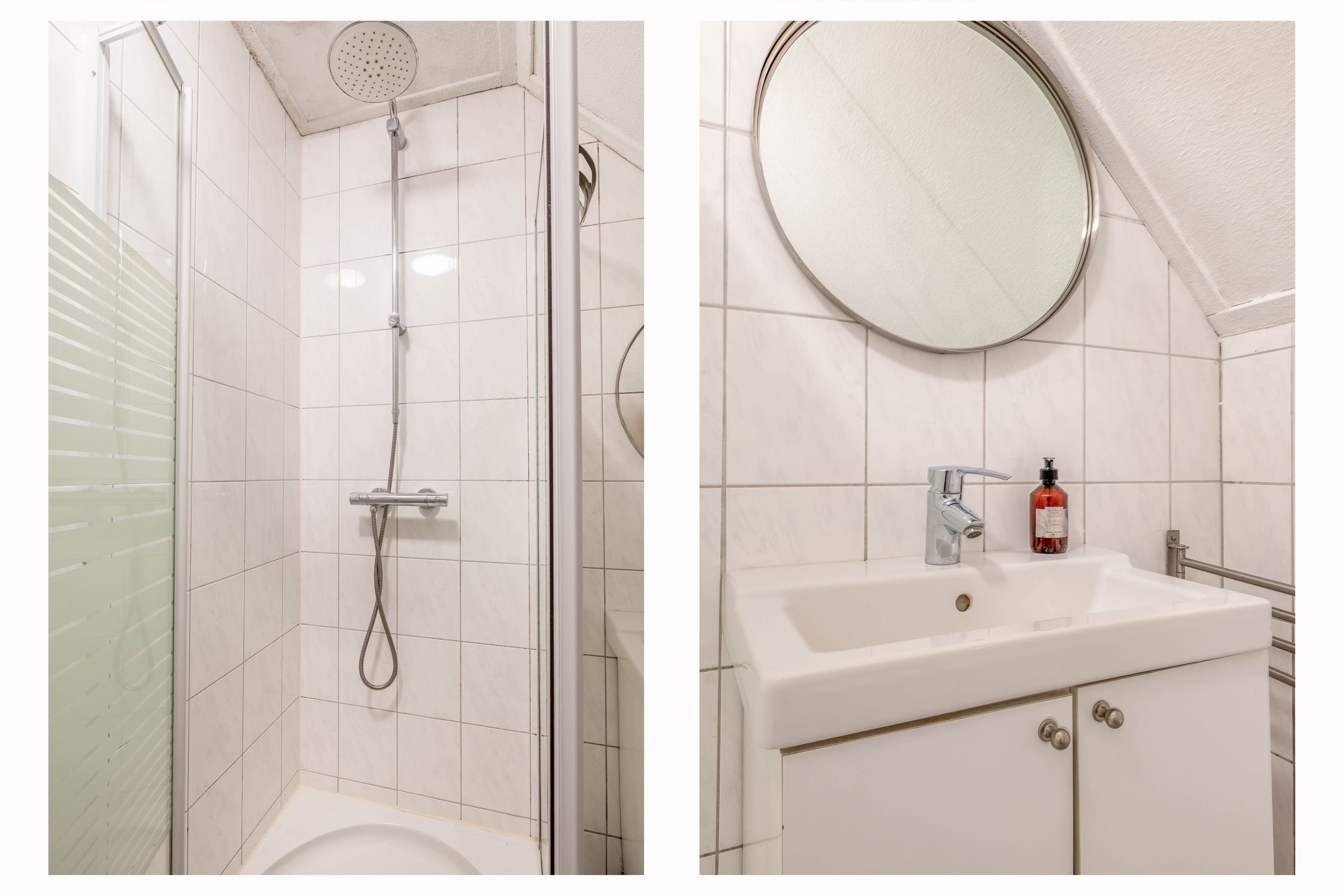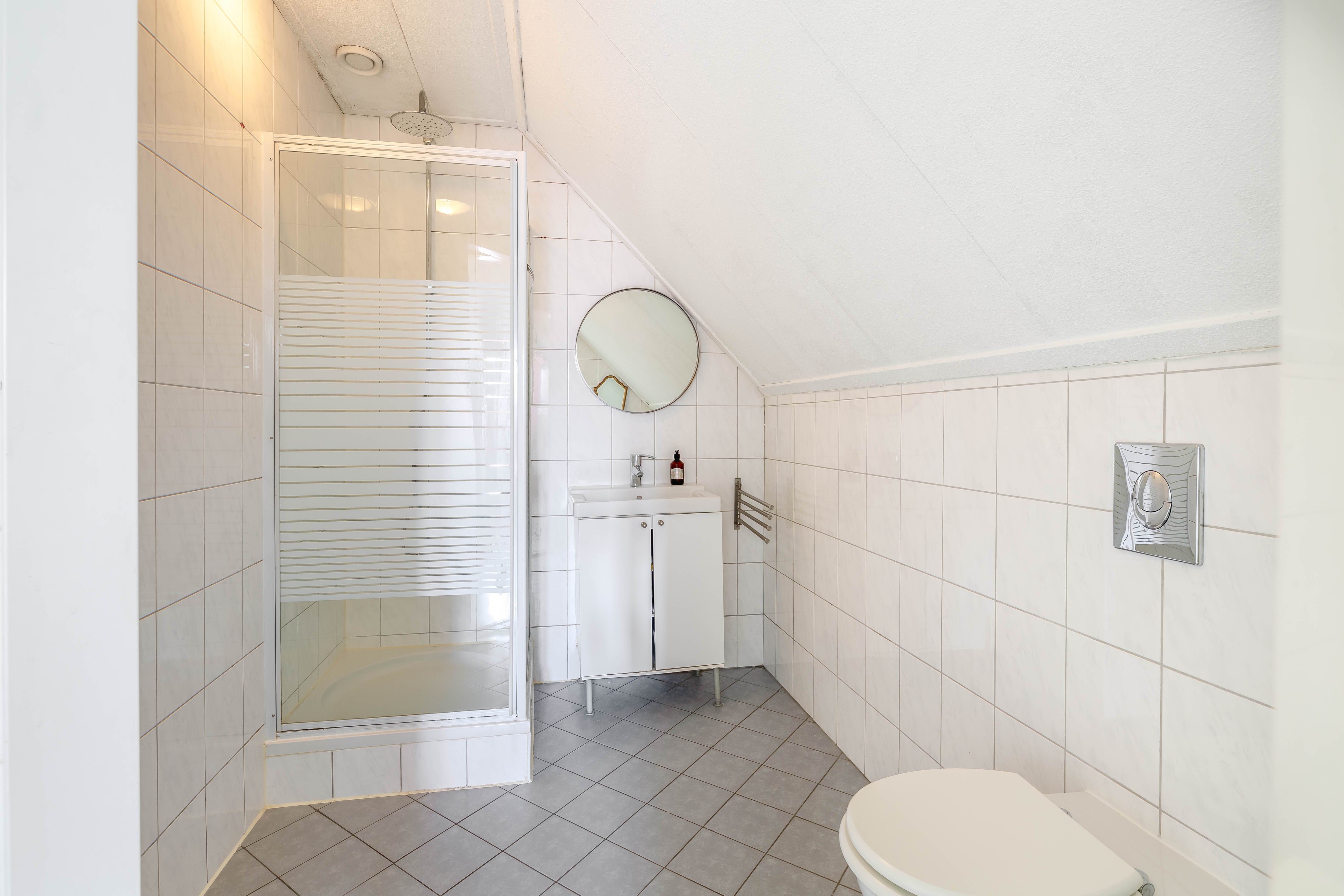 Op deze verdieping bevindt zich ook de badkamer. Deze is netjes en functioneel ingericht, voorzien van een douchecabine, een wastafelmeubel en een tweede toilet. Alles wat je nodig hebt voor een comfortabele start van de dag.