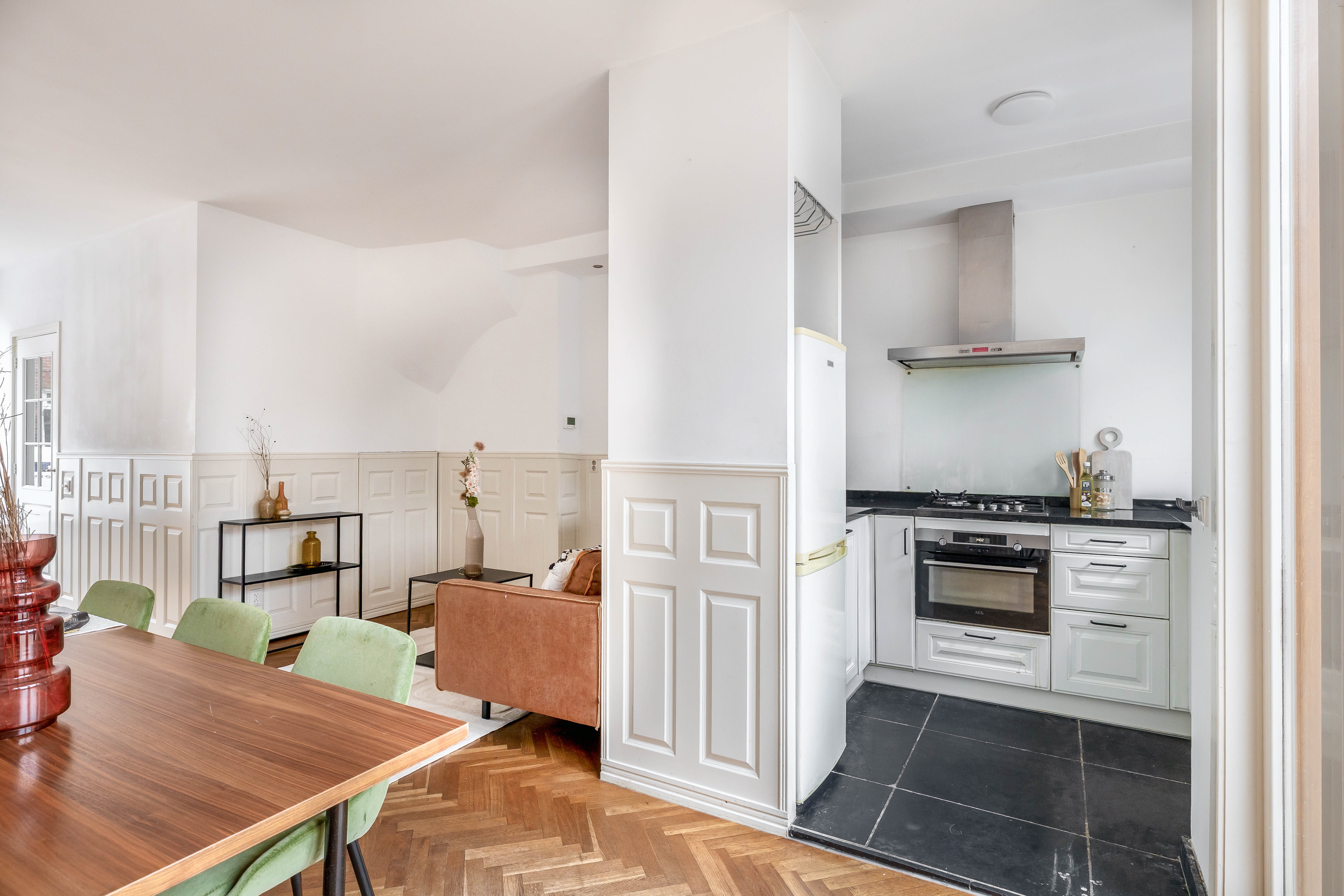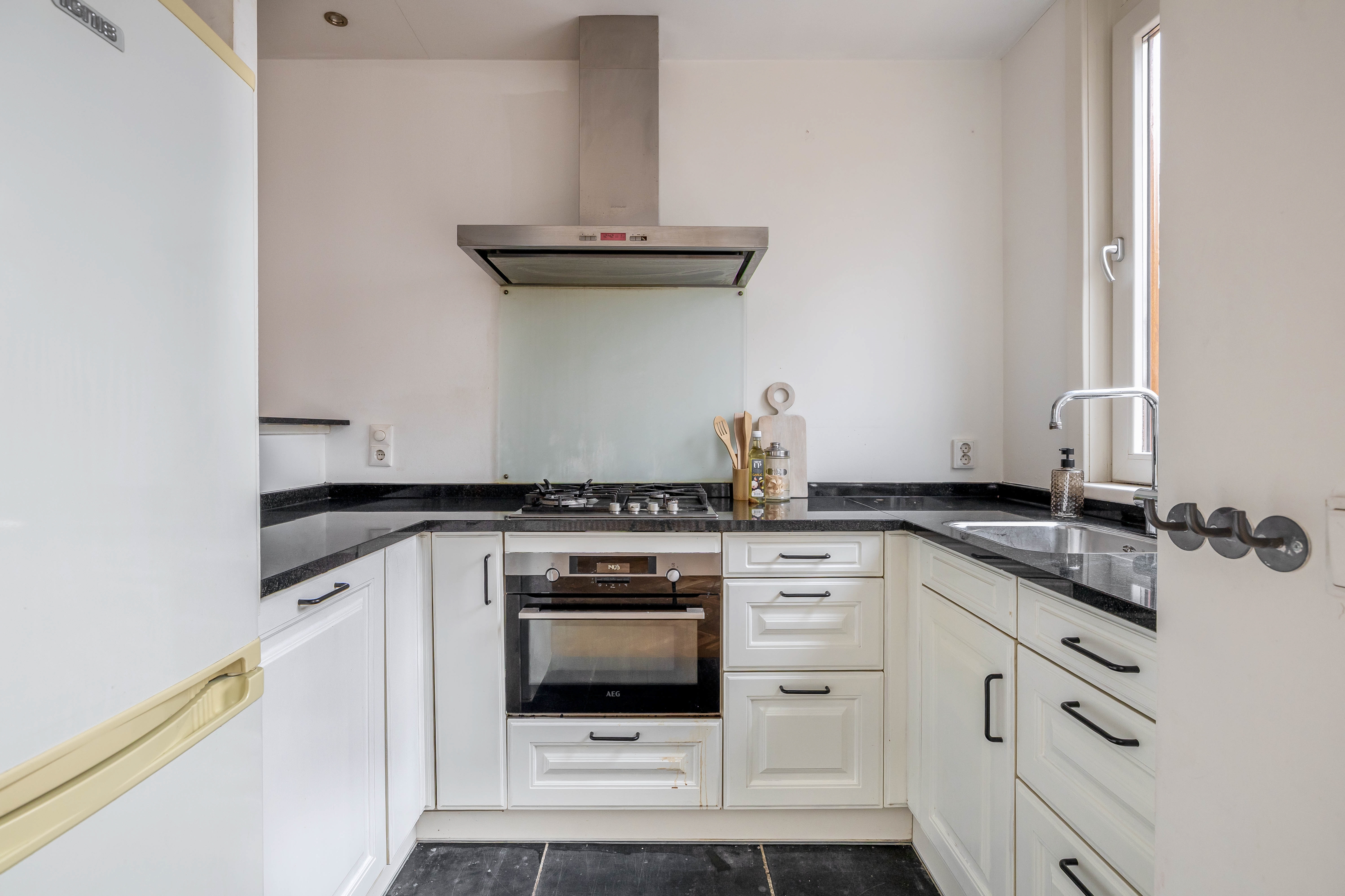 Aan de achterzijde bevindt zich de open keuken, met uitzicht op de tuin. Vanuit de keuken heb je direct toegang tot de achtertuin, gelegen op het westen – perfect om na een lange dag nog even van de zon te genieten.