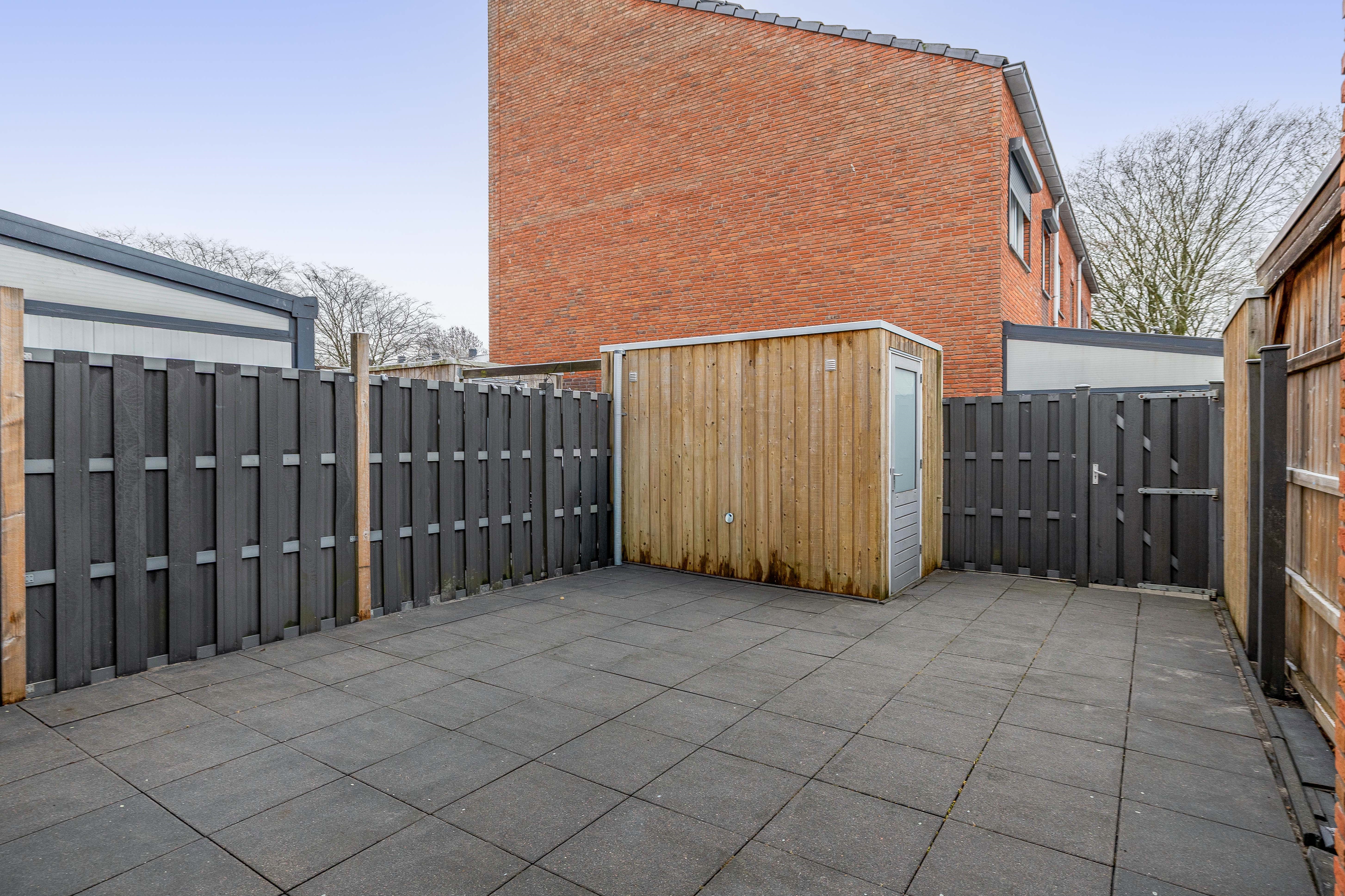 De tuin is gelegen op het zonnige zuiden en is volledig betegeld, waardoor je hier optimaal kunt genieten van het buitenleven met minimaal onderhoud. Daarnaast beschikt de tuin over een achterom en directe toegang tot de parkeerplaats. De houten berging biedt ruimte voor fietsen en tuingereedschap.
