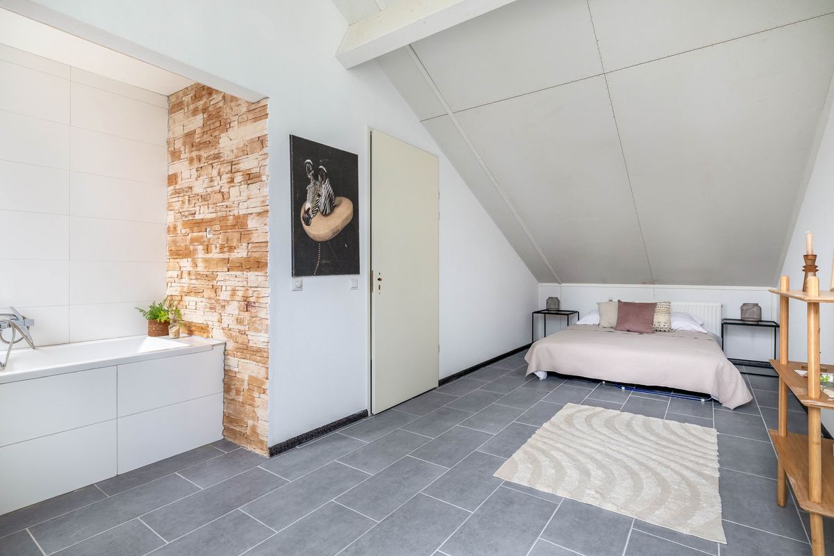 De tweede verdieping verrast je met een ruime (slaap)kamer met extra hoogte, wat zorgt voor een speels en ruimtelijk gevoel. Deze verdieping leent zich uitstekend als master bedroom, logeerkamer of rustige thuiswerkplek. Hier is bovendien al een bad aanwezig, waardoor deze verdieping ideaal is om een tweede badkamer te creëren. Daarnaast bevinden zich hier de opstelplaats van de cv-ketel en de aansluitingen voor de wasmachine en droger. Extra bergruimte kan eenvoudig worden gecreëerd door het plaatsen van knieschotten.