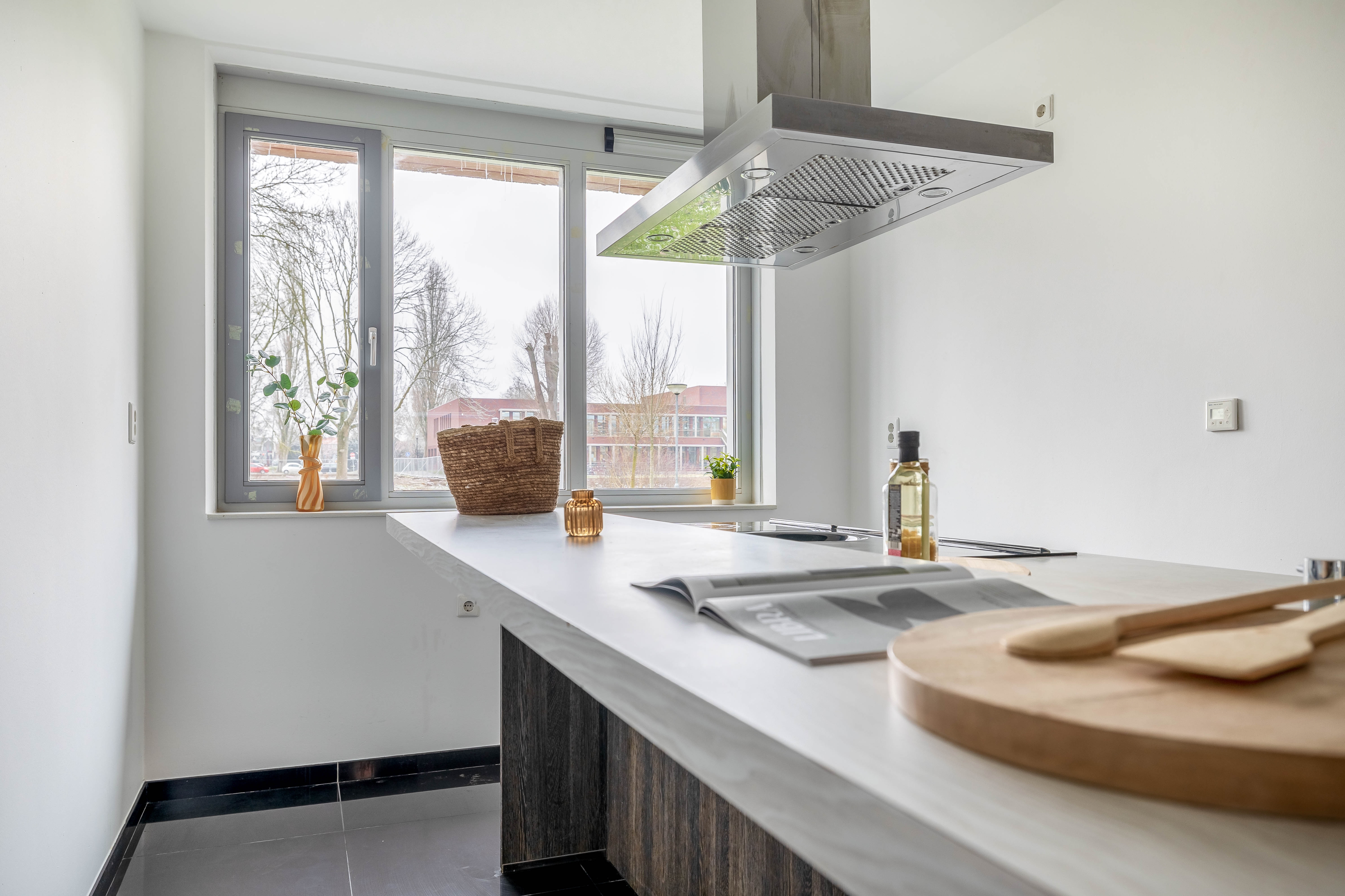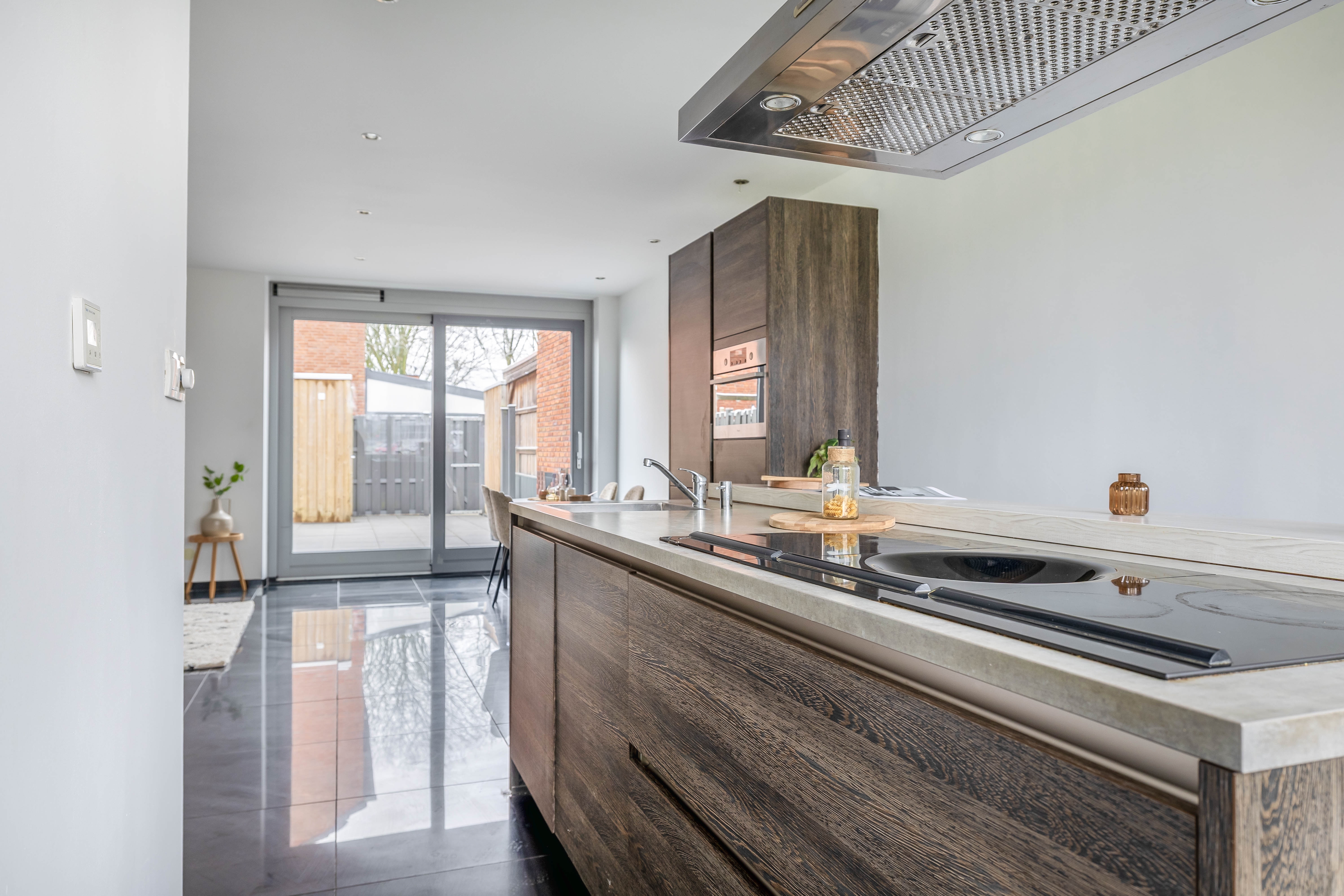 De keuken bevindt zich aan de voorzijde van de woning en is praktisch én sfeervol ingericht. Deze is voorzien van een inductiekookplaat, vaatwasser, koelkast, vriezer en een combi-oven. Het bar-gedeelte maakt de keuken een echte ontmoetingsplek in huis: perfect voor een snel ontbijt, een kop koffie of gezellig aanschuiven tijdens het koken.