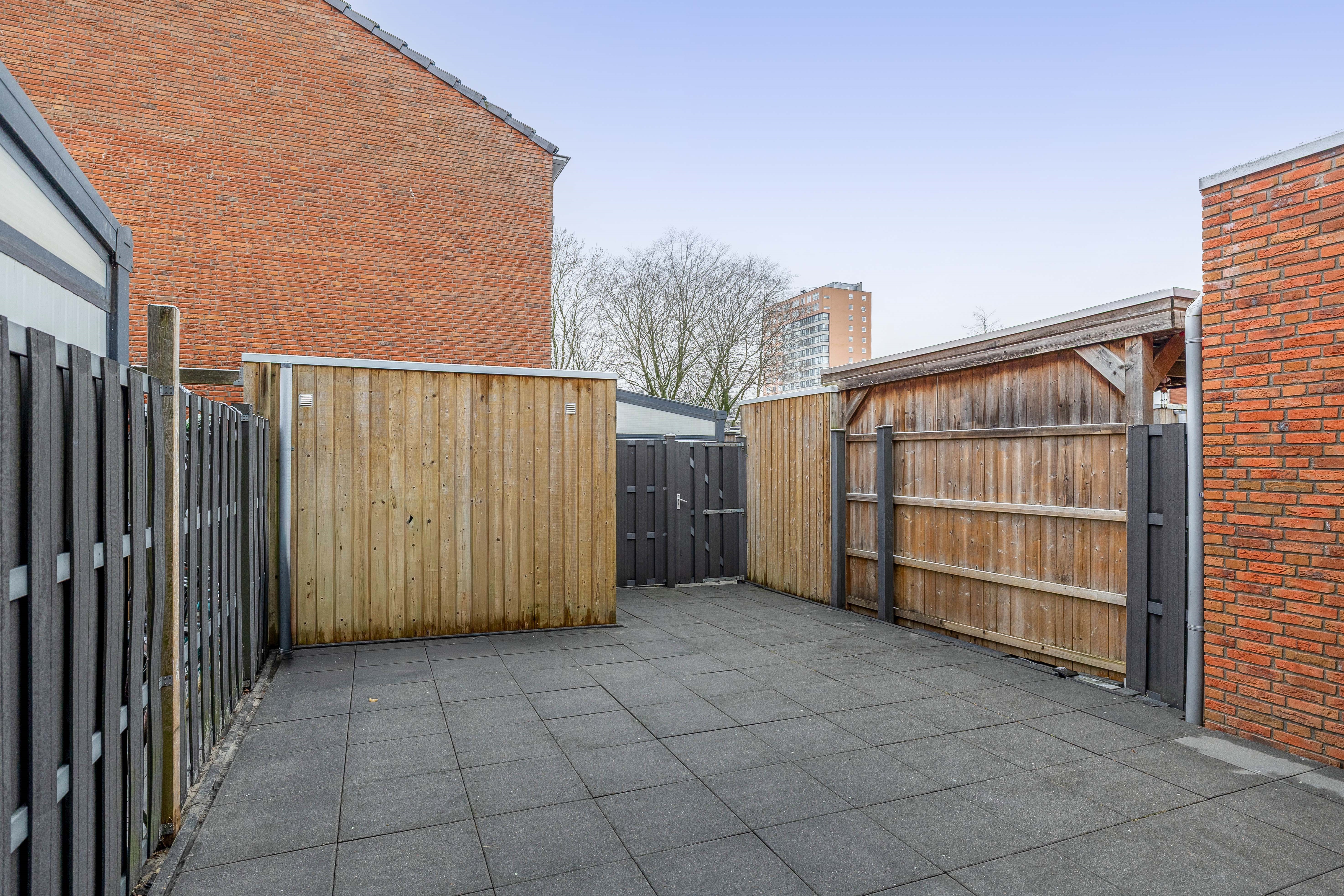 De achtertuin ligt op het zonnige zuiden en is volledig betegeld, waardoor je hier optimaal kunt genieten van het buitenleven met minimaal onderhoud. Daarnaast beschikt de tuin over een achterom en directe toegang tot de parkeerplaats. De houten berging biedt volop ruimte voor fietsen en tuingereedschap.