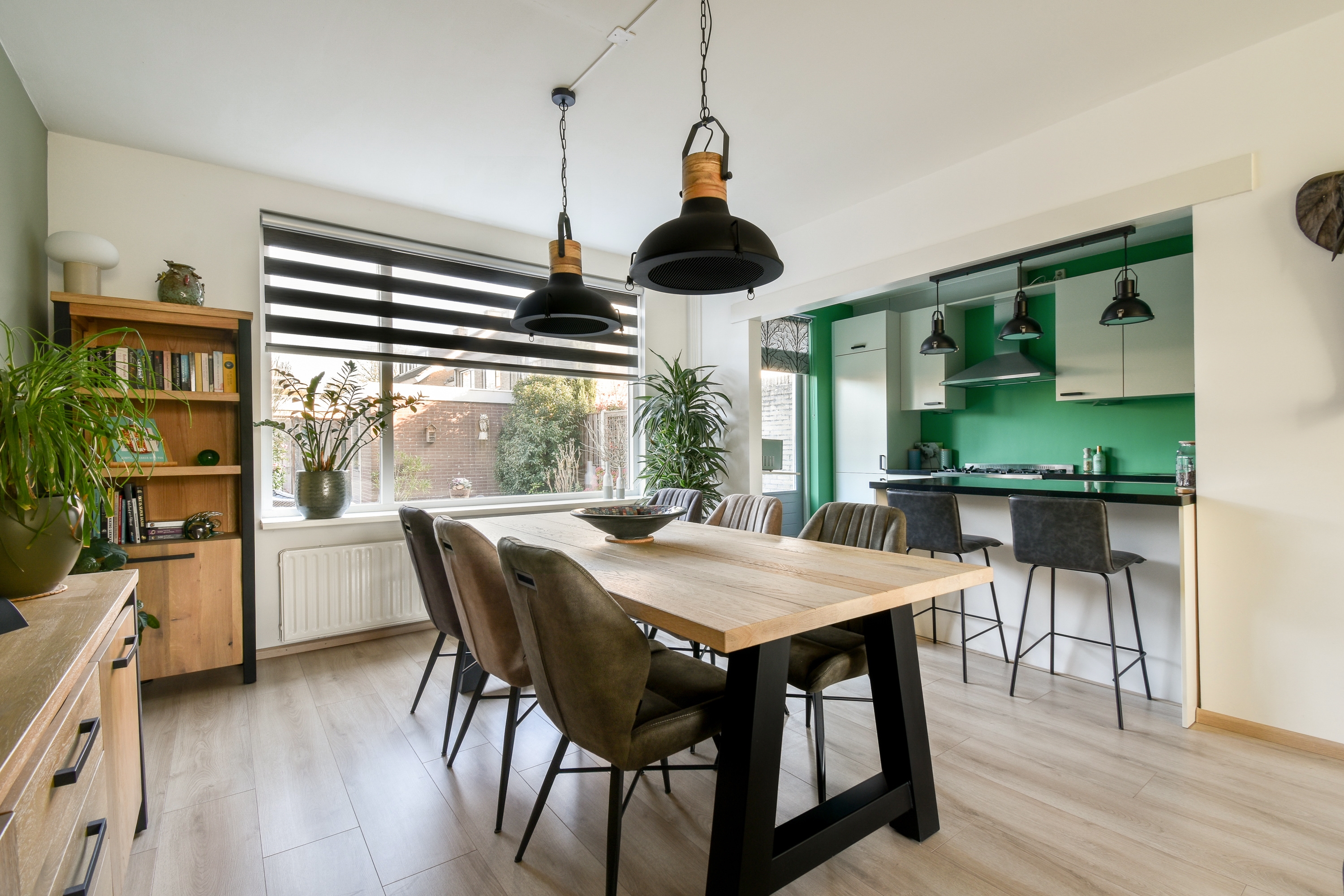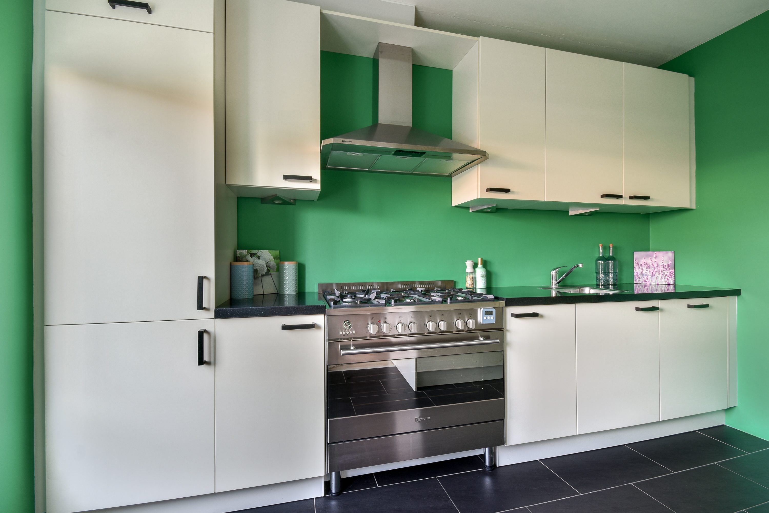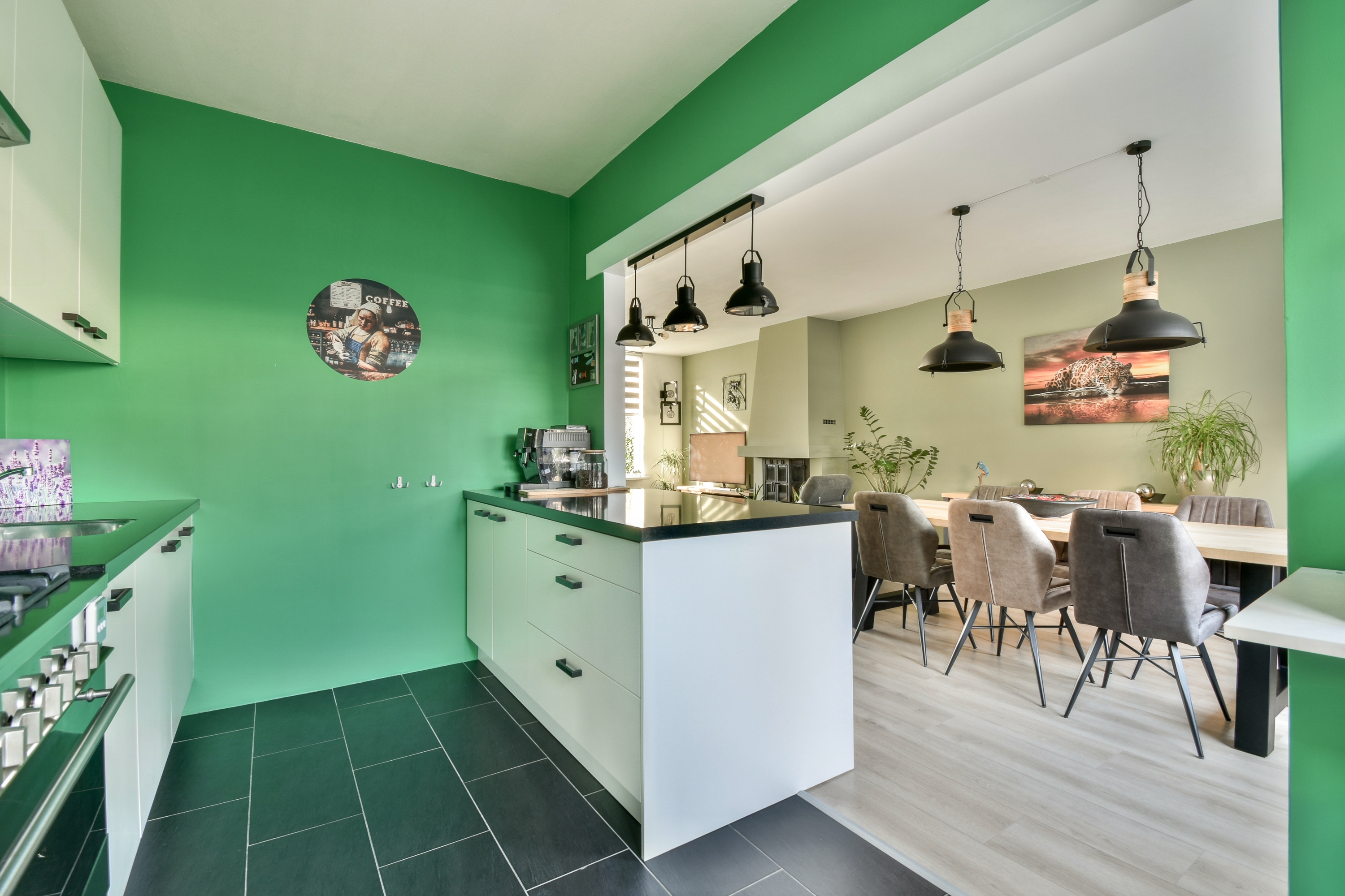 Aan de achterzijde bevindt zich de moderne open keuken, uitgevoerd in een frisse kleurstelling en voorzien van een strak schiereiland. Hier profiteer je van extra werkbladruimte én een fijne bar, perfect voor ontbijten, borrelen of gezellig koken terwijl je in contact blijft met de rest van het gezin. De keuken beschikt over diverse inbouwapparatuur, waaronder een kookplaat, afzuigkap, oven, koelkast en vriezer. Je zet hier zo je favoriete gerechten op tafel. Via de achterdeur loop je direct de tuin in, ideaal voor zomerse avonden en dagelijkse gemak.