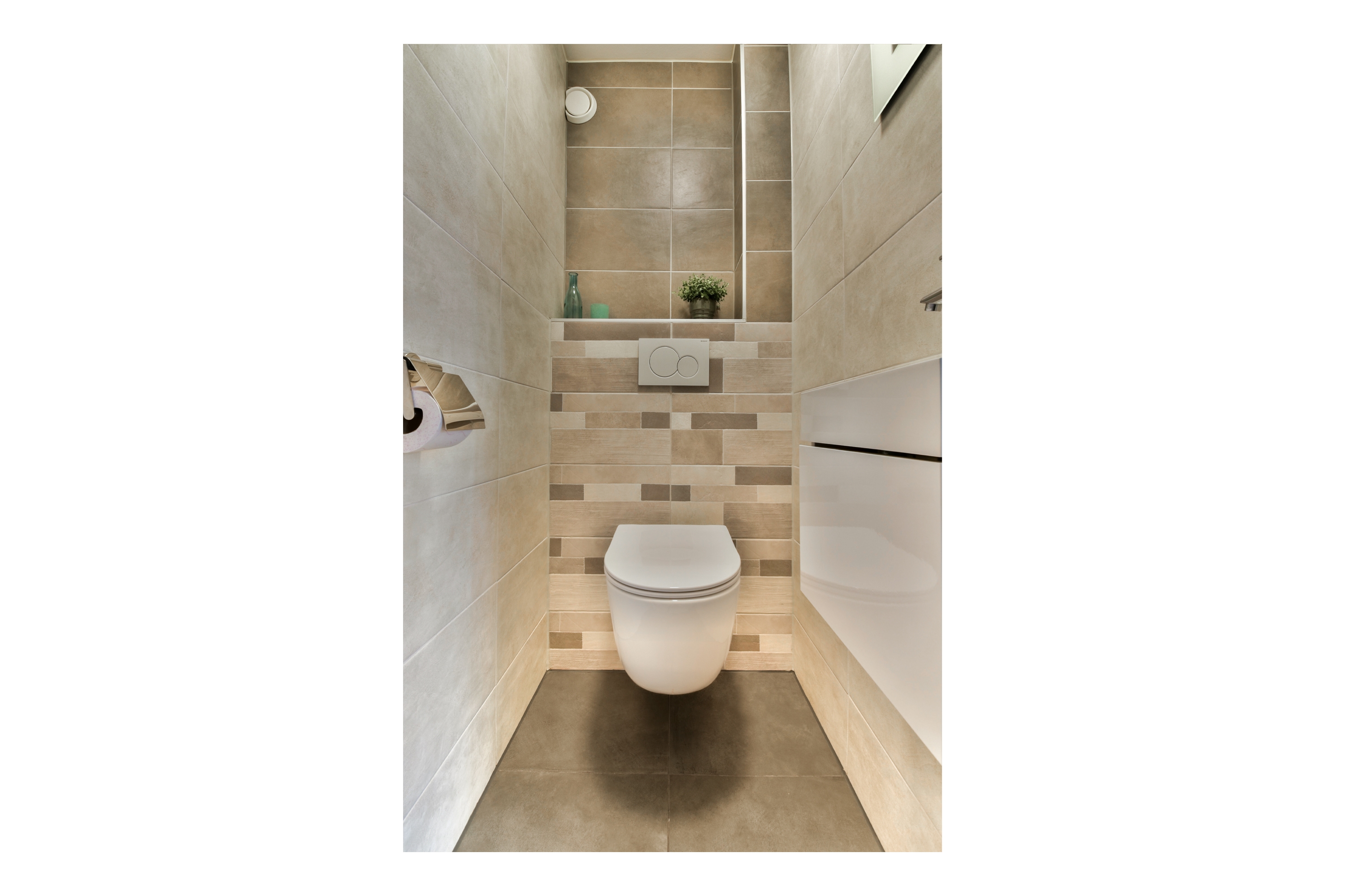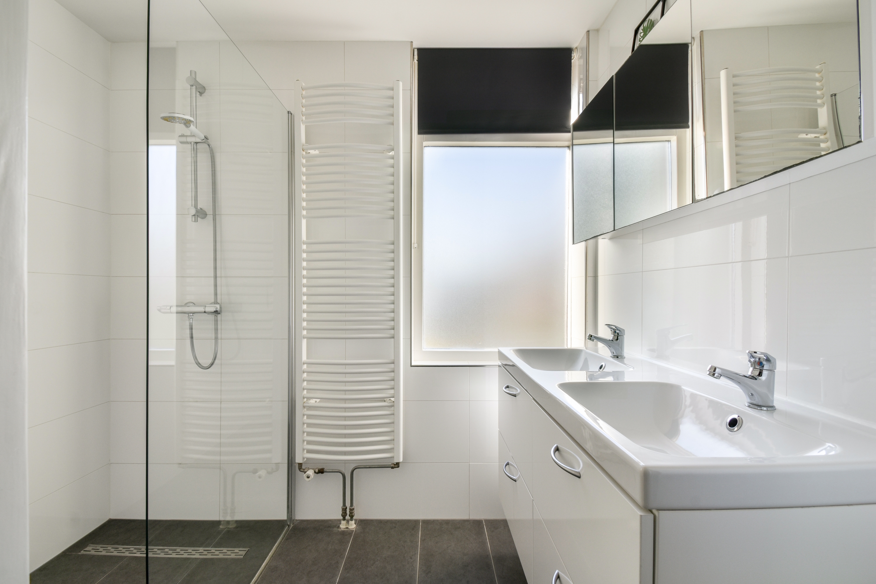 De badkamer is modern ingericht met een stijlvol wastafelmeubel en een fijne inloopdouche met glazen wand. De frisse betegeling maakt het geheel helemaal af. Extra prettig: op deze verdieping vind je een separaat toilet, zodat je badkamer en toilet van elkaar gescheiden zijn.