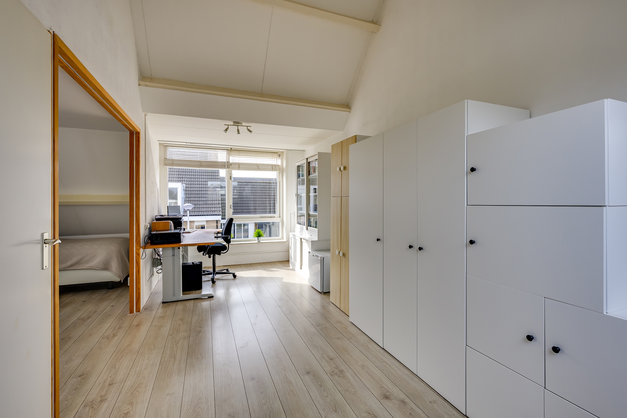 Op de eerste verdieping kom je op de overloop met hier de opstelplaats voor de CV-ketel en bergruimte. Er zijn oorspronkelijk twee slaapkamers, waar nu één hele grote slaapkamer van is gemaakt. Door de schuine kap en dakkapel heeft deze verdieping een speelse indeling en volop mogelijkheden.