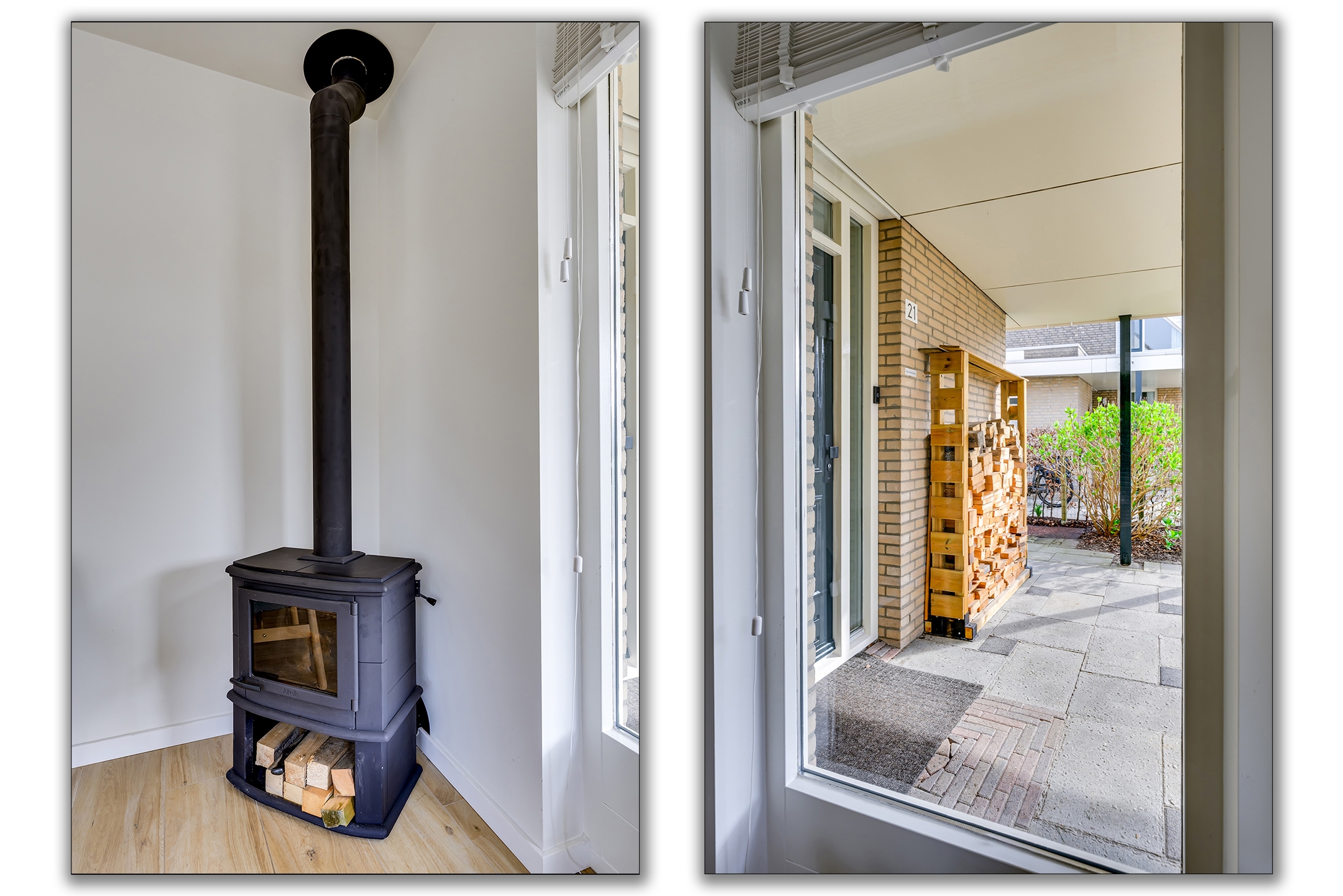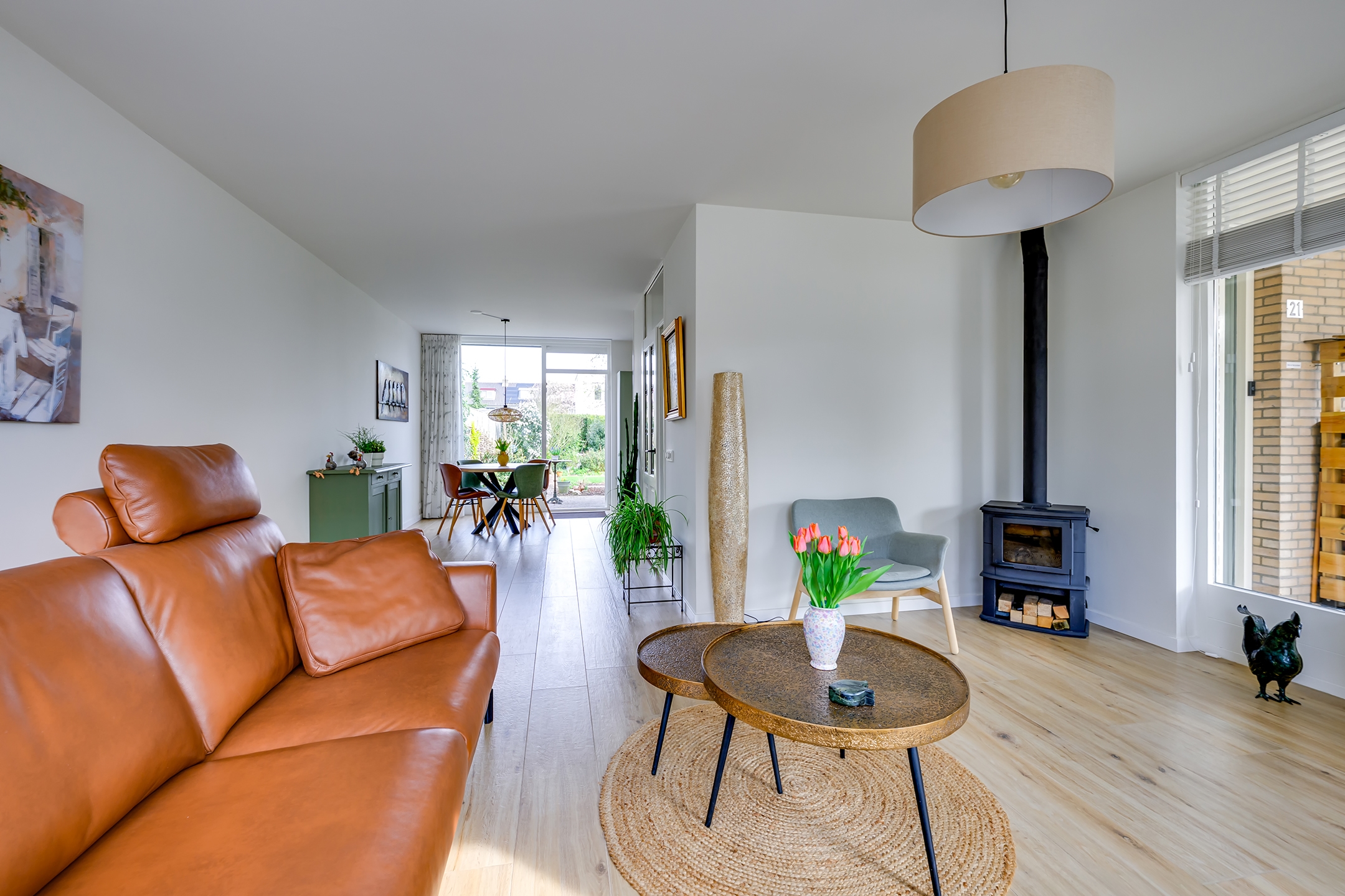 De doorzon woonkamer is heerlijk licht dankzij de grote raampartijen en heeft een warme, sfeervolle uitstraling met de speksteenkachel als echte eyecatcher. Aansluitend vind je de eetkamer en de keuken, die praktisch is ingericht en voorzien van voldoende werk- en kastruimte. Vanuit hier heb je ook toegang tot de achtertuin.
