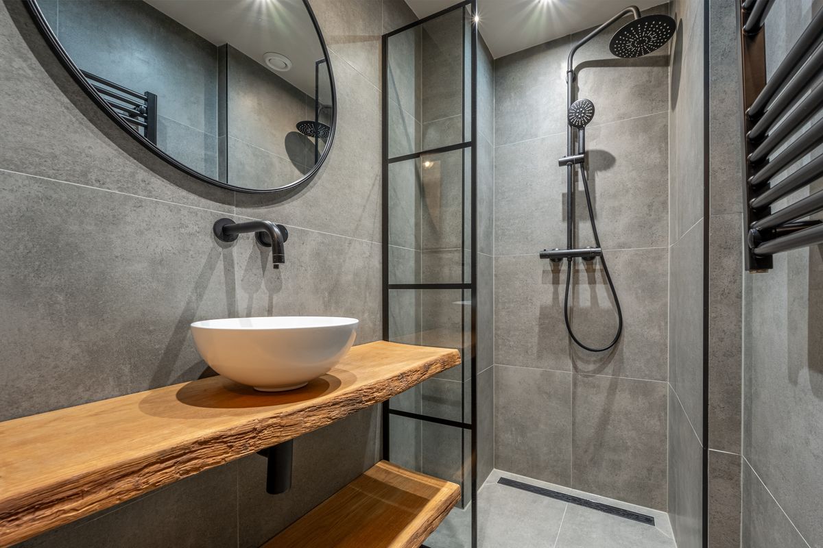 De badkamer is luxe, volledig betegeld en uitgevoerd in moderne tinten. Je vindt hier een inloopdouche met regendouche, een stijlvol wastafelmeubel met houten blad, zwarte kranen, inbouwspots en een handdoekradiator. Het separate toilet is eveneens modern afgewerkt.