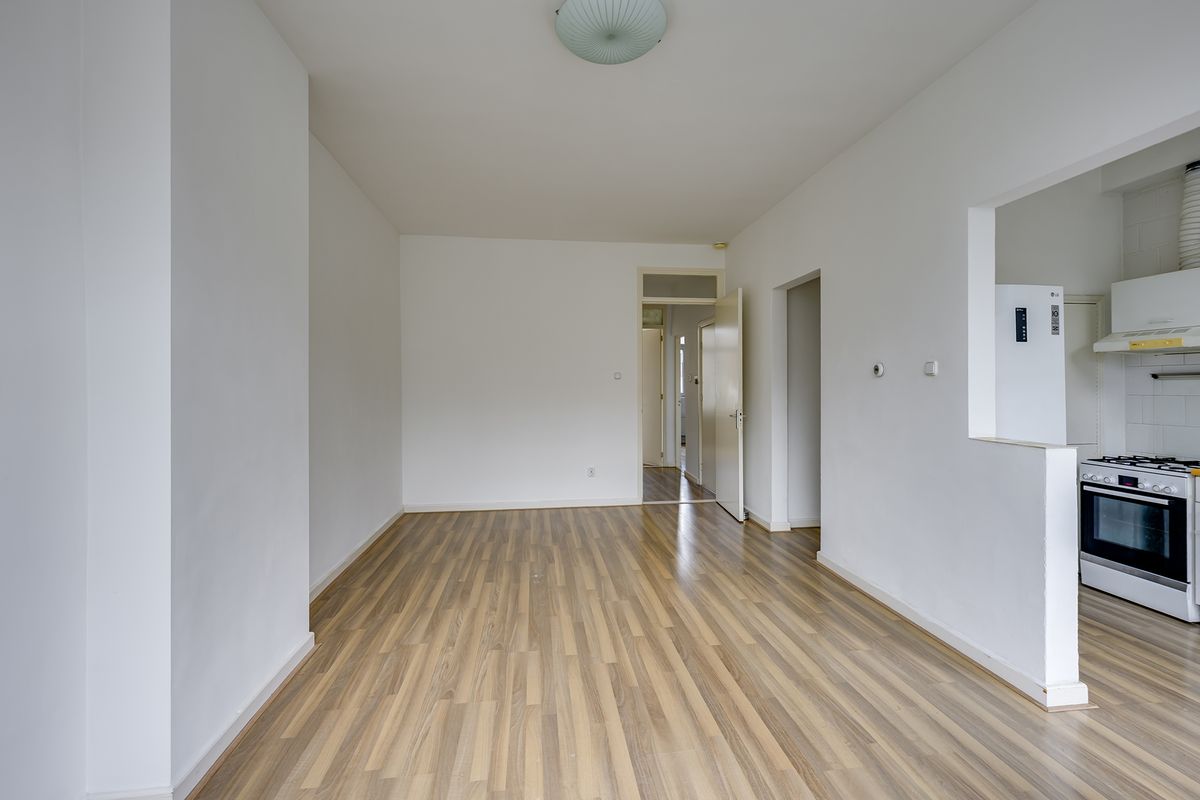 De woonkamer is ruim opgezet en vormt het hart van de woning. Dankzij de grote raampartijen aan de voorzijde geniet deze ruimte van veel natuurlijk daglicht, wat zorgt voor een open en sfeervolle uitstraling. Er is voldoende ruimte voor het creëren van een comfortabele zithoek en een gezellige eethoek, waardoor dit een fijne plek is om thuis te komen, te ontspannen of gasten te ontvangen.
