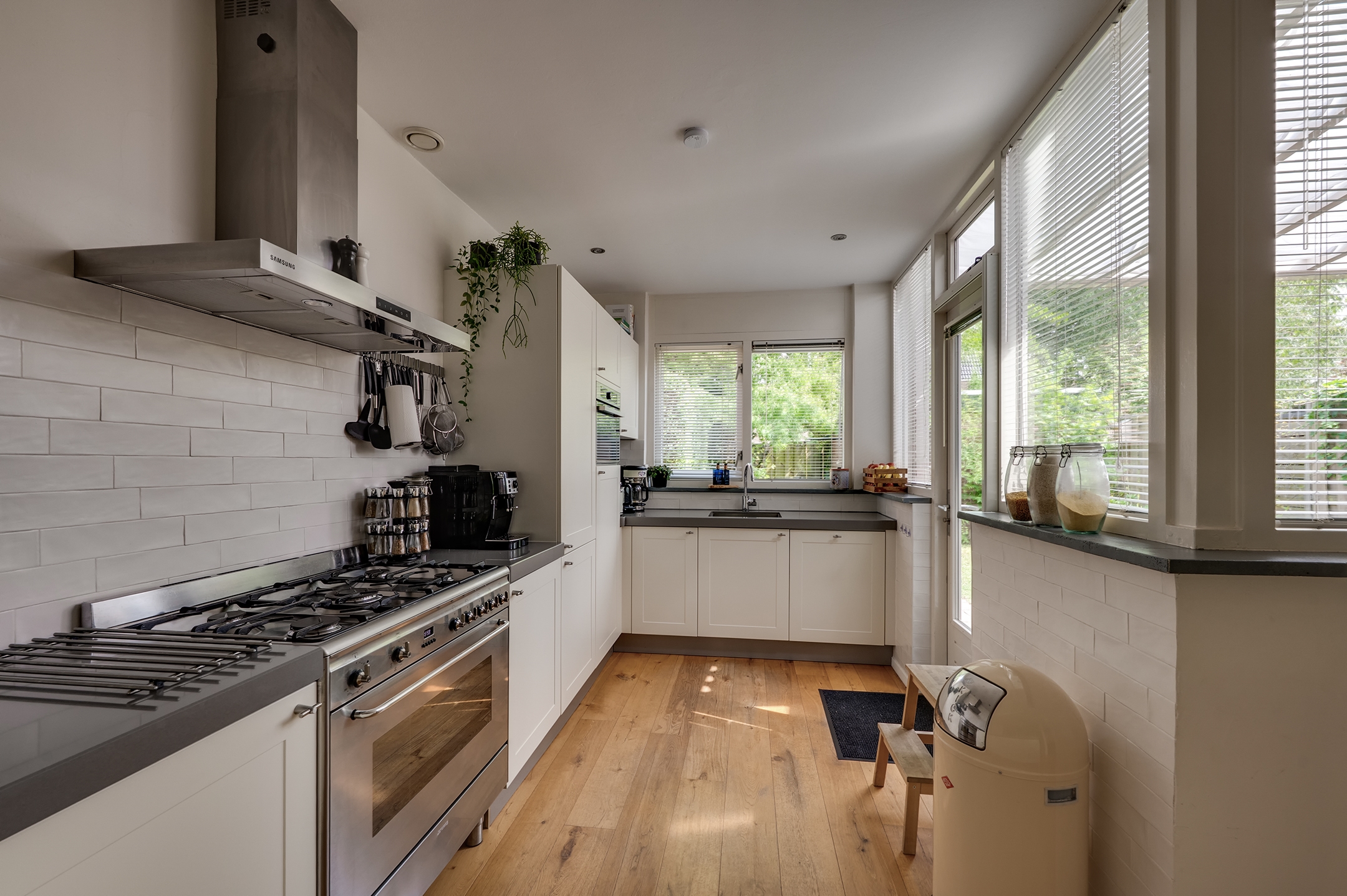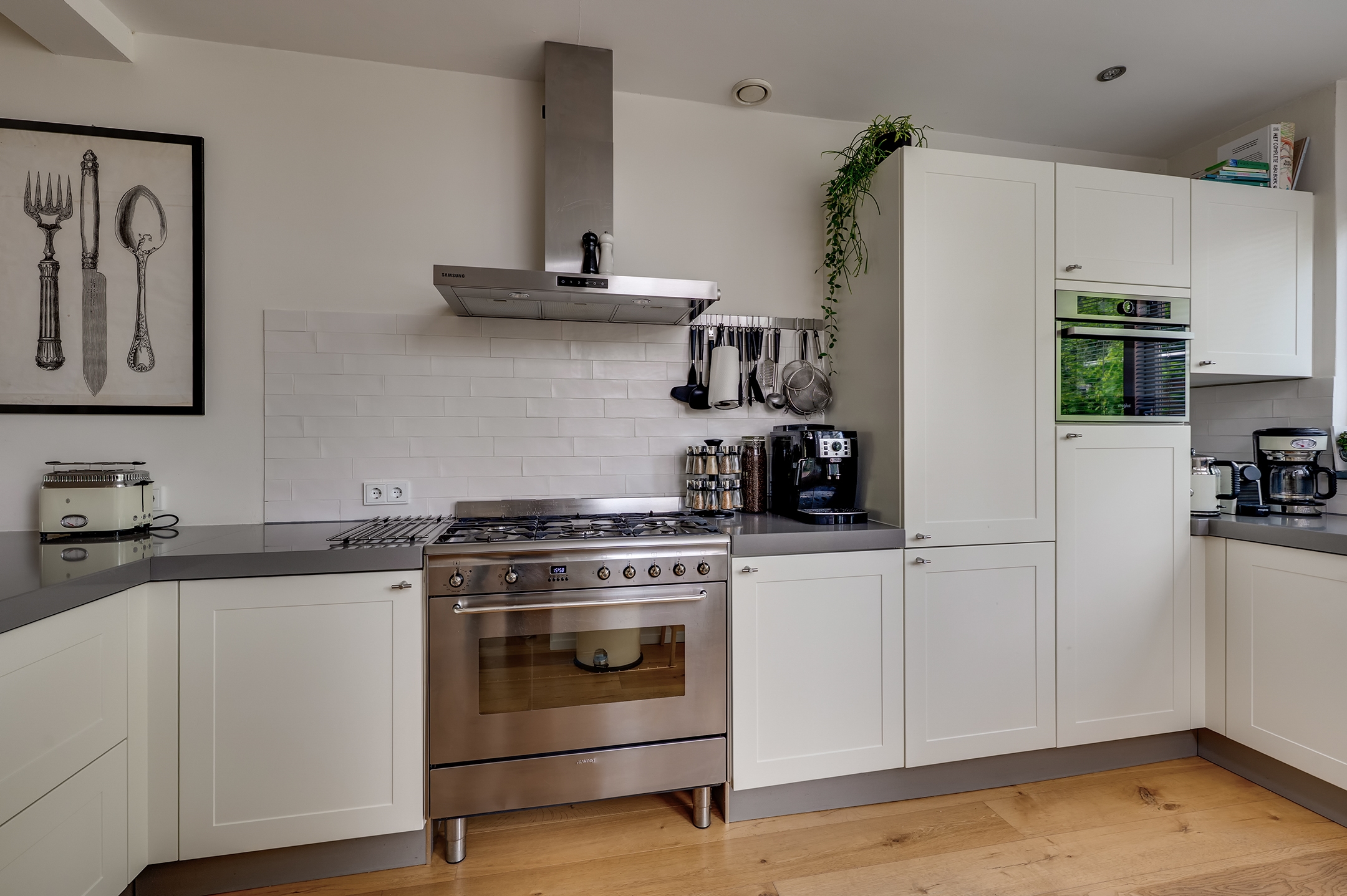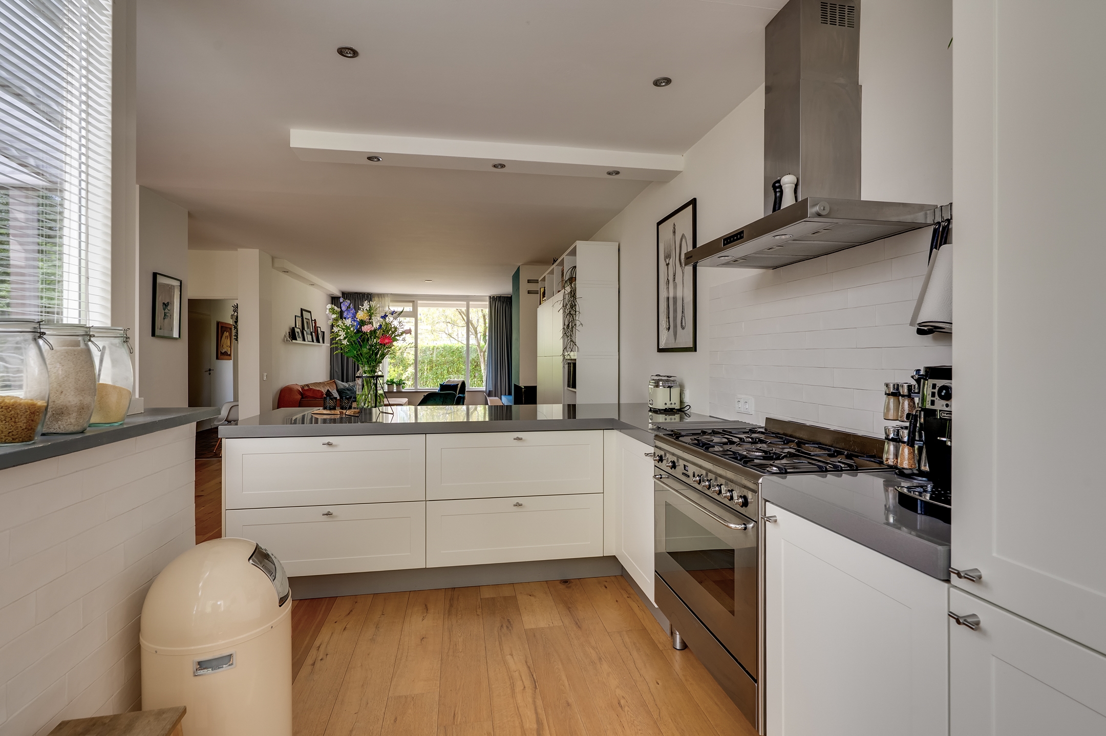 De grote leefkeuken is uitgevoerd in een U-opstelling en een zitgedeelte. De landelijk afgewerkte keuken is voorzien van een stenen werkblad, voldoende kastruimte, een spoelbak, een close-in boiler en diverse inbouwapparatuur, waaronder een 5-pits gasfornuis met oven, RVS afzuigkap, koelkast, vriezer, vaatwasser en combimagnetron. Ook vanuit de keuken is de tuin te bereiken.