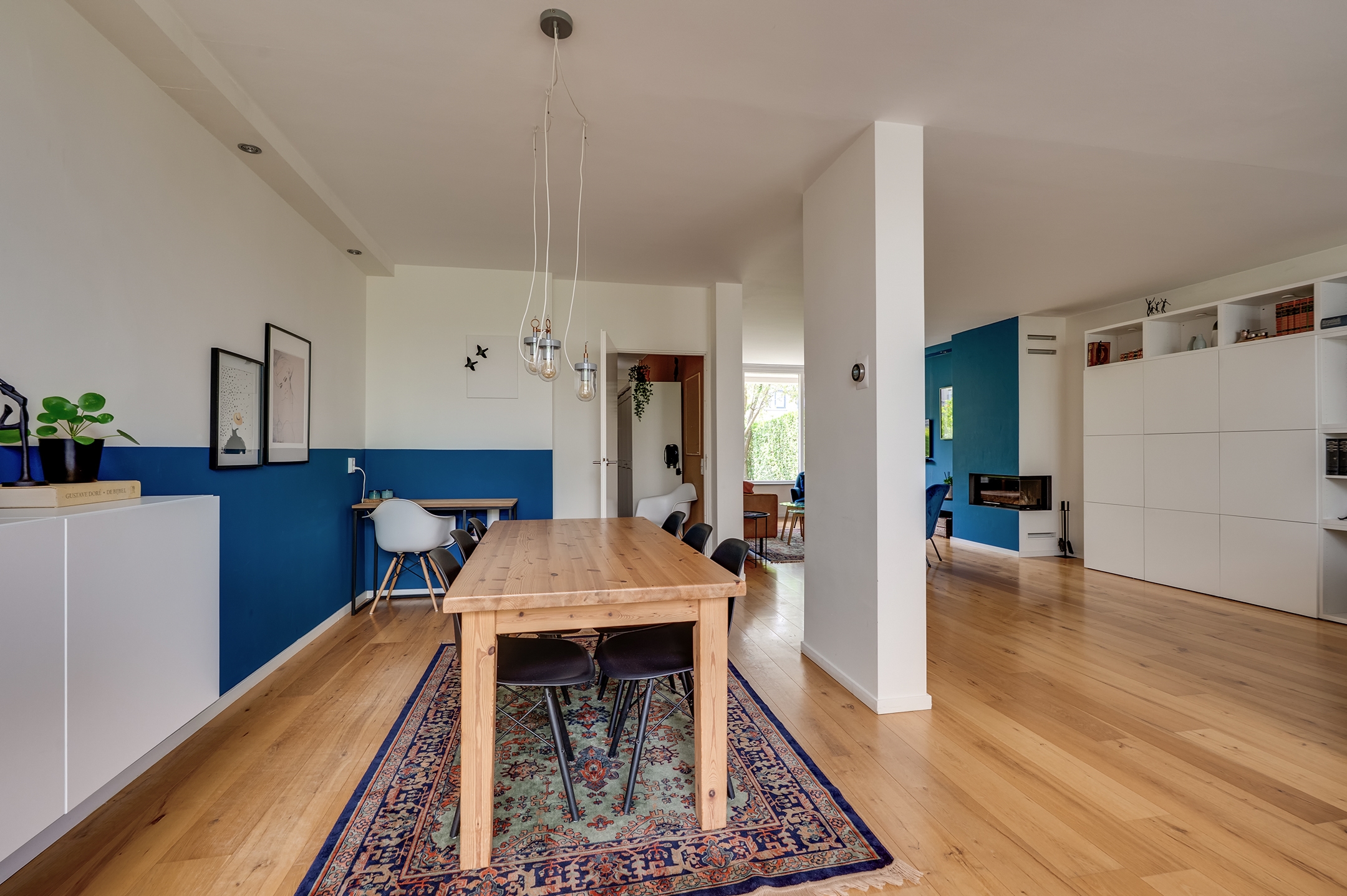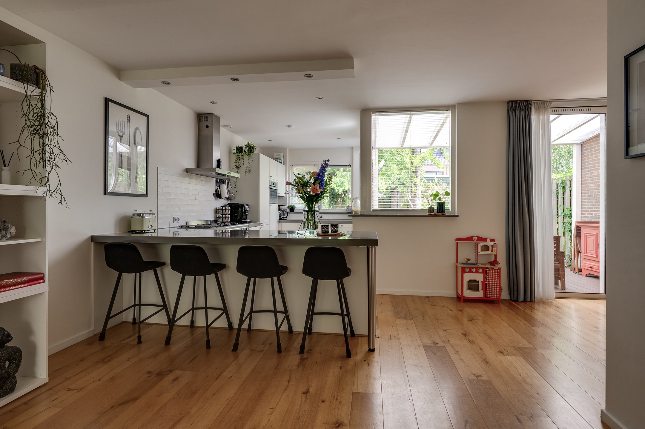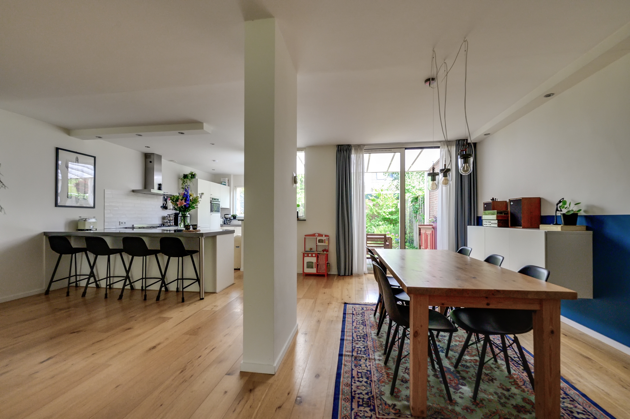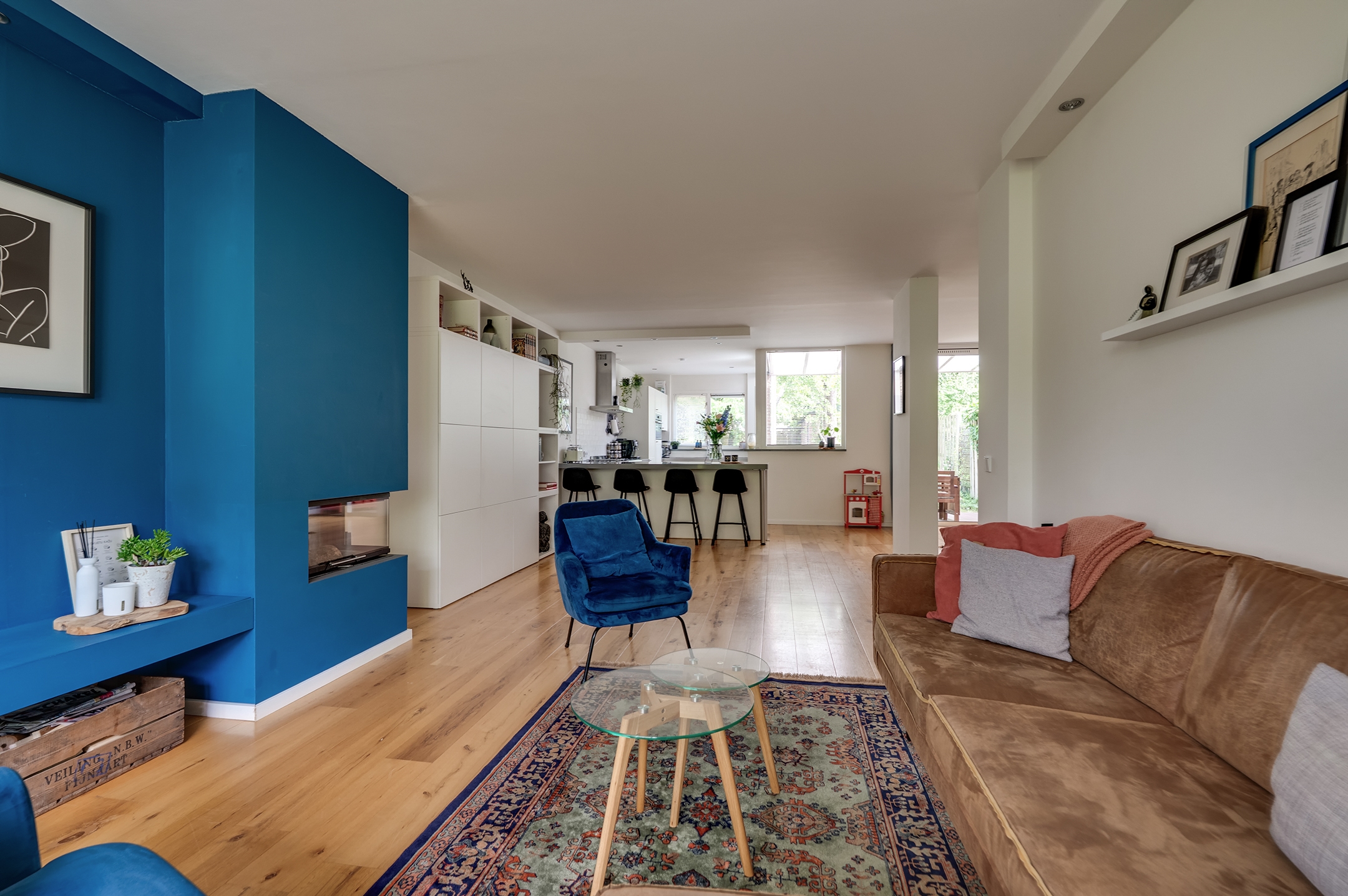 De woonkamer met grote leefkeuken en openhaard is heerlijk licht en ruim van opzet en is eenvoudig in te delen in een woon- en eetgedeelte. Door de schuifpui naar de achtertuin is er een directe verbinding met buiten.