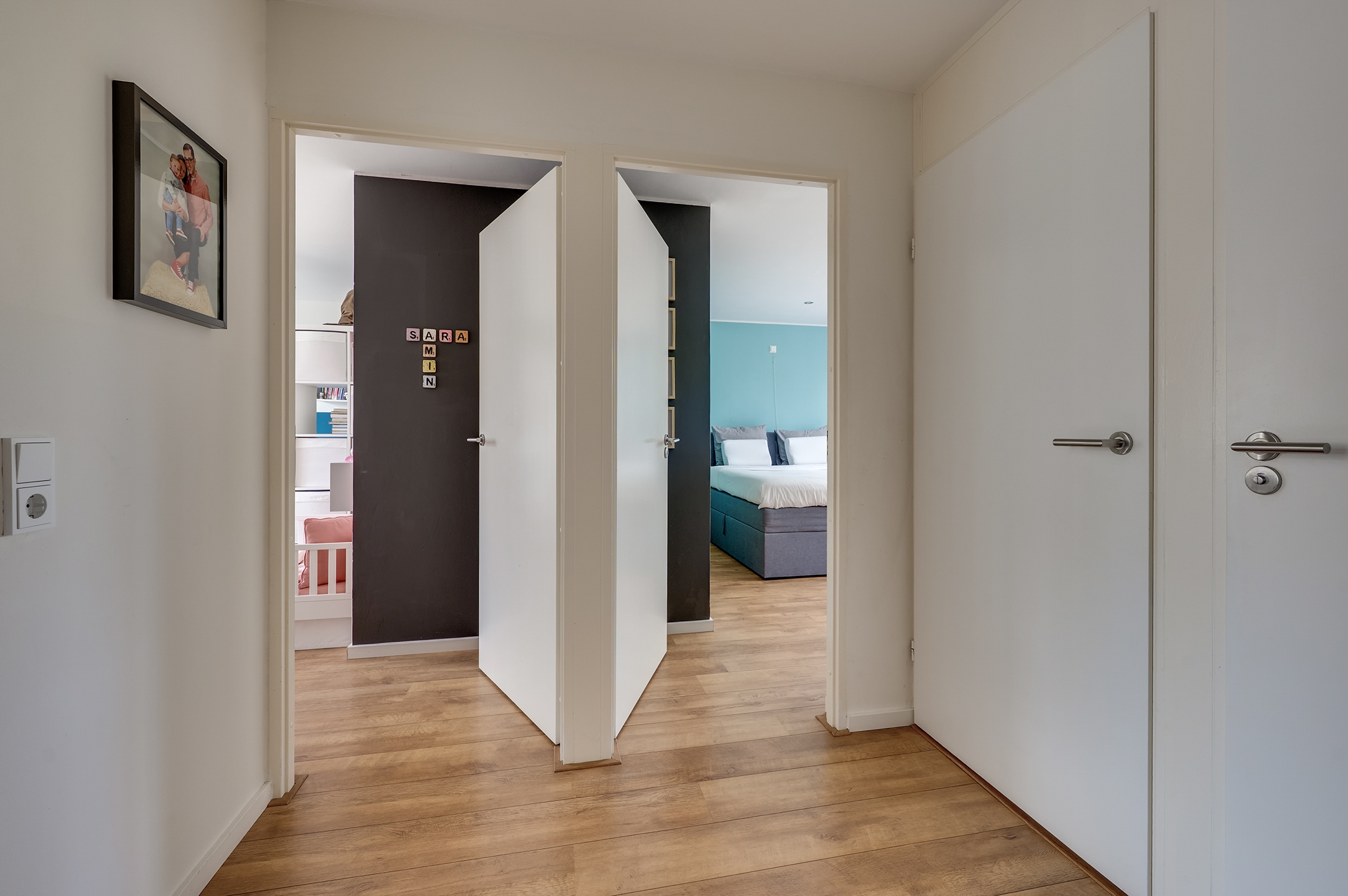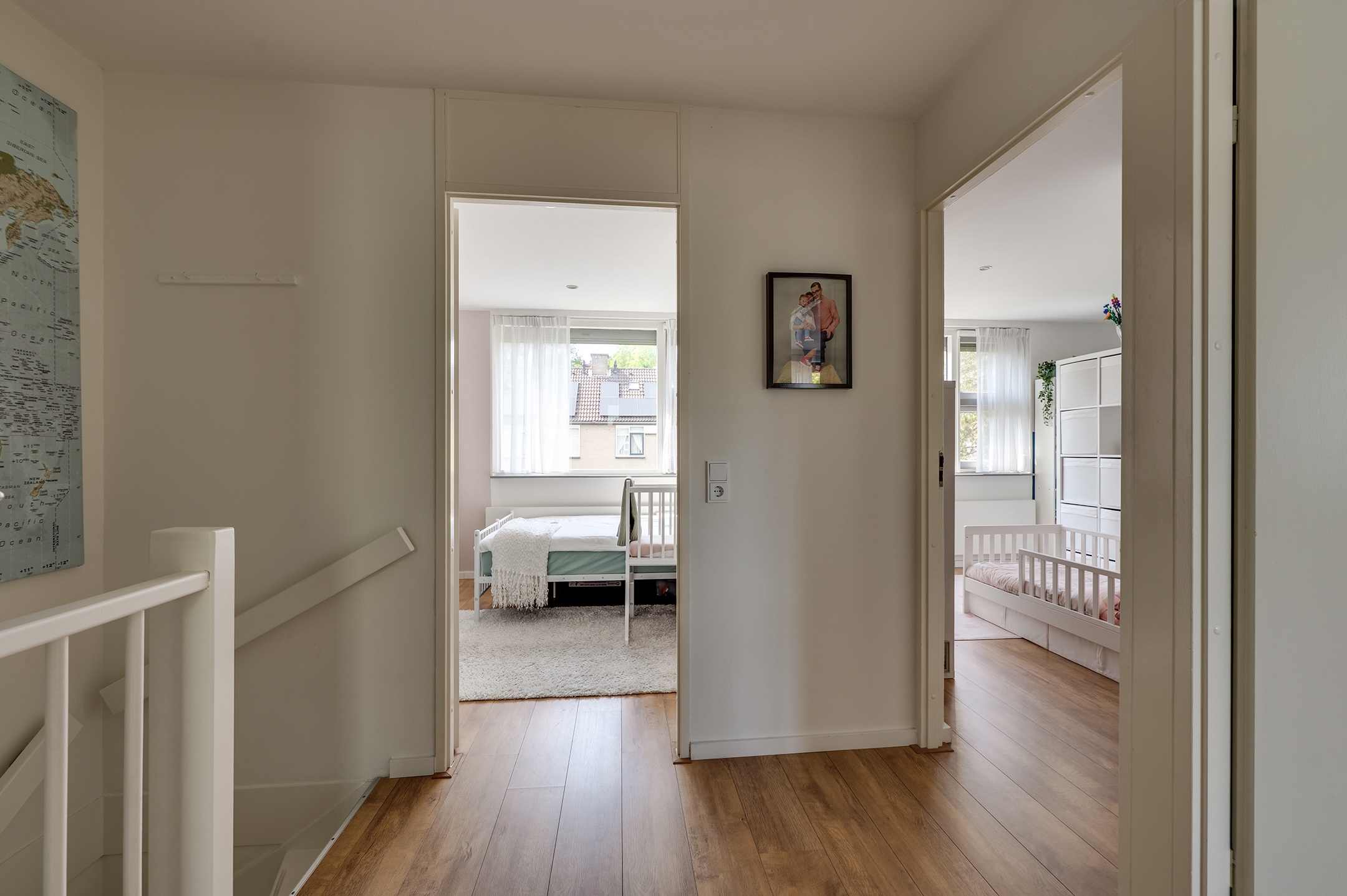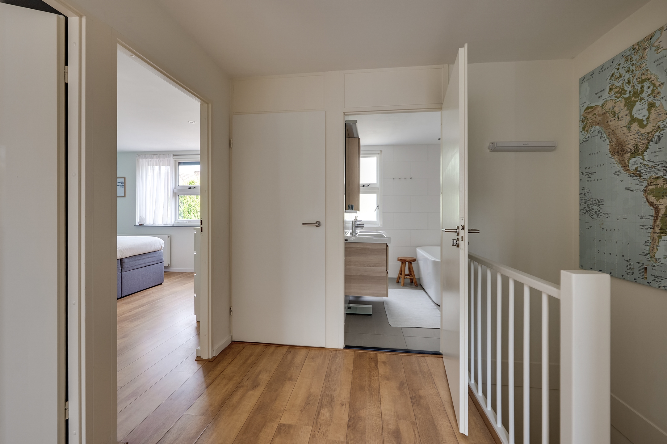 Vanaf de overloop is er toegang tot alle vertrekken en beschikt over een bergkast v.v. de opstelplaats van de C.V.-ketel en de hybride warmtepomp. Op deze verdieping zijn er drie slaapkamers aanwezig. De master bedroom is aan de achterzijde van de woning gesitueerd en beschikt over een ruime walk-in closet. De andere twee slaapkamers zijn aan de voorzijde van de woning gelegen.