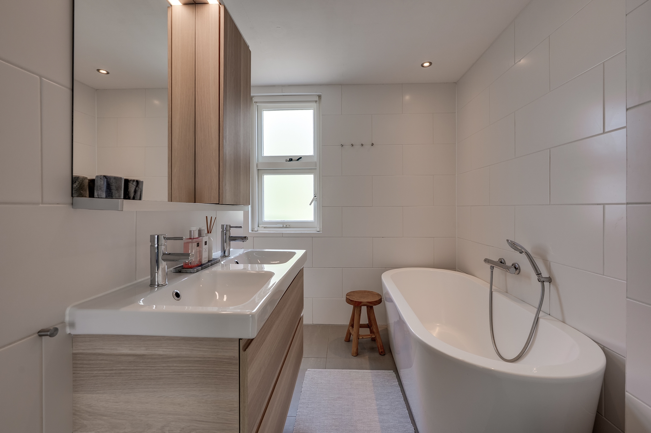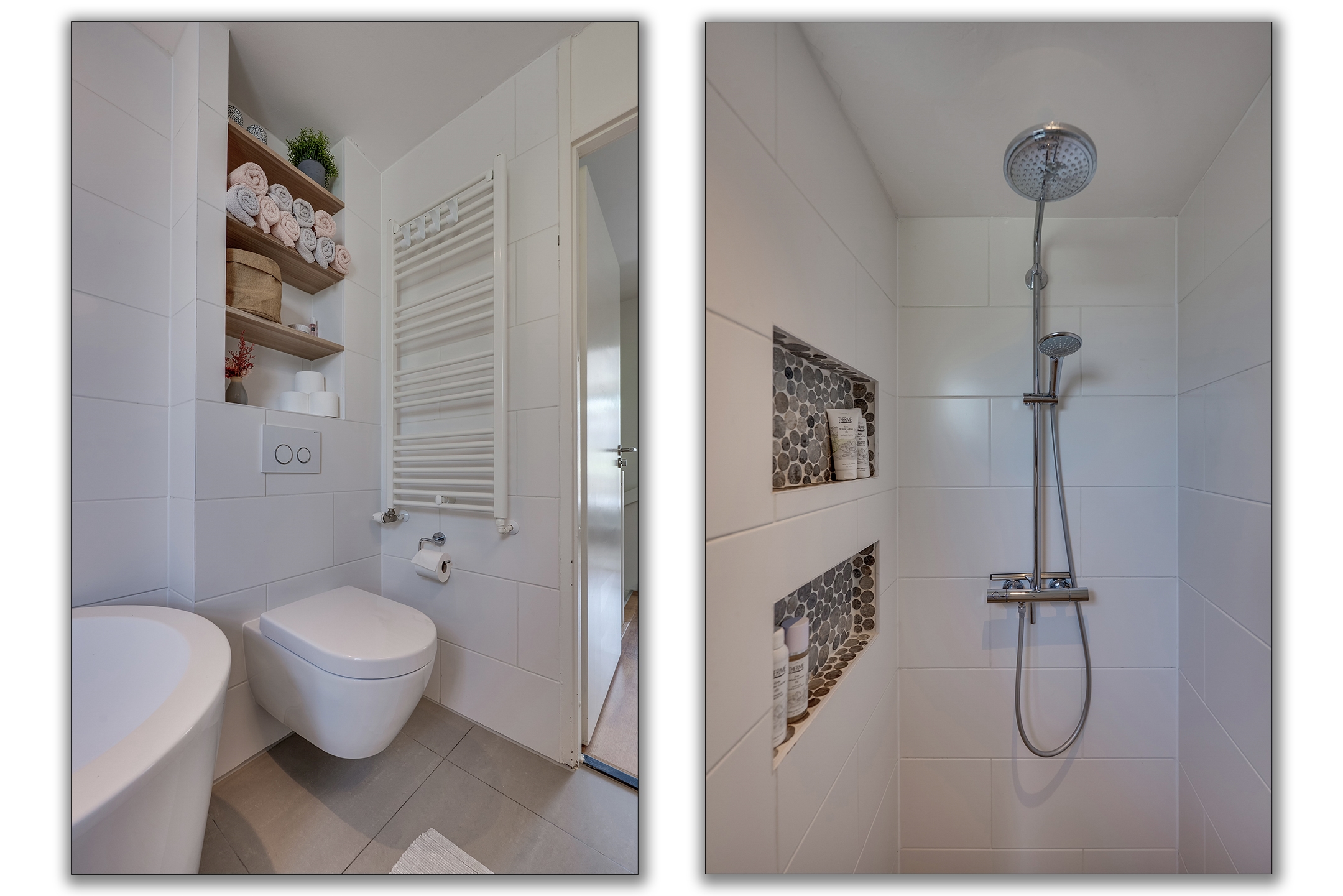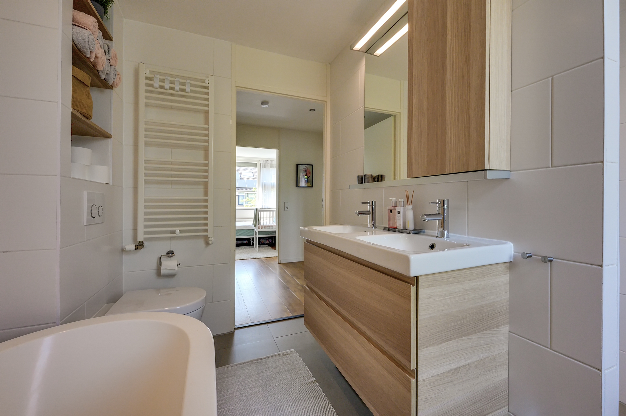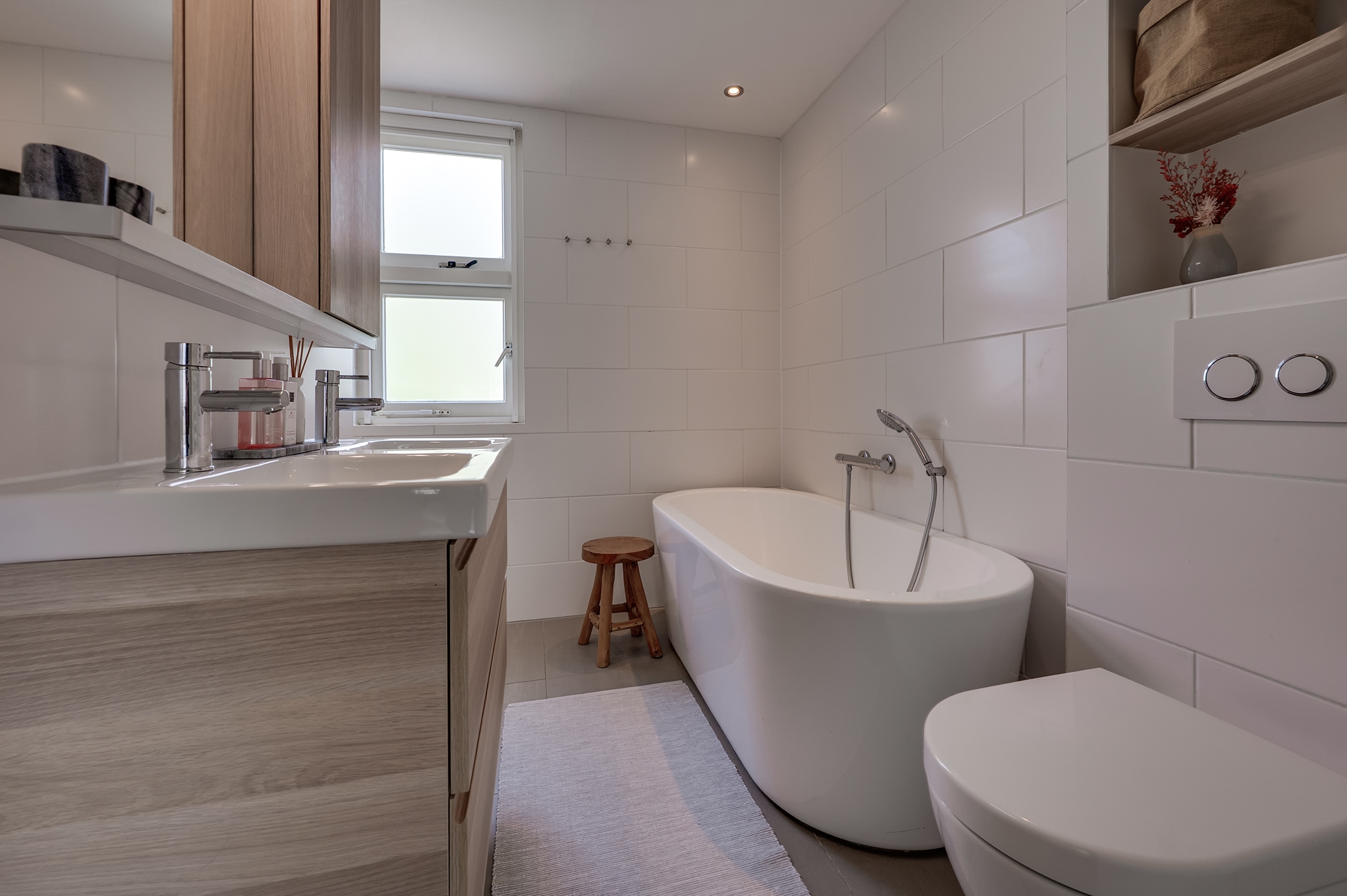 De luxe en modern afgewerkte badkamer is uitgevoerd in een wit/grijze kleurstelling. De volledig betegelde badkamer beschikt over een ligbad, een inloopdouche, dubbel wastafelmeubel, tweede toilet en vloerverwarming.