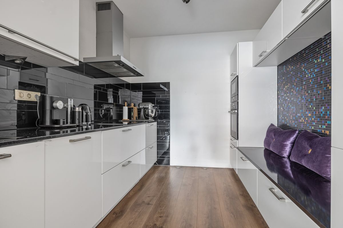 De woonkamer is lekker rustig gelegen aan de achterzijde van het complex is en door de grote raampartijen lekker licht. Vanuit hier is het balkon bereikbaar: een fijne plek om buiten te zitten met veel privacy. De open keuken is strak en luxe uitgevoerd met moderne apparatuur en zelfs een gezellige zitnis. Er is een inbouw inductie kookplaat, afzuigkap, vaatwasser, koelkast, vriezer, oven en magnetron.