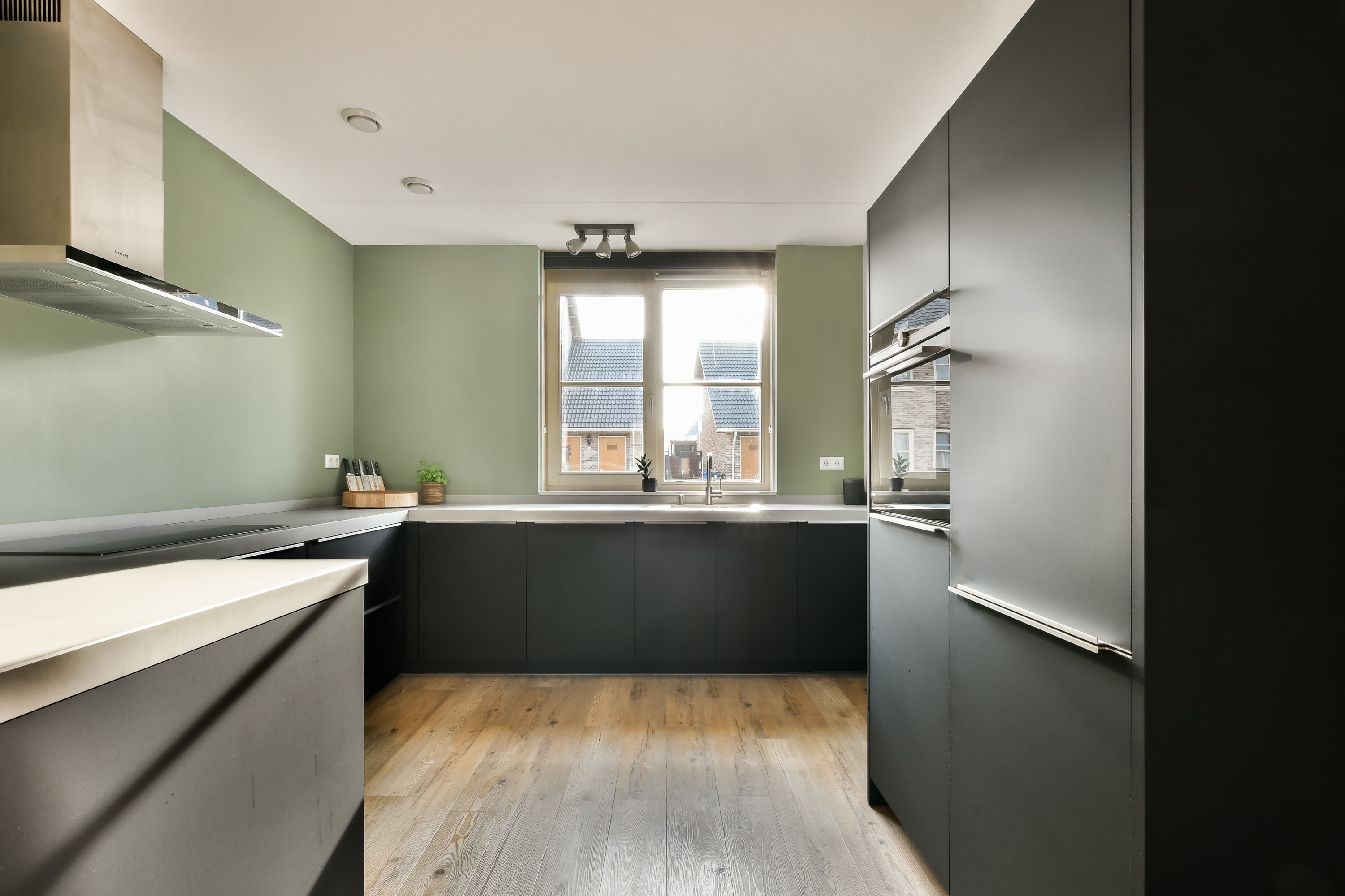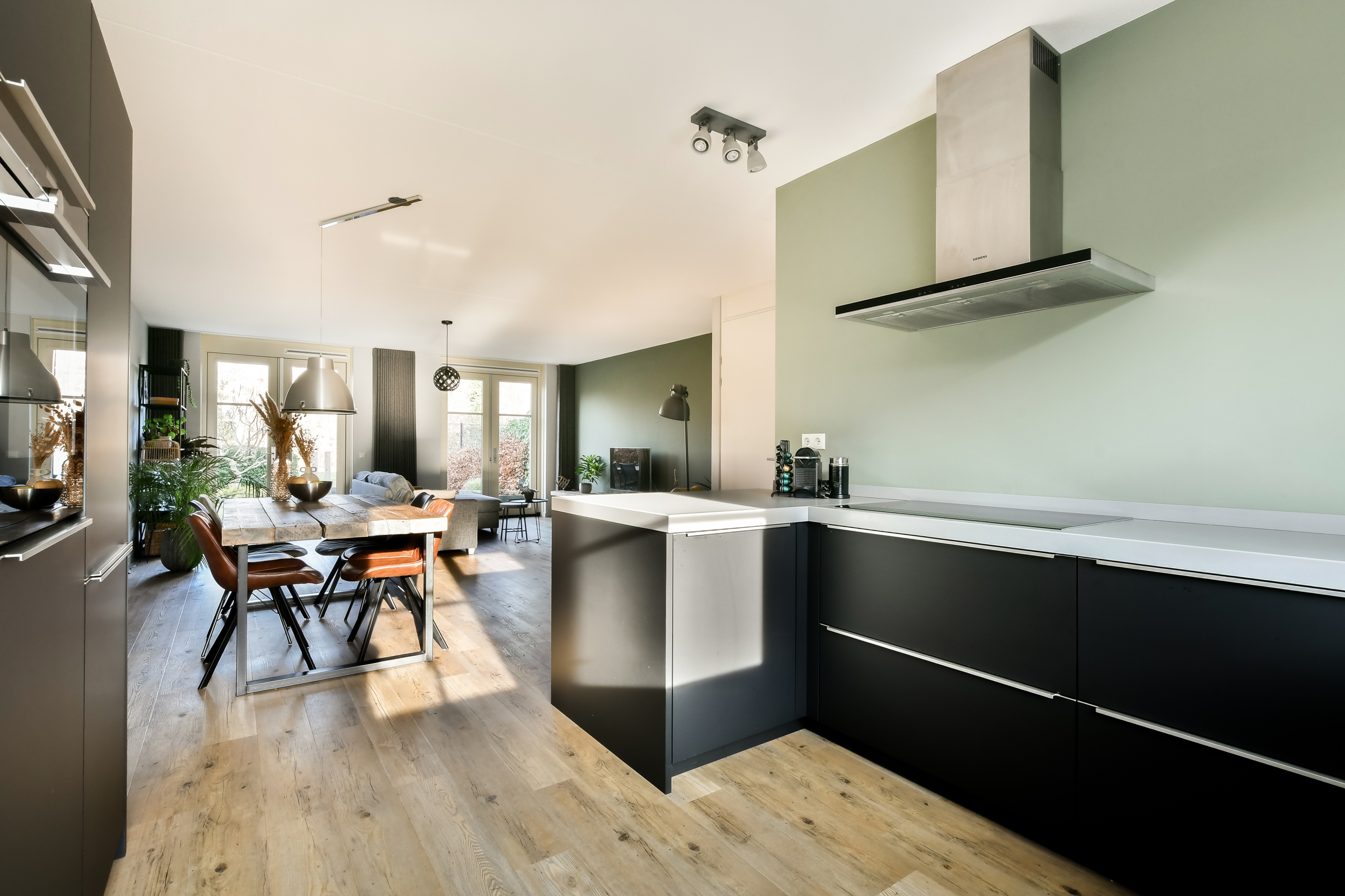 De open keuken is strak en modern uitgevoerd en vormt het hart van de woning. Met een luxe uitstraling en praktische indeling is dit een heerlijke plek om te koken en samen te komen. De keuken is voorzien van moderne Siemens apparatuur en biedt veel werk- en bergruimte. De begane grond is voorzien van vloerverwarming, wat zorgt voor extra comfort en een strakke afwerking zonder radiatoren in het zicht.