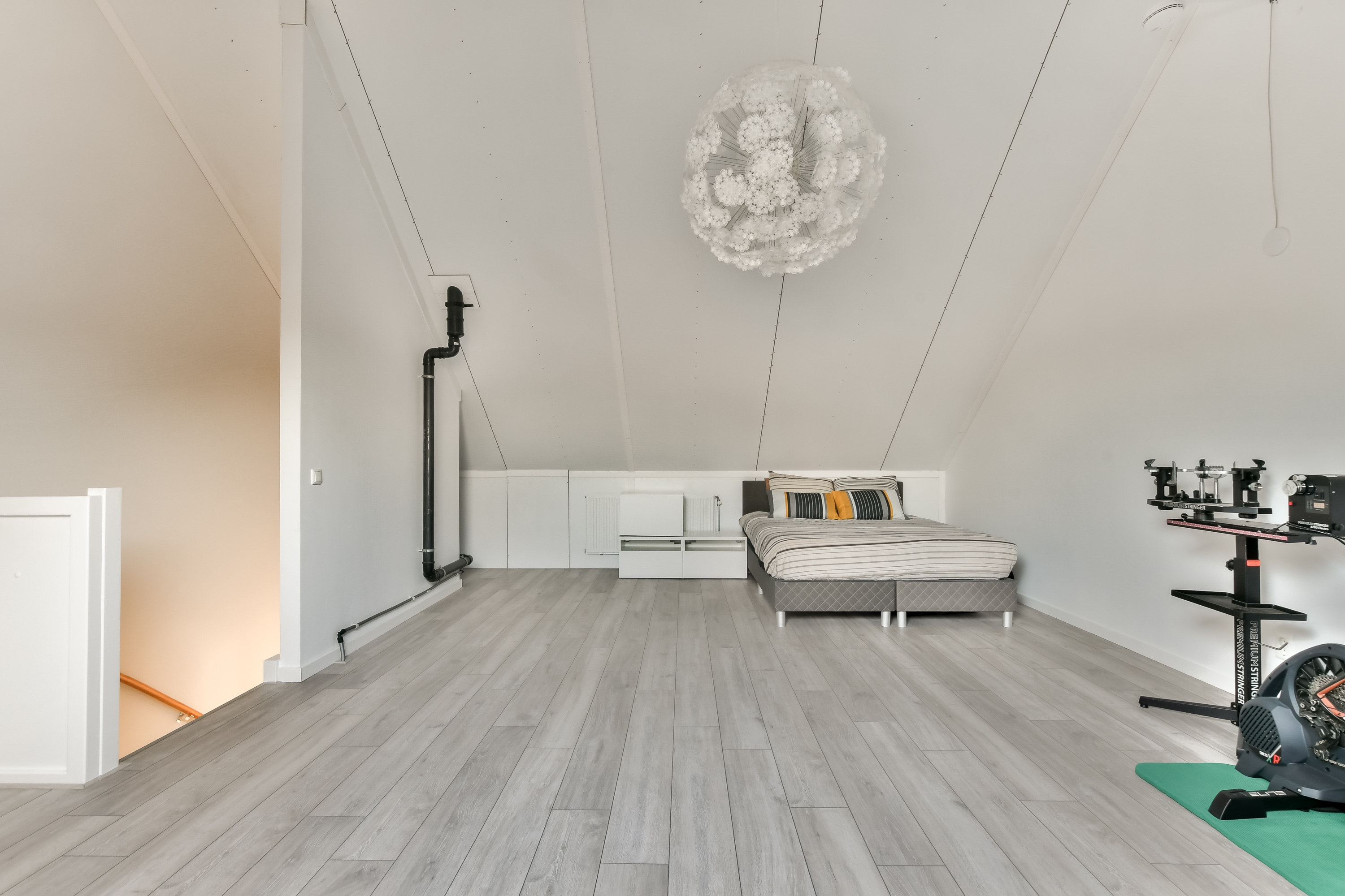 De zolderverdieping is een volwaardige extra etage met een royale vierde slaapkamer. Dankzij de hoge nok voelt deze ruimte extra ruim aan. Ook vind je hier de aansluiting voor wasmachine en droger. Ideaal als slaapkamer, werkruimte of hobbykamer. Van deze ruimte zou je eenvoudig zelfs 2 slaapkamers kunnen maken.