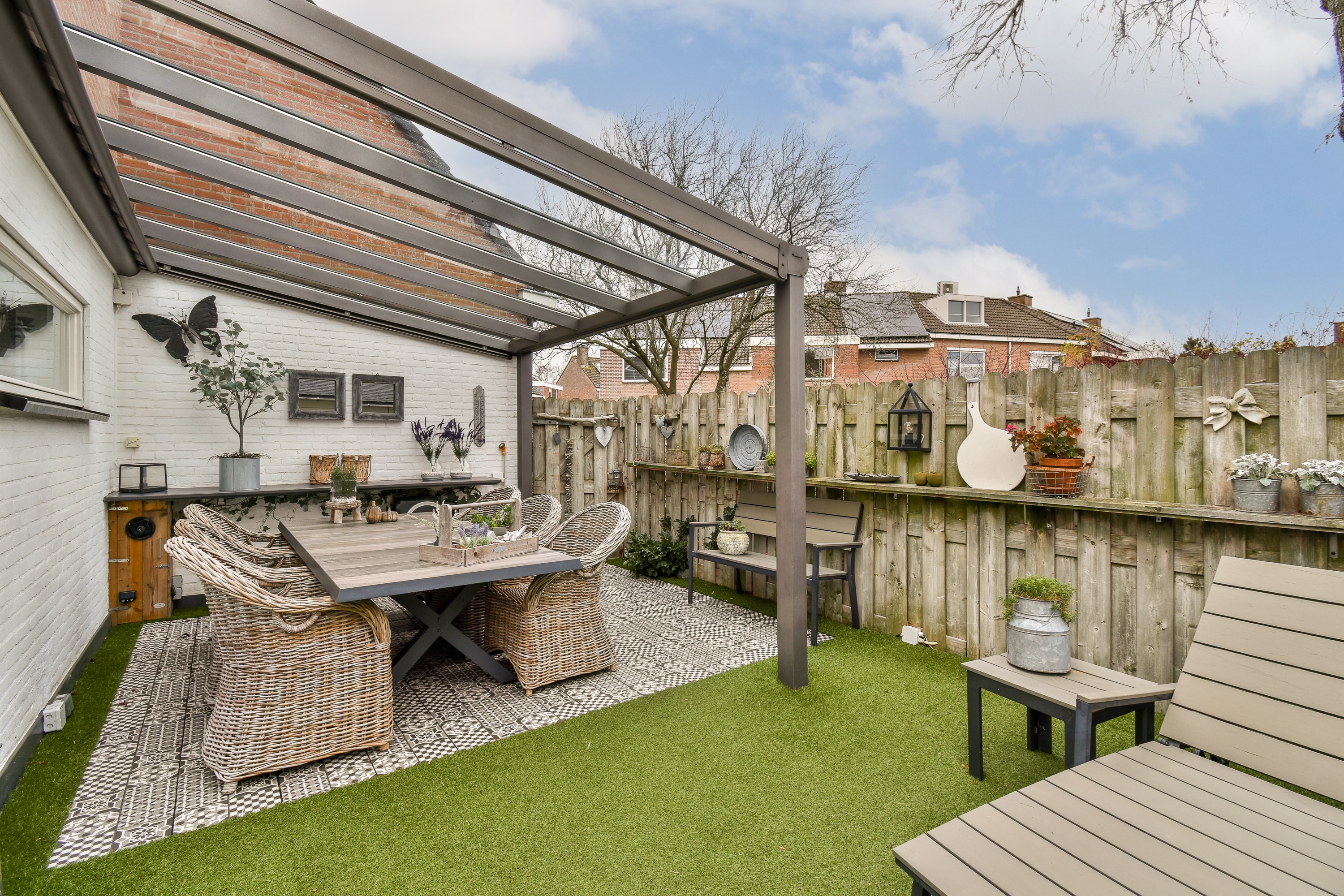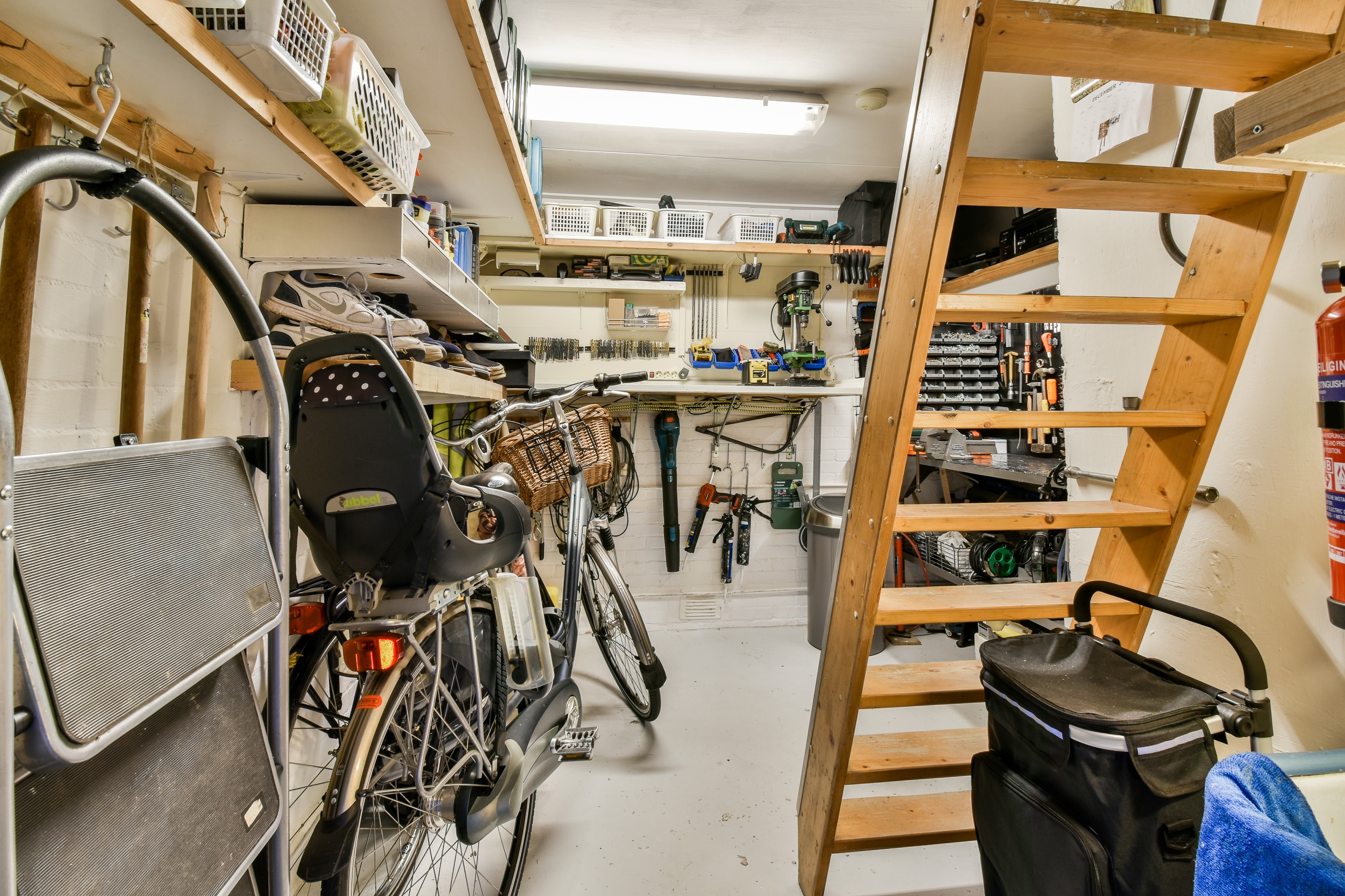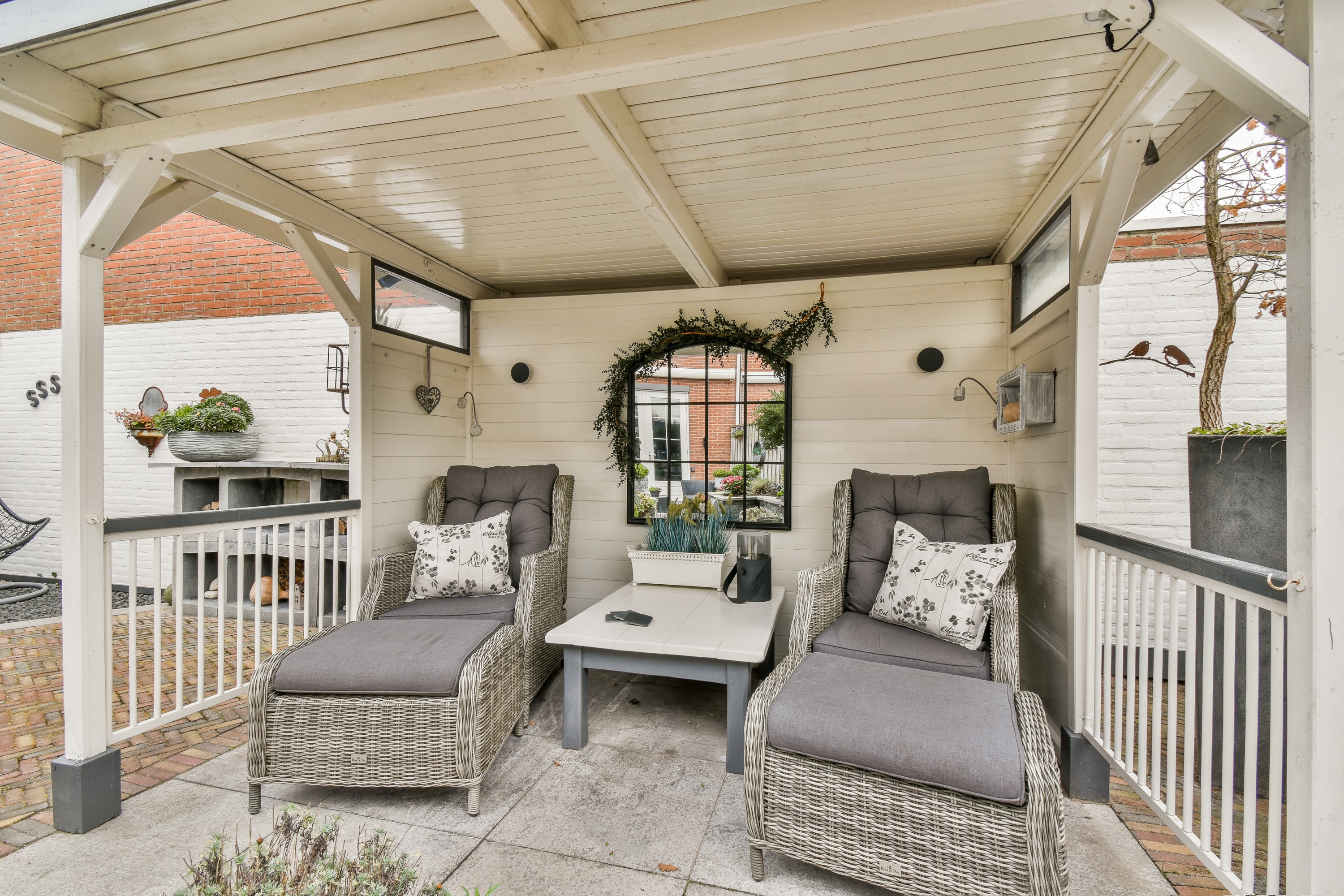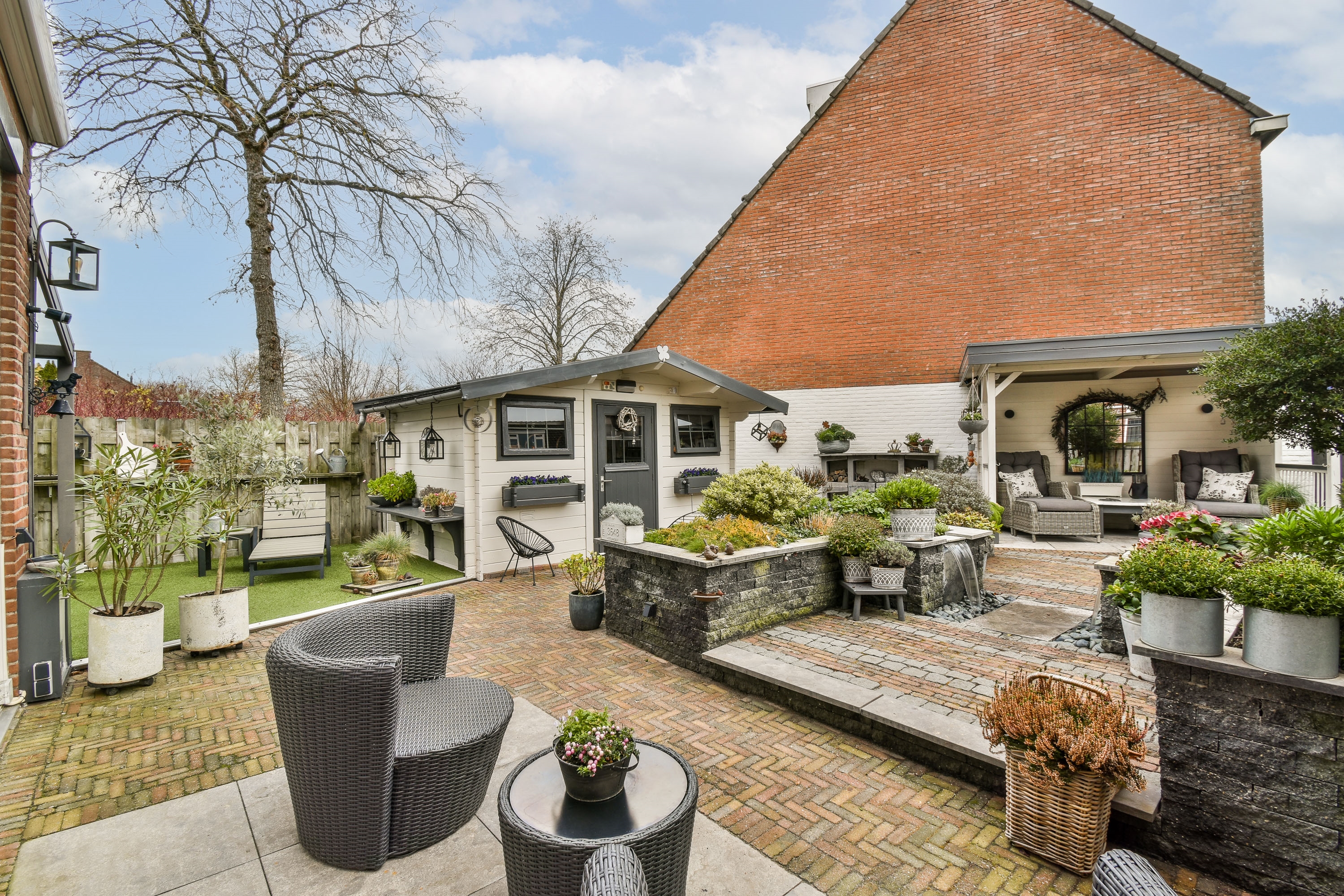Vanuit de woonkamer bereik je de tuin, die verrassend ruim is en meerdere zitplekken biedt. Onder de twee (!) overkappingen zit je hier het hele jaar beschut en gezellig. In de tuin is er een ruime blokhut aanwezig, ideaal voor fietsen, tuingereedschap en opslag. Aangebouwd aan de woning is er nog een berging met een etage, deze kan je natuurlijk gewoon als bergruimte gebruiken maar is ook ideaal als bijvoorbeeld een werkplek aan huis!