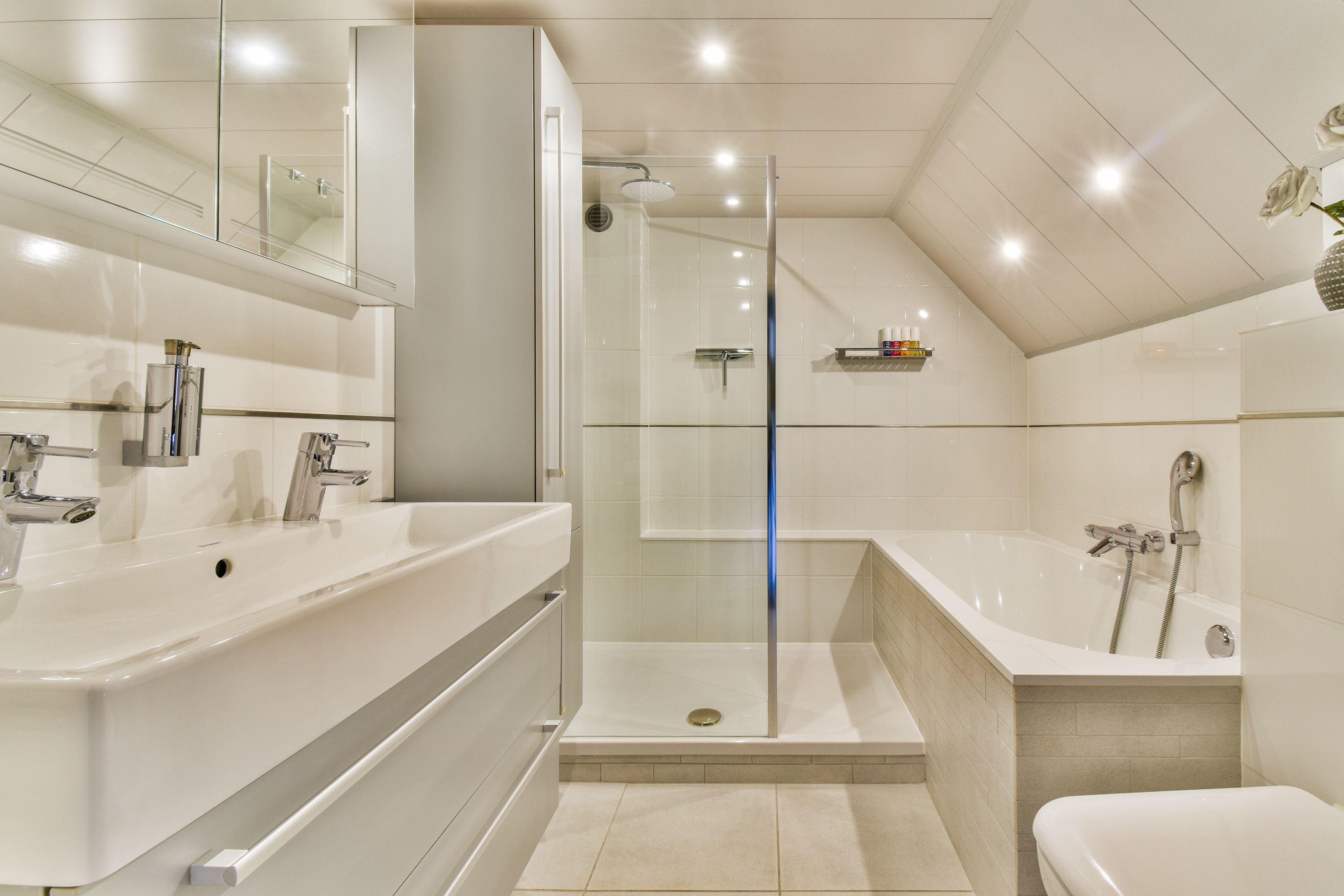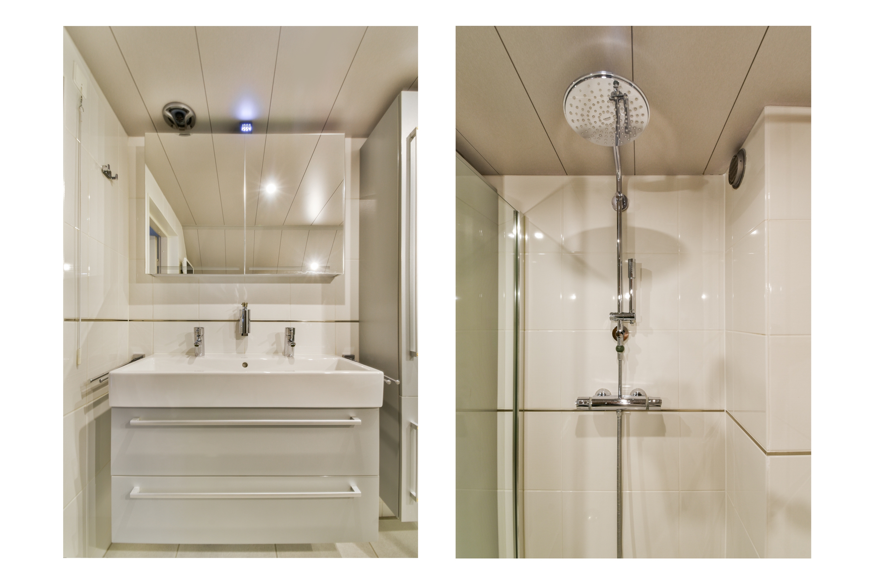 3. Moderne badkamer met inloopdouche, ligbad stereo radio en tv;