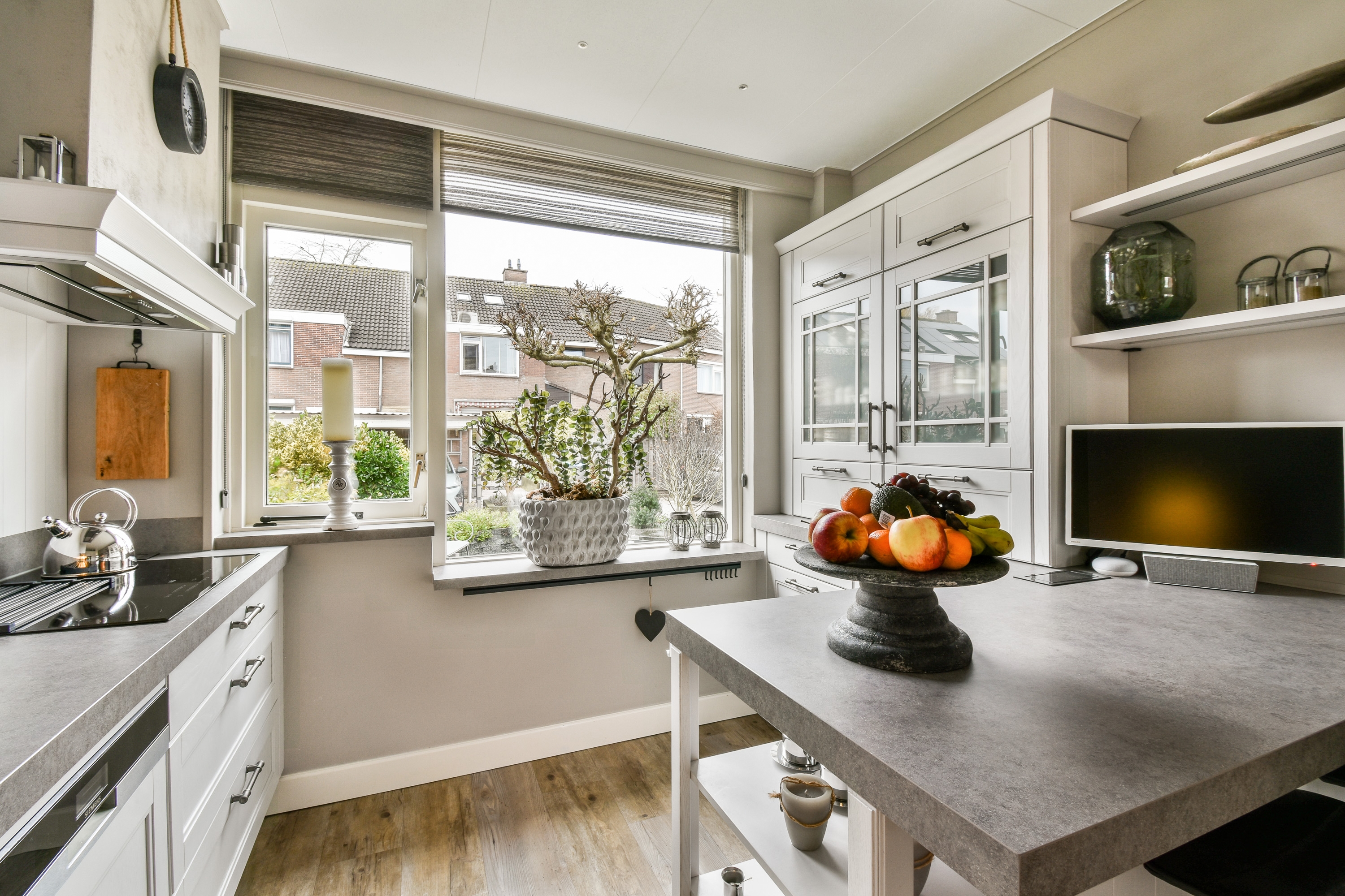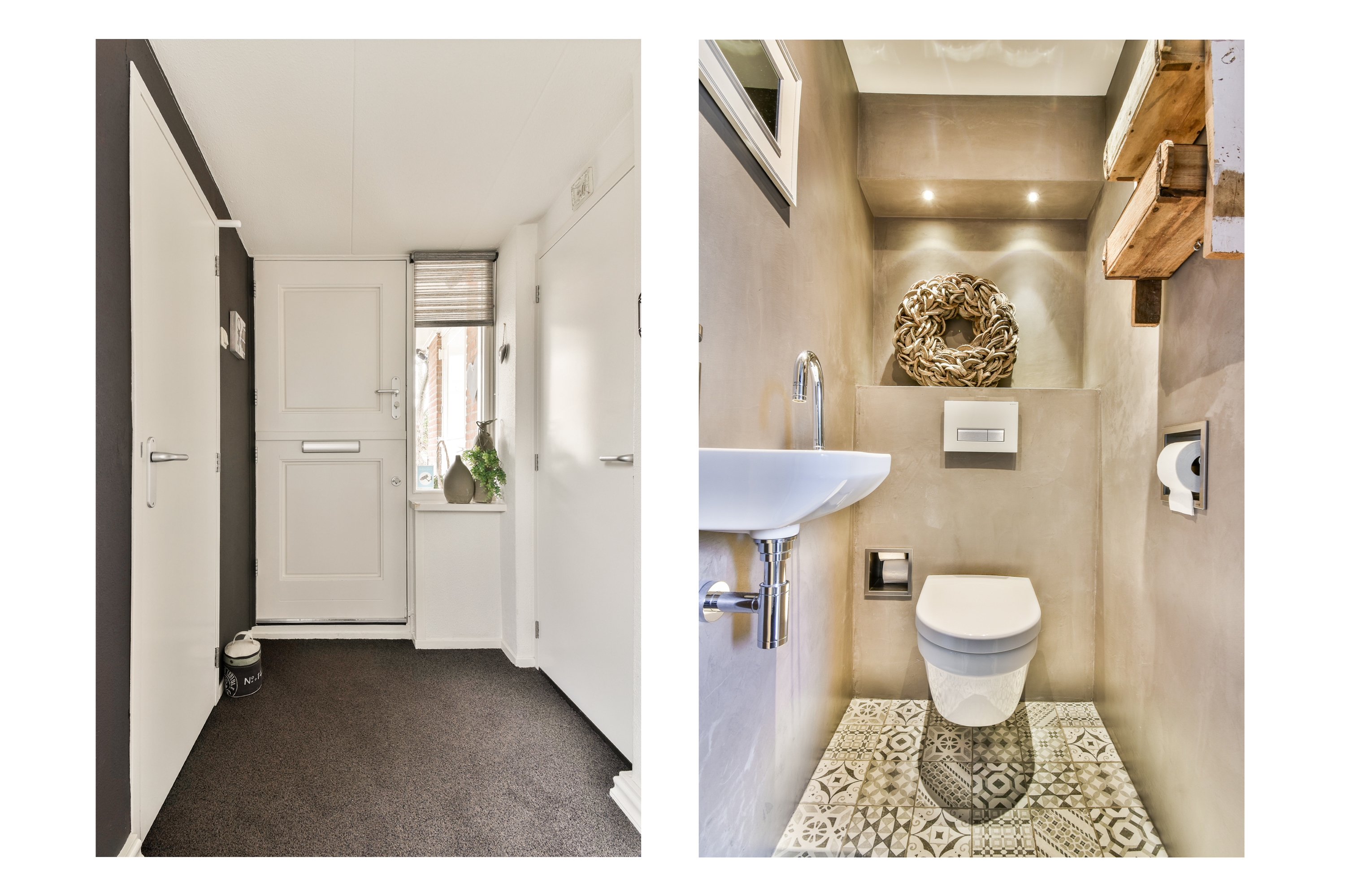 Via de entree kom je in de ruime hal met toilet, meterkast, de trap naar boven en toegang tot de woonkamer. De woonkamer is licht en sfeervol, met een prettige indeling voor zowel een gezellige zithoek als een royale eethoek. De openslaande deuren zorgen voor een fijne verbinding met buiten en halen het daglicht rijkelijk naar binnen. De keuken is aan de voorzijde, biedt volop werk- en bergruimte en is compleet met inbouwapparatuur: een combimagnetron, inductie kookplaat, afzuigkap, vaatwasser met verlichting, koelkast en een grote oven.