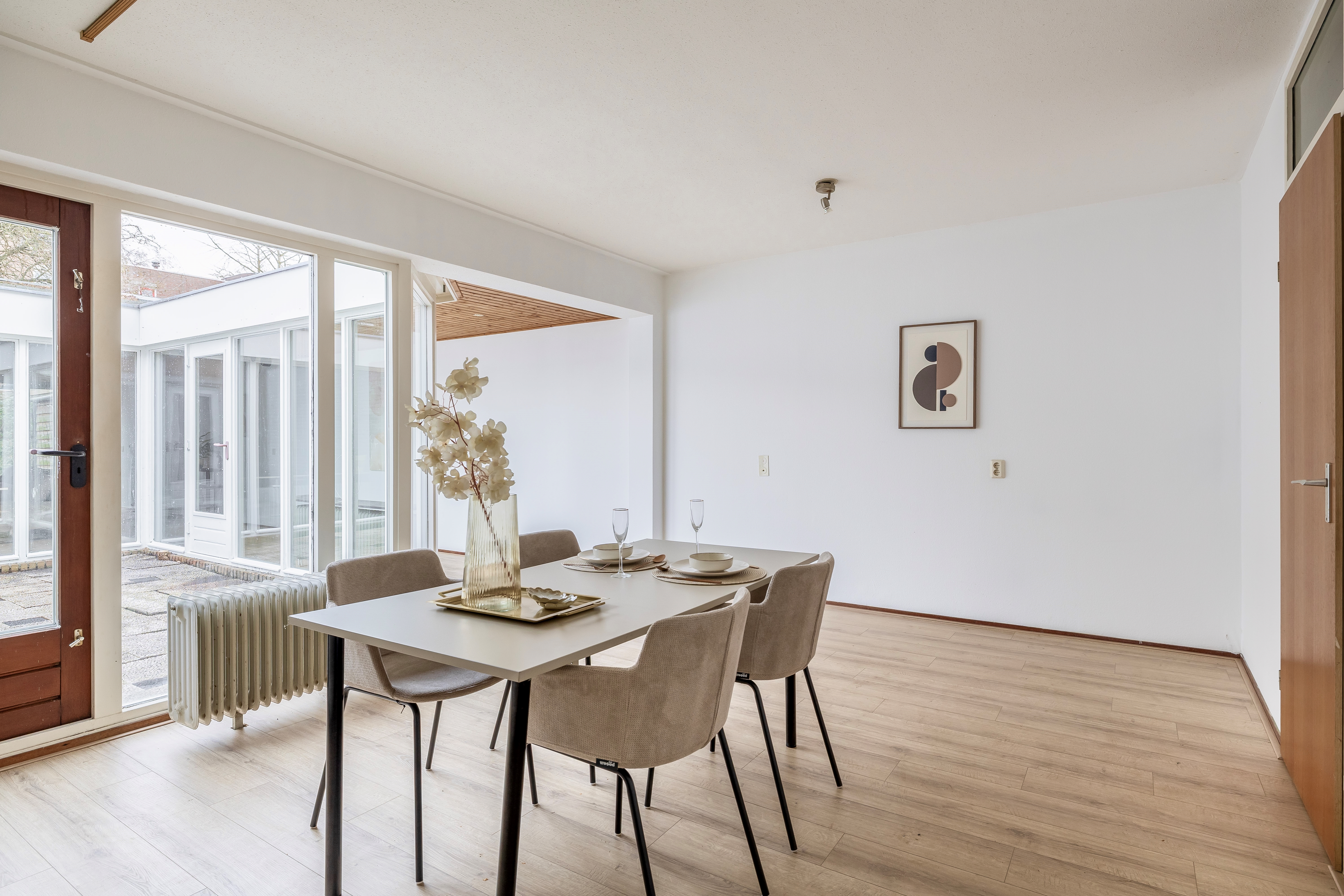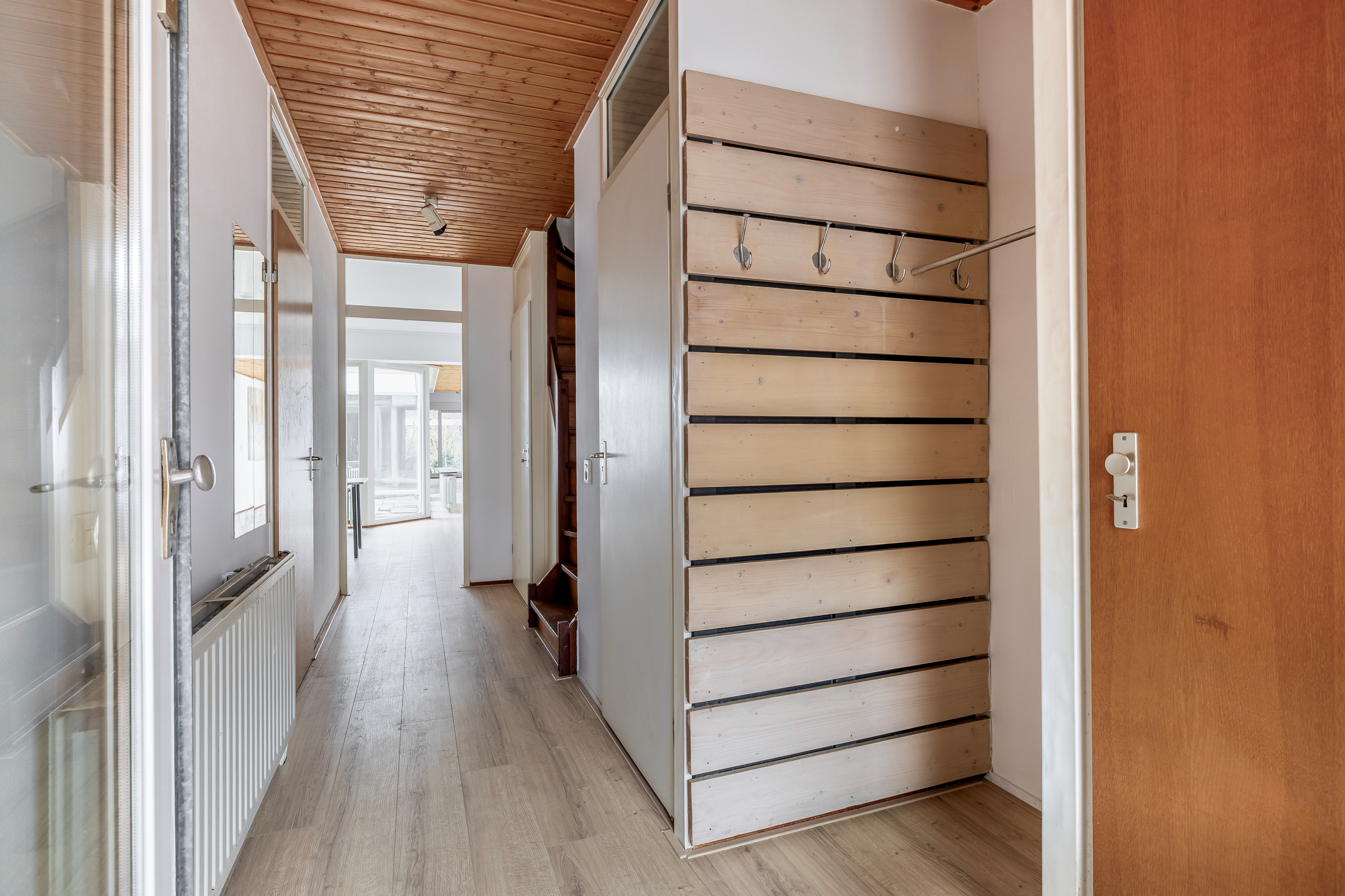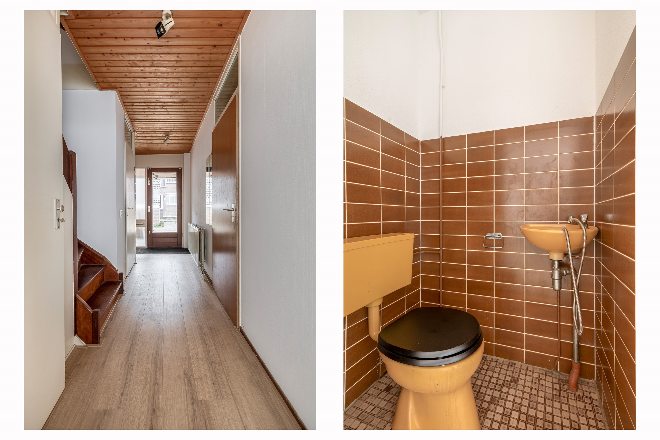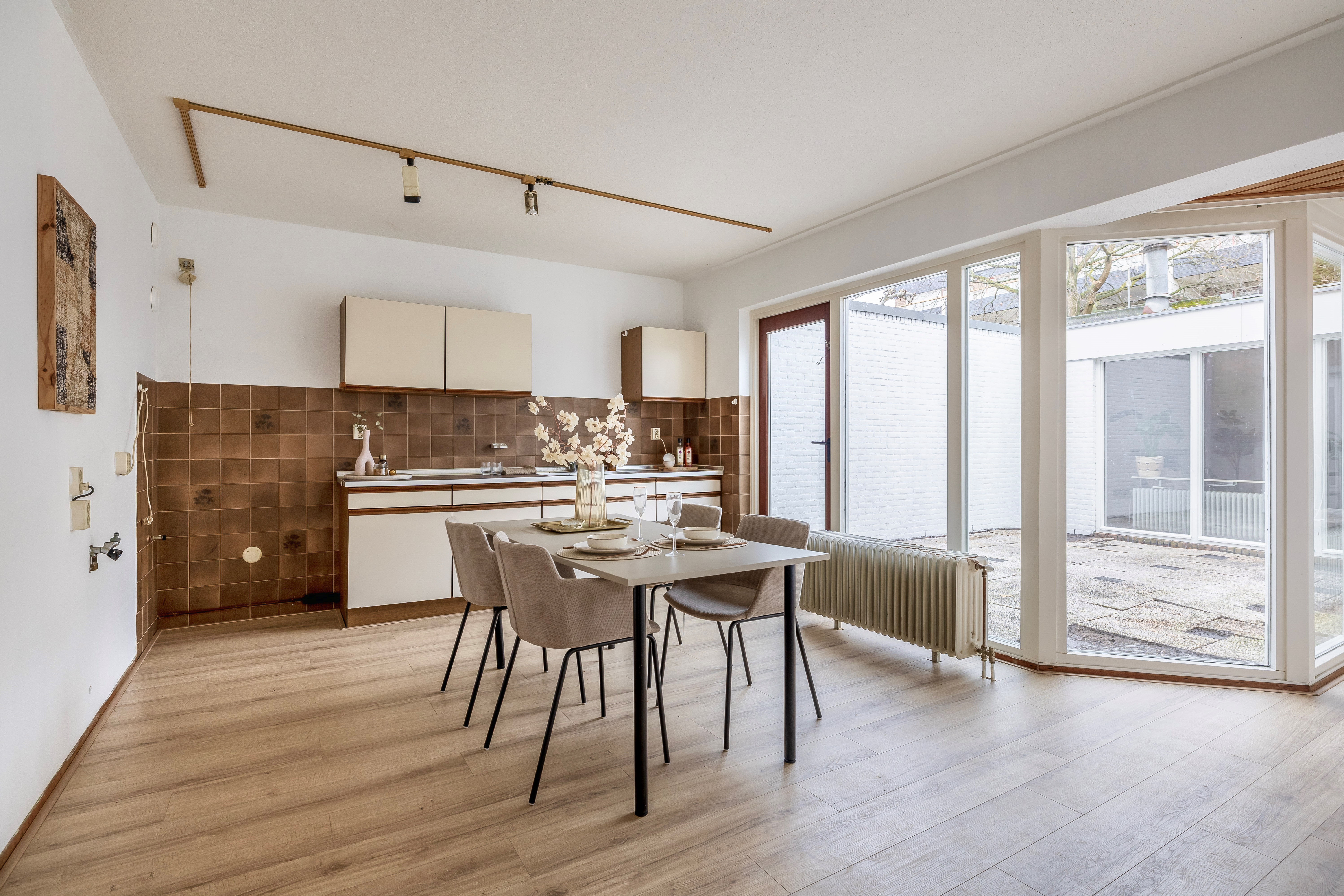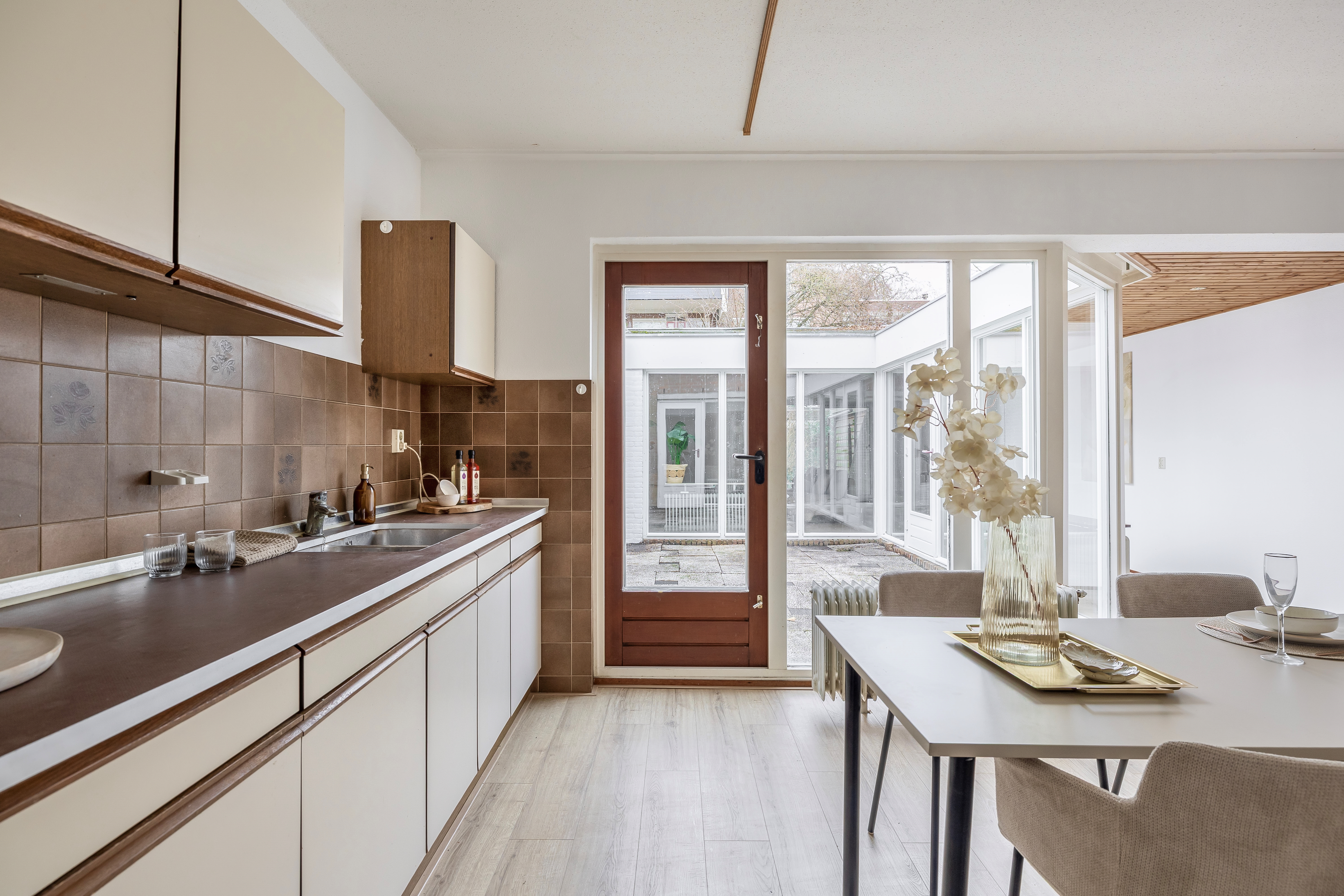 Je komt de woning binnen via de entree met hal, waar zich het toilet, de trapopgang en toegang tot de garage bevinden. Vanuit hier loop je door naar de ruime leefkeuken, met zicht op de patio. De keuken is functioneel, maar biedt volop kansen om deze helemaal naar eigen wens te vernieuwen. Vanuit de keuken heb je toegang tot de patio, wat zorgt voor een prettige verbinding tussen binnen en buiten.