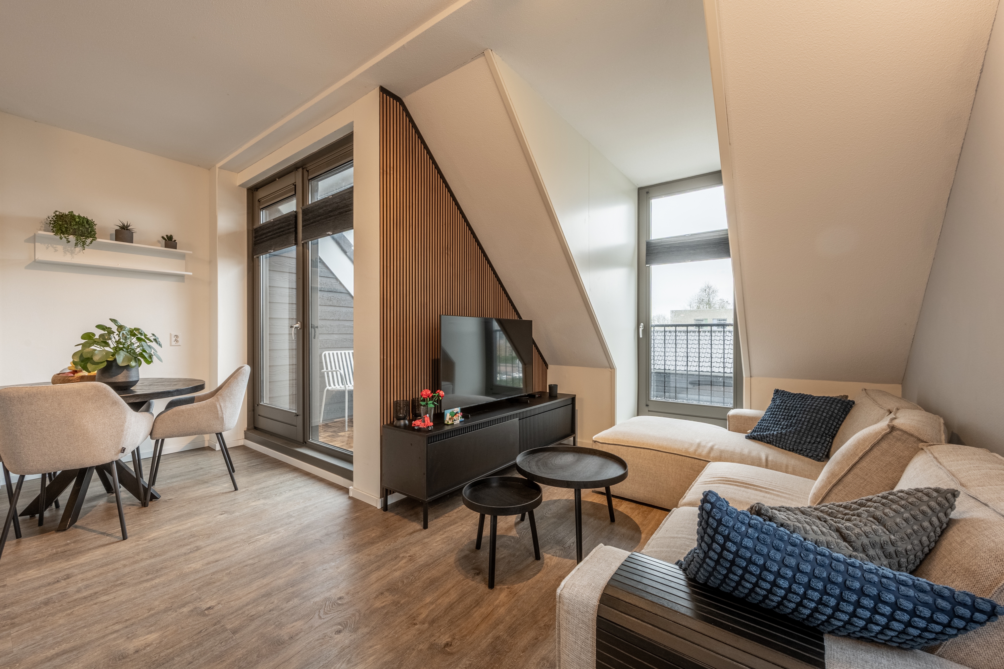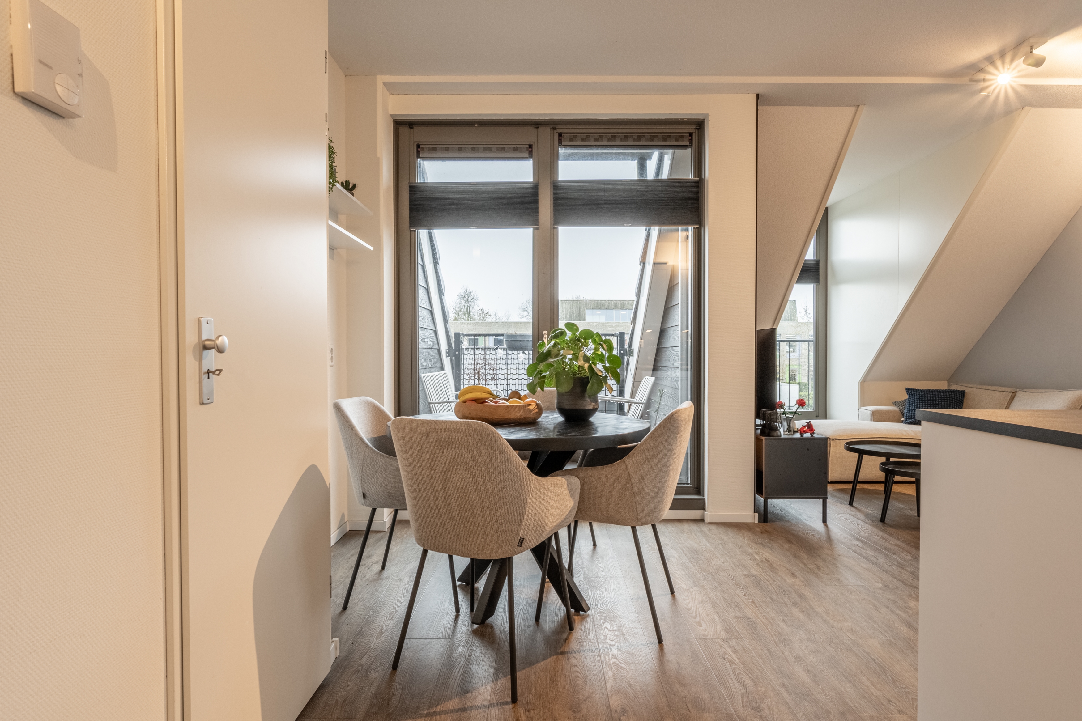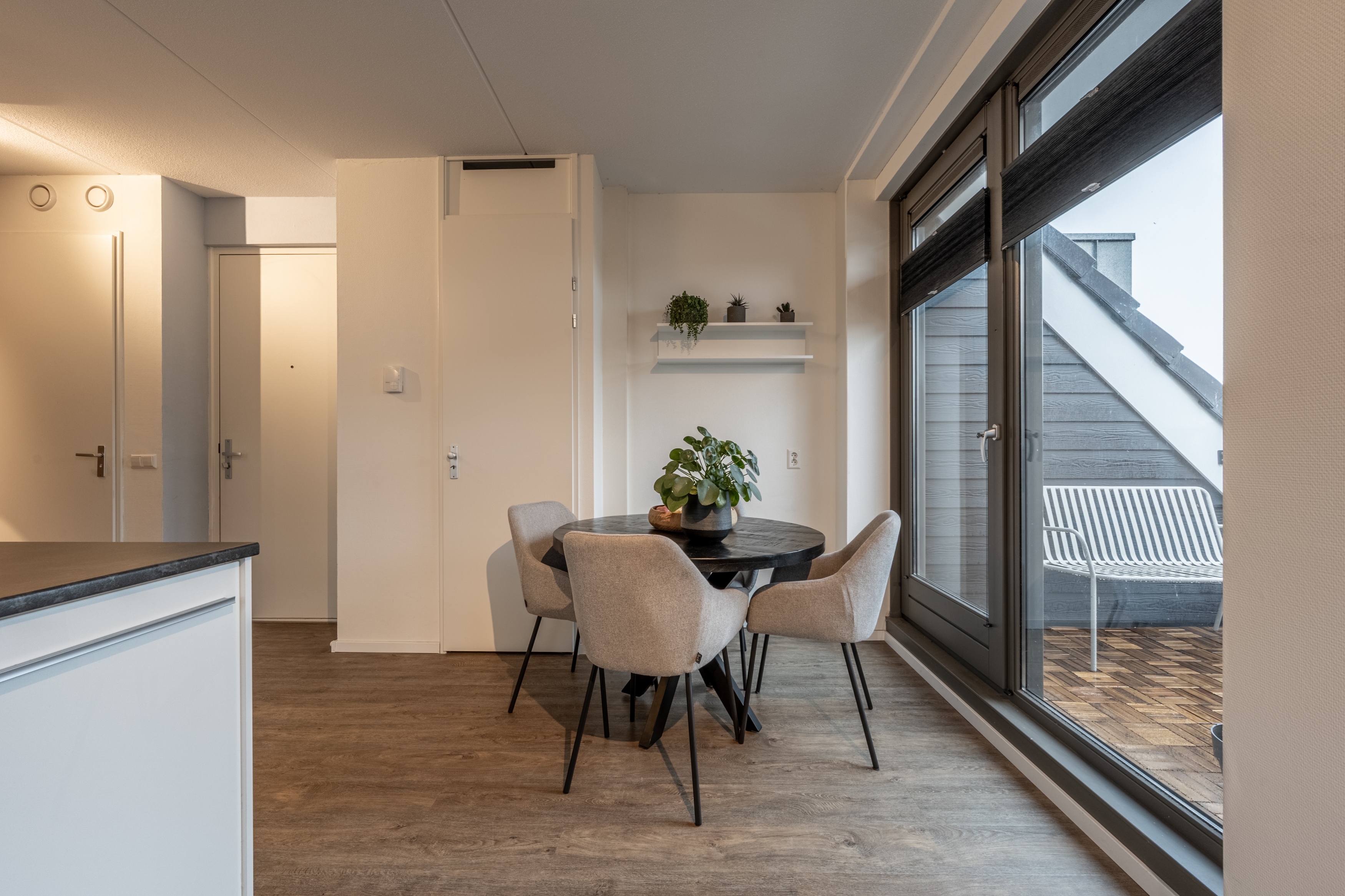 De ruime woonkamer is licht en sfeervol dankzij de grote ramen en biedt voldoende ruimte voor zowel een eet- als zitgedeelte. Vanuit hier heb je toegang tot het balkon op het zuidwesten. Een heerlijke plek waar je zó een gezellig zitje neerzet om van het buitenleven en de zon te genieten.