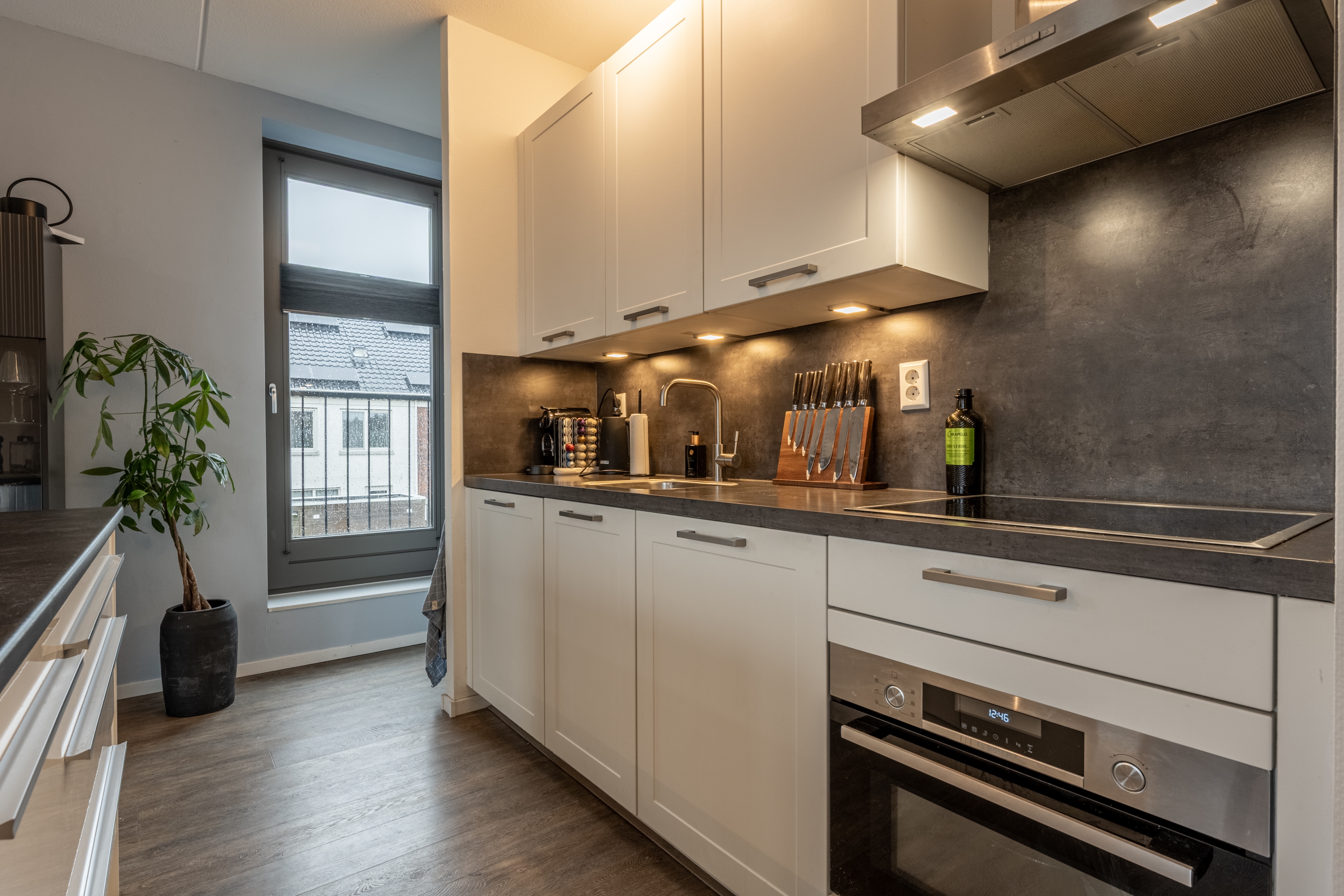 De open keuken met kookeiland is modern, overzichtelijk en voorzien van alle apparatuur die je nodig hebt: een inductiekookplaat, afzuigkap, koel-vriescombinatie en combimagnetron. Terwijl je kookt, kijk je fijn de woonkamer in; precies zo’n indeling die het wonen extra gezellig maakt. Naast de keuken bevindt zich bovendien een handige voorraadkast.