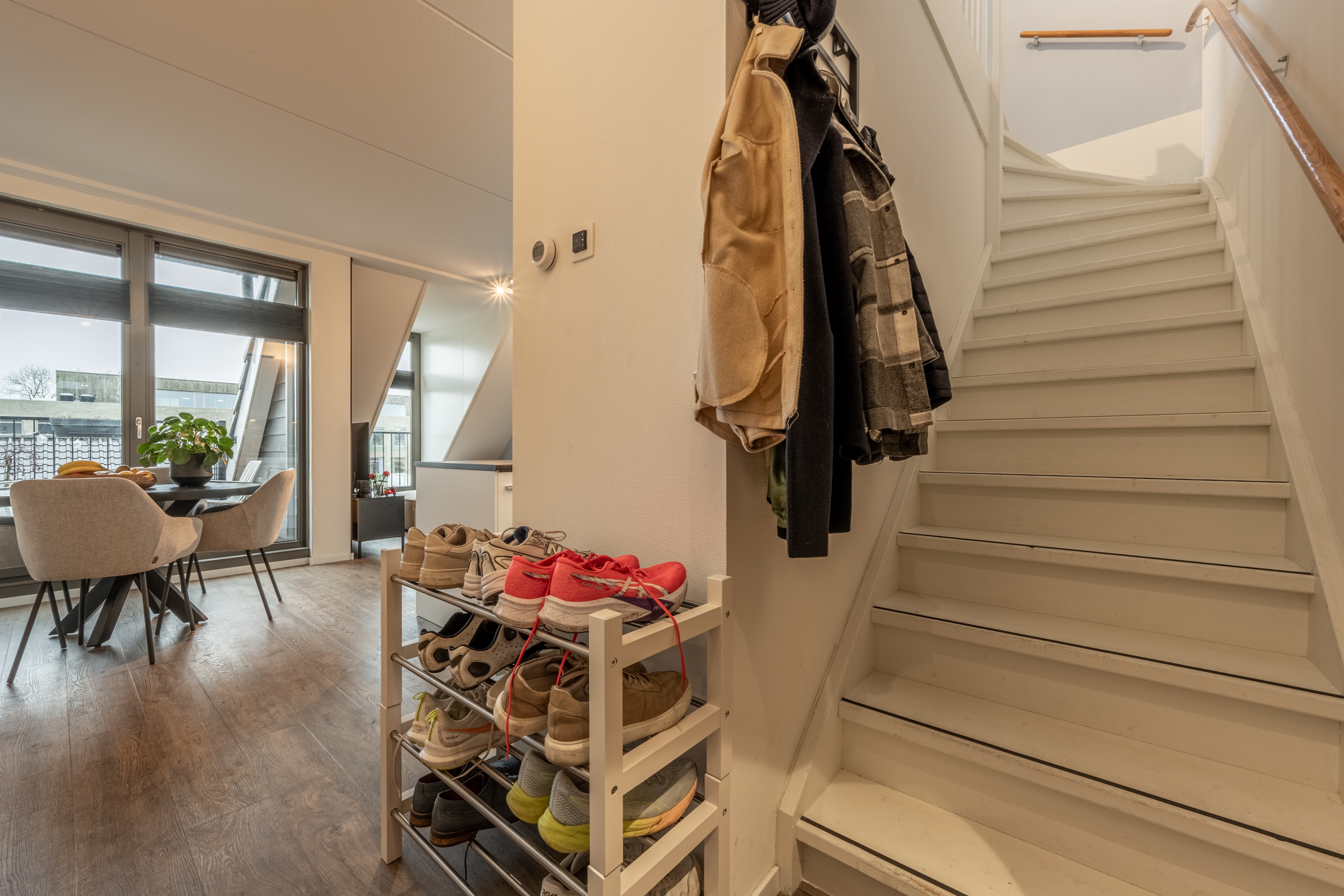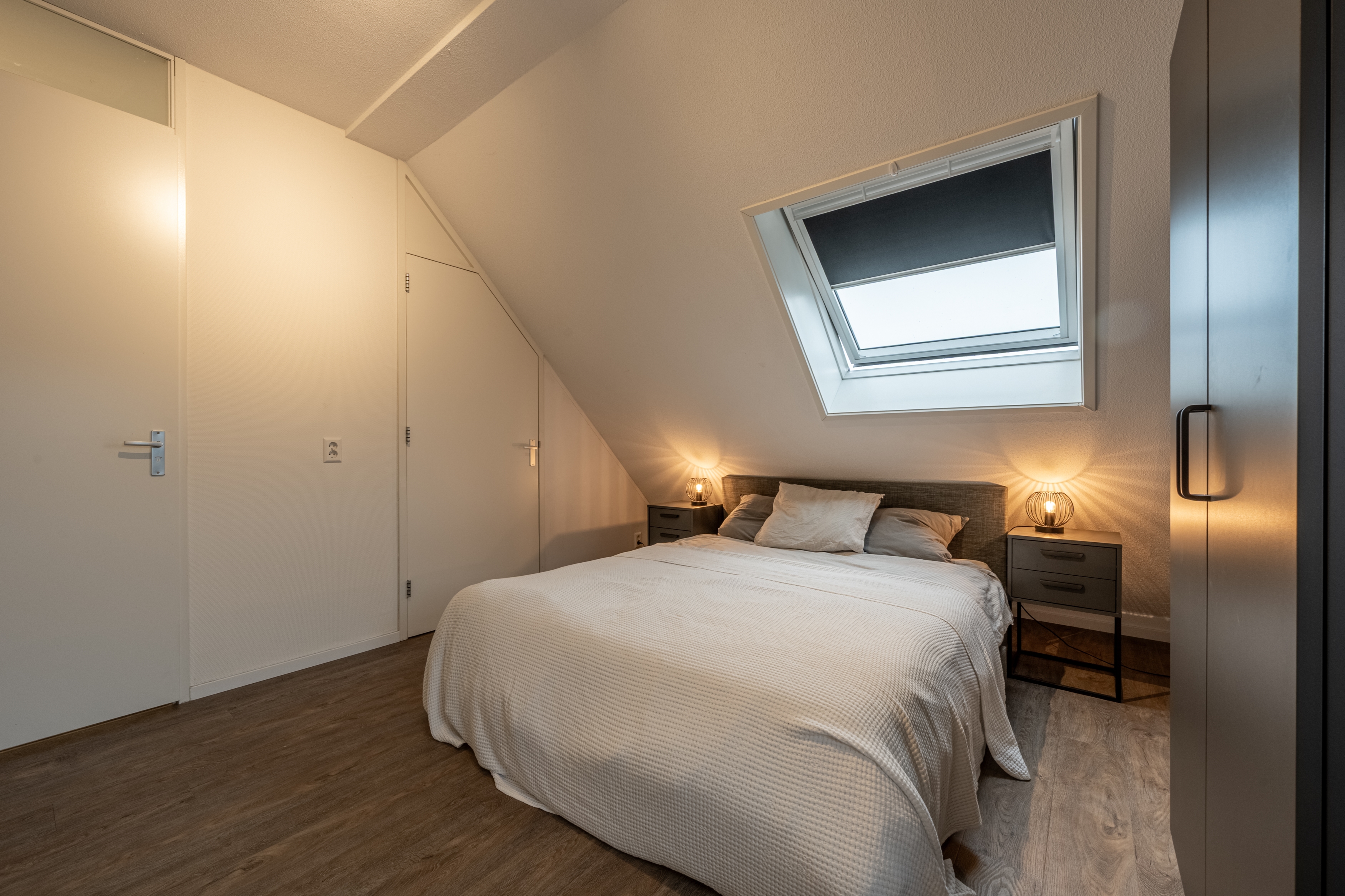 Op de tweede verdieping vind je de ruime slaapkamer, compleet met een groot dakraam en toegang tot de bergzolder via een vlizotrap — ideaal voor koffers, seizoensspullen en alles wat je uit het zicht wilt bewaren. Daarnaast is er nog een aparte bergruimte voor extra opslag en de opstelplaats van de CV-ketel.