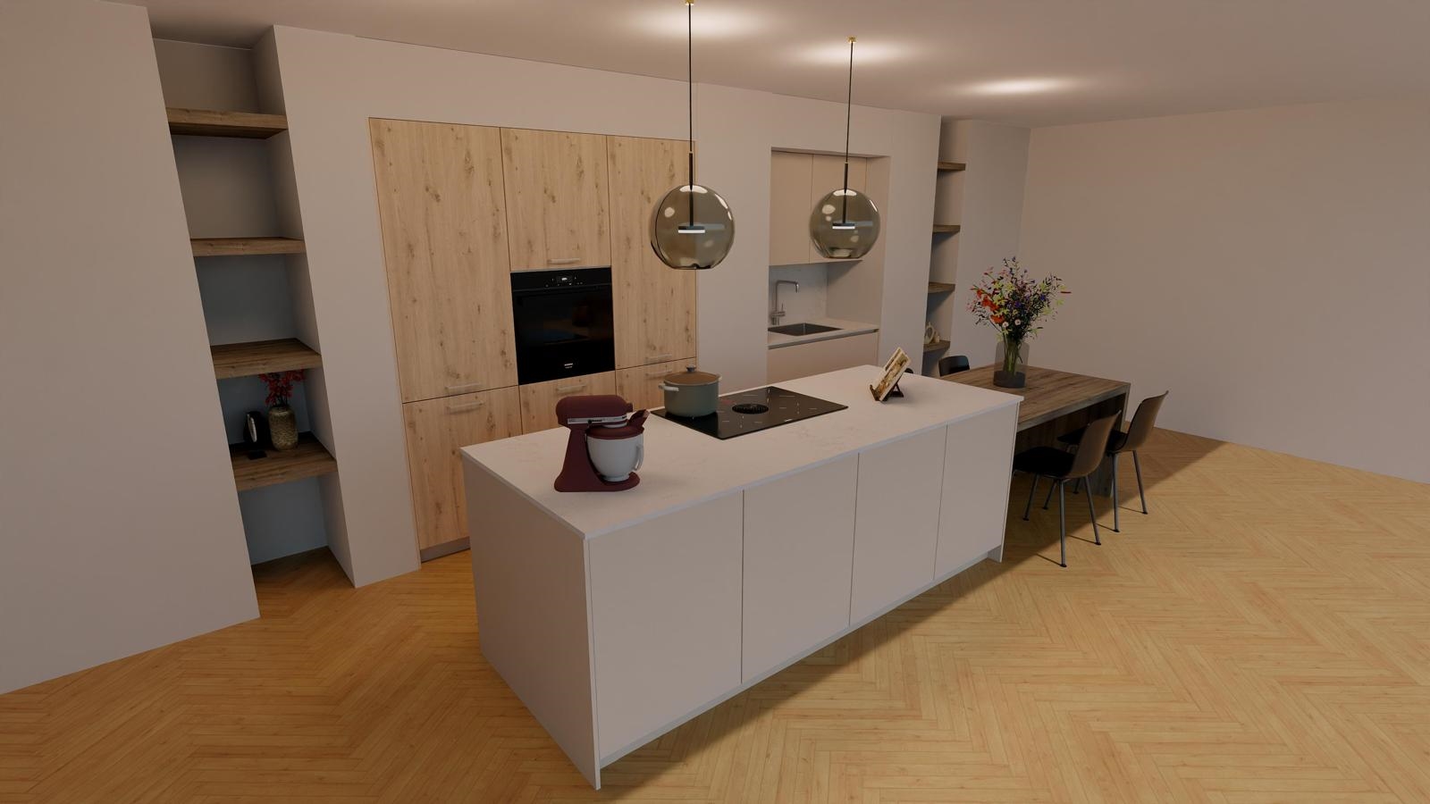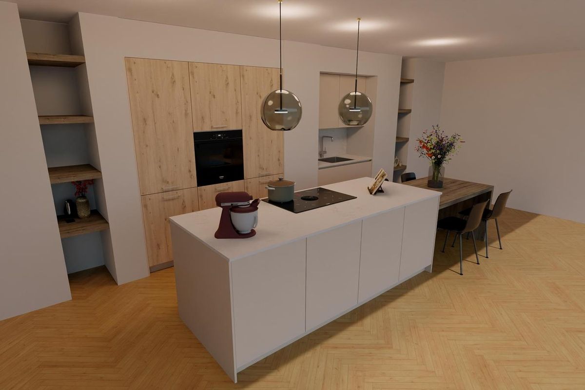 Aan de voorzijde bevindt zich de luxe eilandkeuken die straks het middelpunt van het huis vormt. Hier kun je uitgebreid koken terwijl je in contact blijft met familie of vrienden. De keuken wordt uitgevoerd met moderne inbouwapparatuur en veel werk- en bergruimte.