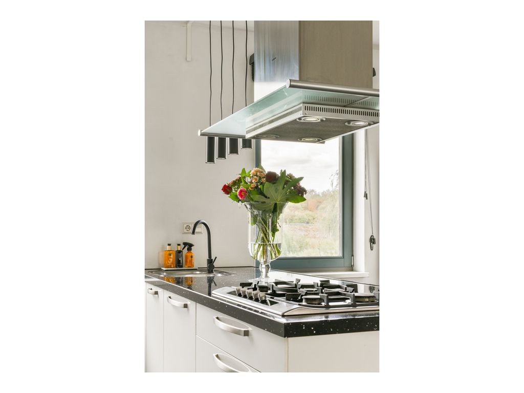 Hier vind je de lichte woonkamer met veel ramen en directe toegang tot het enorme, vergrote en volledig dichte terras op het zuiden. Het terras is een comfortabele uitbreiding van het woongedeelte en een plek om te genieten van een zonnige lunch tot lange zomeravonden met vrienden. De open keuken met kookeiland en bar is strak afgewerkt en compleet uitgerust met Siemens-inbouwapparatuur, waaronder een 5-pits gasstel, afzuigkap, vaatwasser, oven, magnetron en voldoende kastruimte. Tevens is er een kraanaansluiting voor een Amerikaanse koelkast aanwezig.
