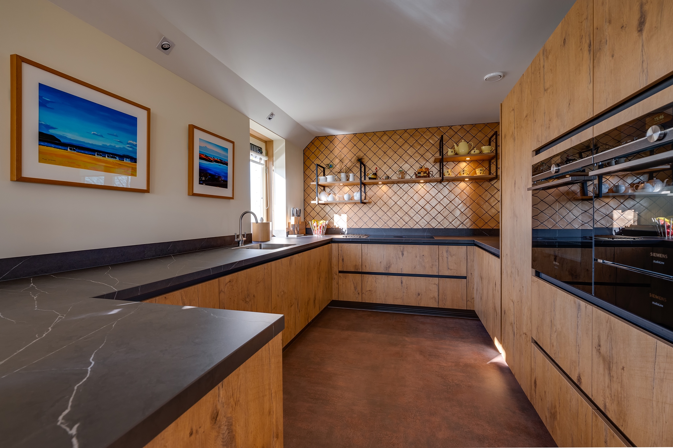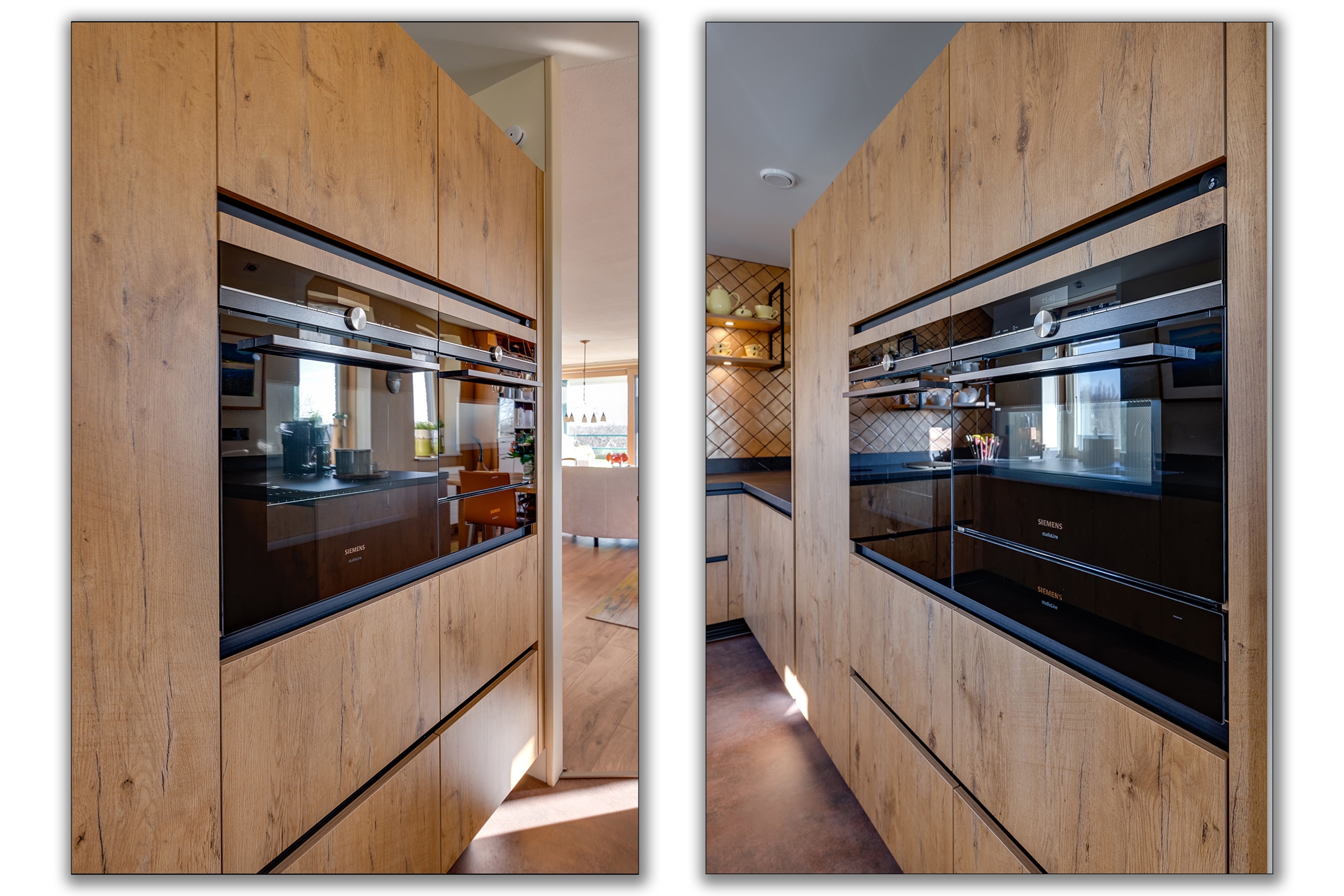 Aan de achterzijde ligt de luxe open keuken uit 2022. De greeploze houtlook kasten, het marmerlook composiet werkblad en de hoogwaardige apparatuur – waaronder combimagnetron, oven, warmhoudlade, koelkast, vriezer, vaatwasser, Bora-inductiekookplaat, wijnkoelkast en boiler – geven de ruimte een hotel-chique uitstraling. Hier kook je met uitzicht én comfort. De gehele verdieping is strak afgewerkt en voorzien van een moderne laminaatvloer (2022).