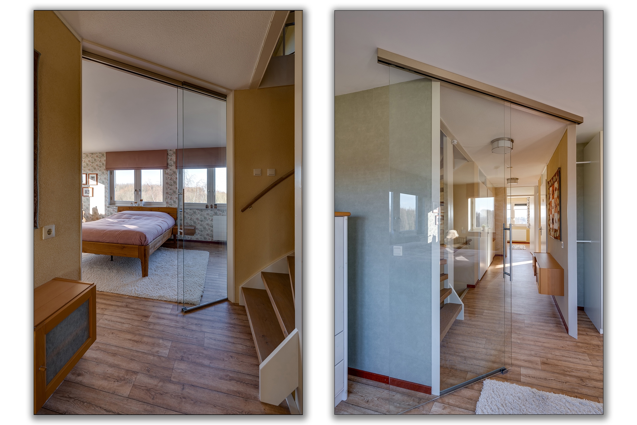 Met de lift bereik je de woonverdieping. Je stapt binnen in een royale hal met grote raampartijen en direct dat vrije uitzicht op het bos – wat een binnenkomer! Hier vind je het moderne toilet, de trap naar boven en toegang tot de woonkamer.