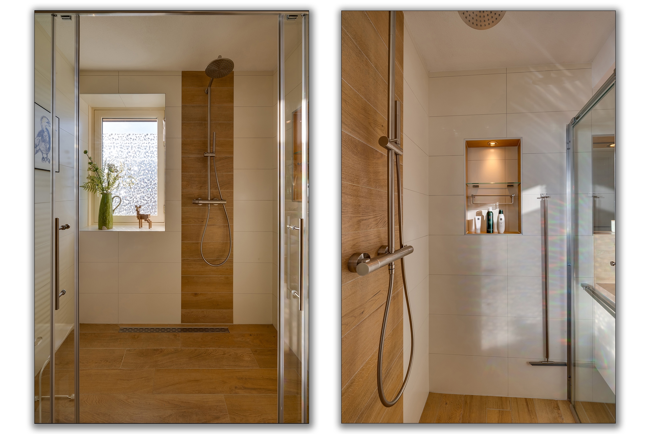 De badkamer voelt als een privé-spa met een grote inloopdouche, dubbele wastafel met waskommen en design handdoekradiator. Ook is er een separaat modern toilet aanwezig. Verder vind je hier een aparte wasruimte met aansluitingen voor wasmachine en droger en een uitstortgootsteen.