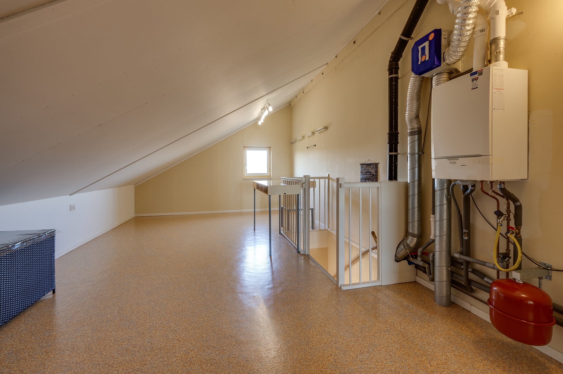 De bovenste verdieping maakt het woonhuisgevoel compleet. Hier vind je een indrukwekkend ruime zolderverdieping die je kunt gebruiken als kantoor, fitnessruimte, chillruimte voor tieners of extra slaapkamer. Daarnaast is er nog een vierde slaap-/werkkamer met vaste kastenwand. Ook bevinden zich hier de CV-installatie en mechanische ventilatie.