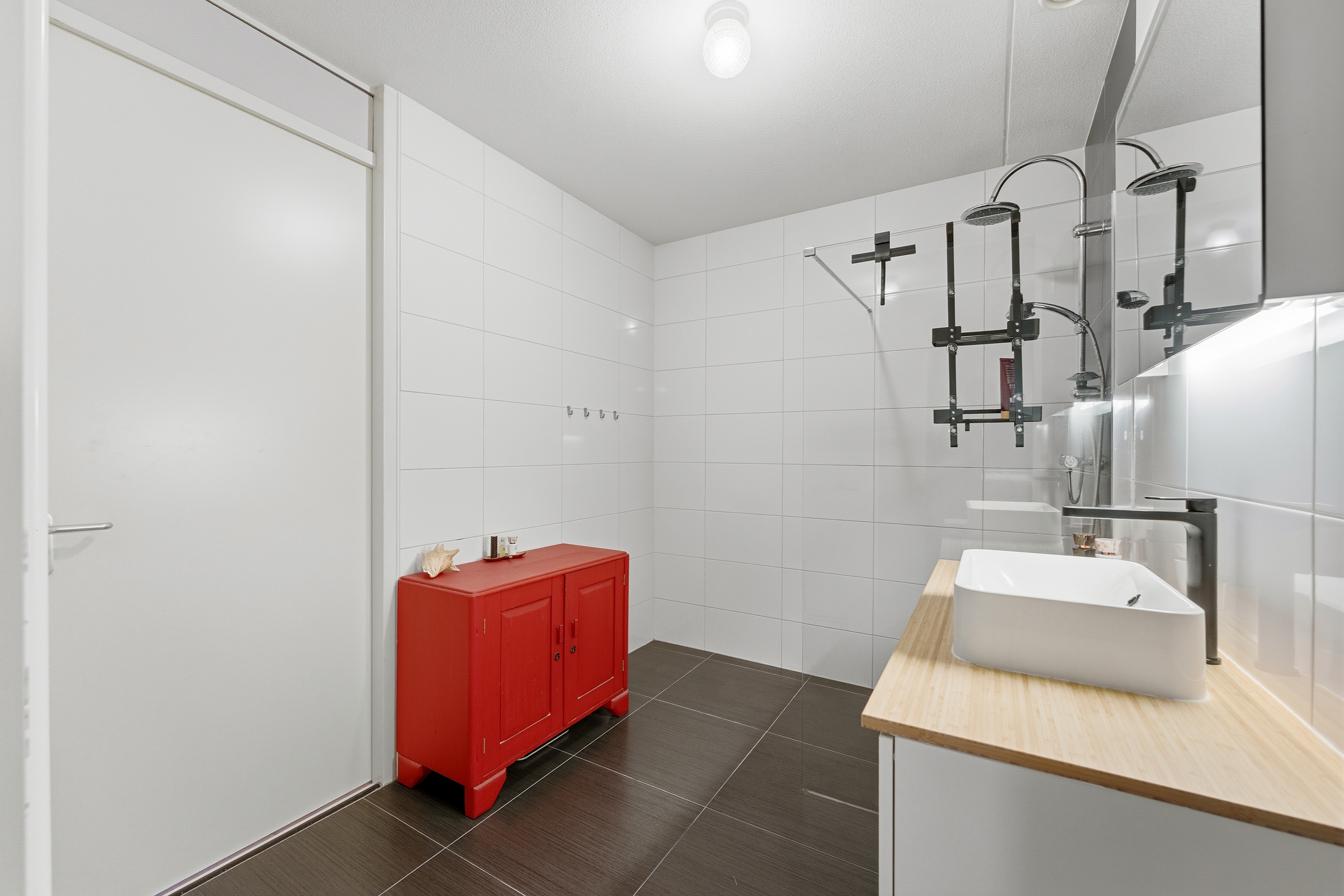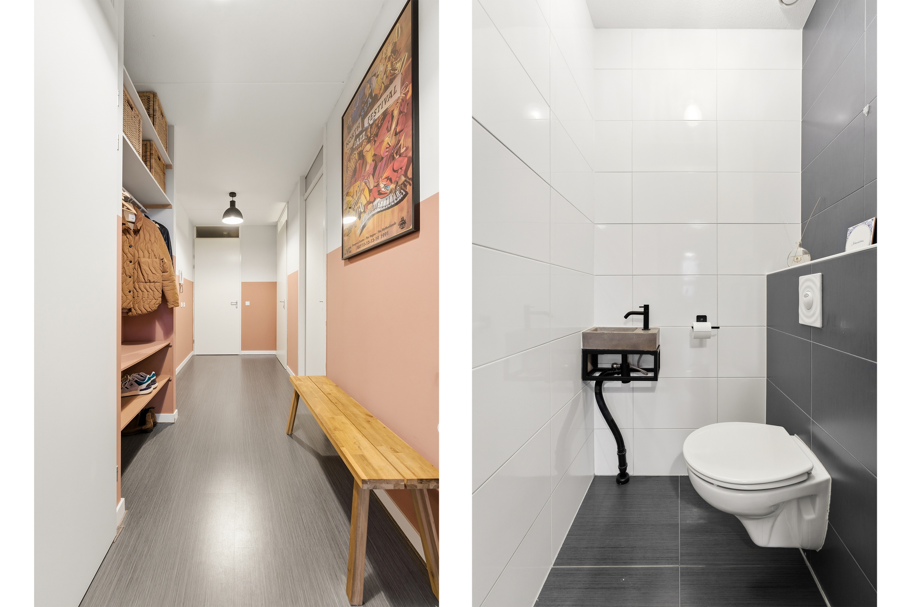 De hal is voorzien van de meterkast, inpandige berging en toiletruimte. De inpandige berging is v.v. een wasmachine-/drogeraansluiting, de opstelplaats van de C.V.-ketel en mechanische ventilatie unit én biedt extra opbergmogelijkheden voor huishoudelijke spullen of voorraad. Een zeer praktische toevoeging die zorgt voor een opgeruimde woning. De toiletruimte is volledig betegeld in een antraciet/witte kleurstelling en is v.v. een zwevend toilet met fonteintje.