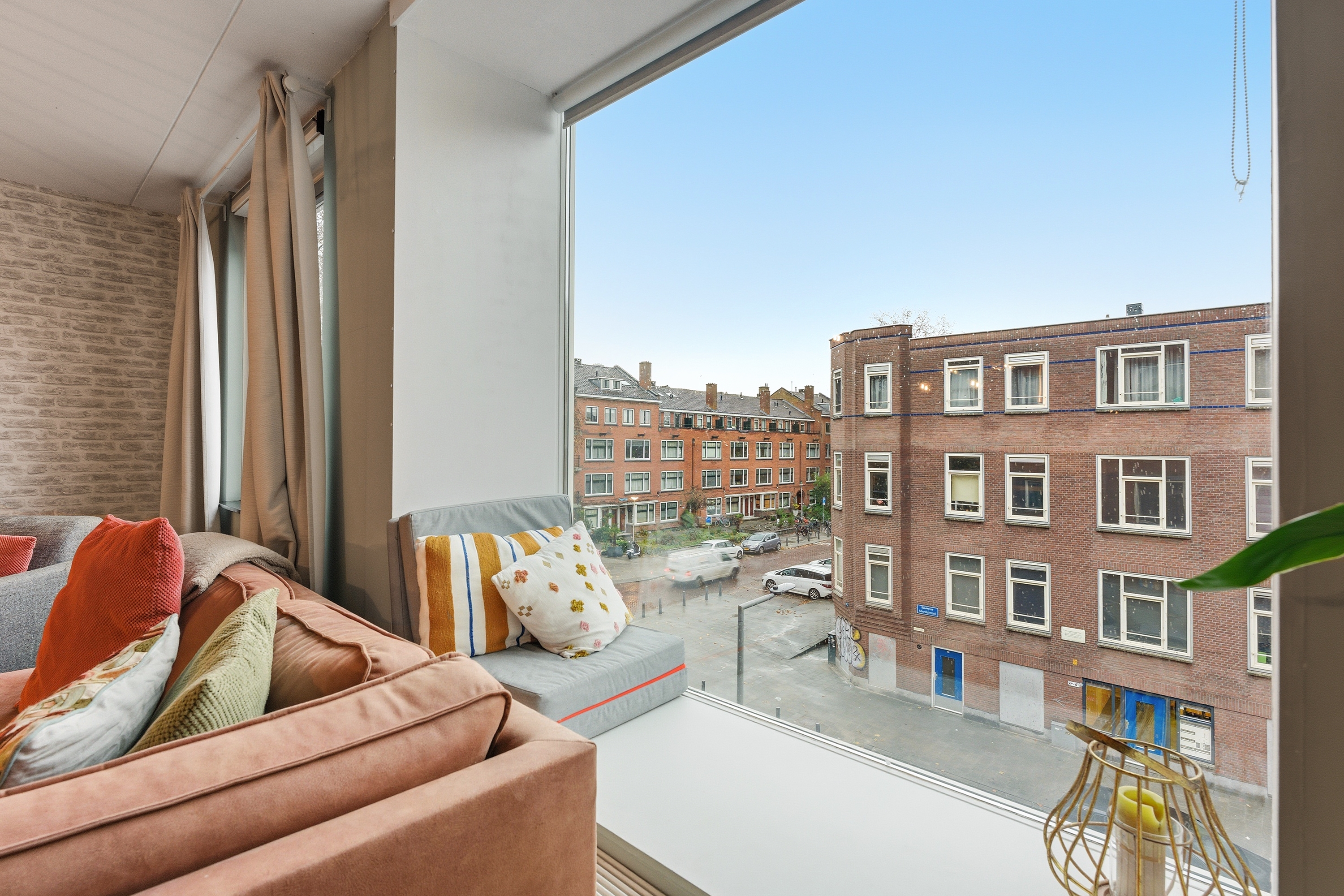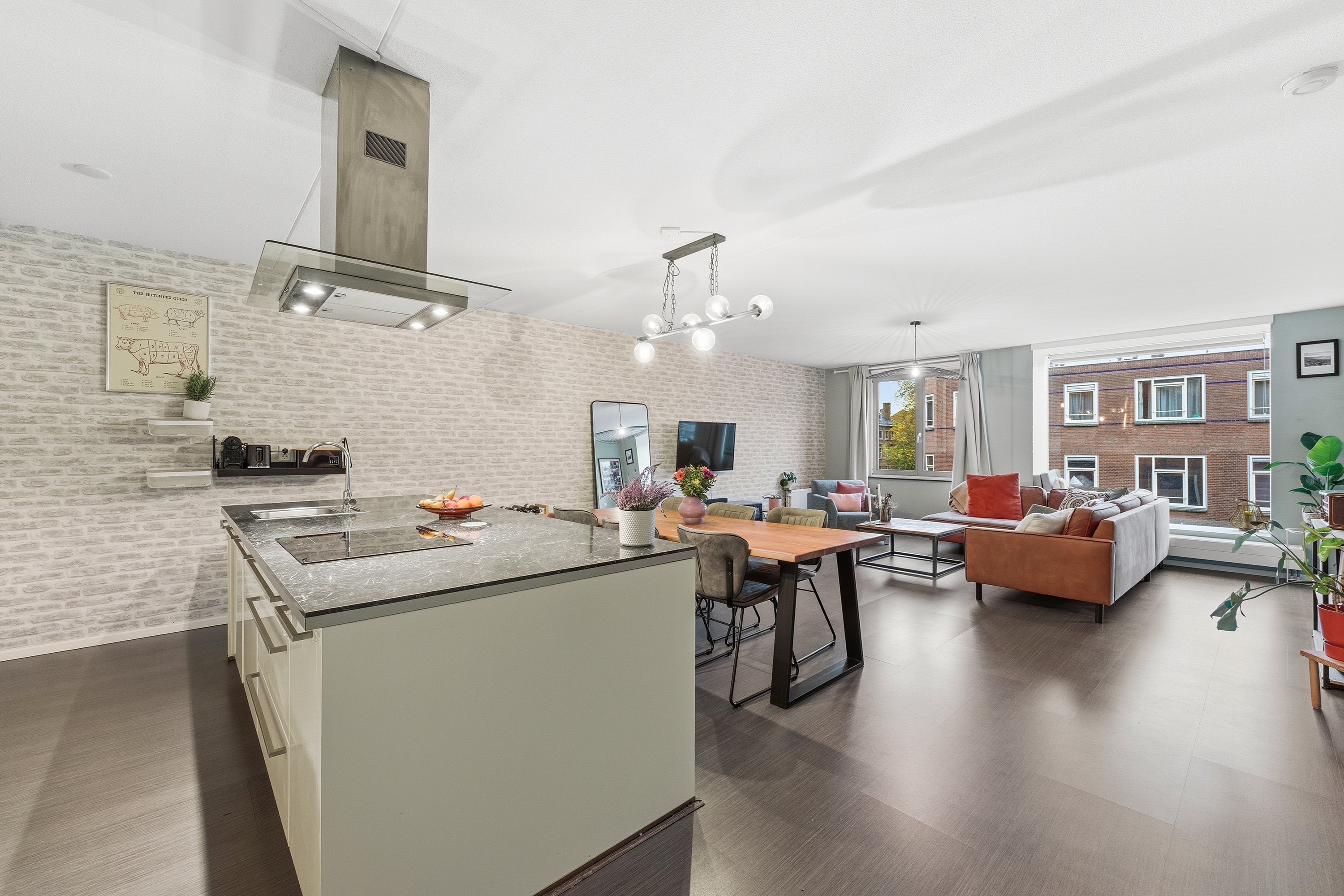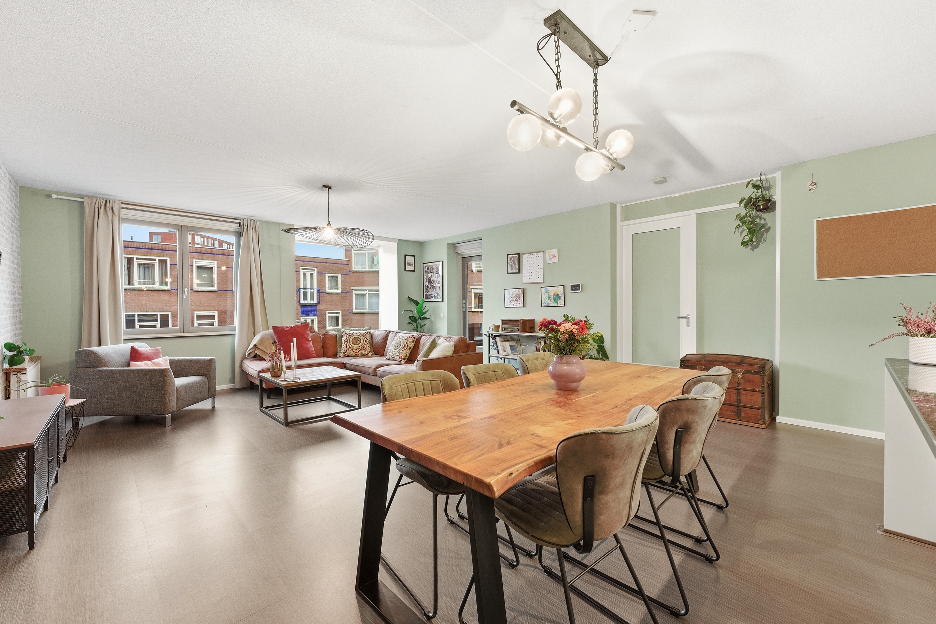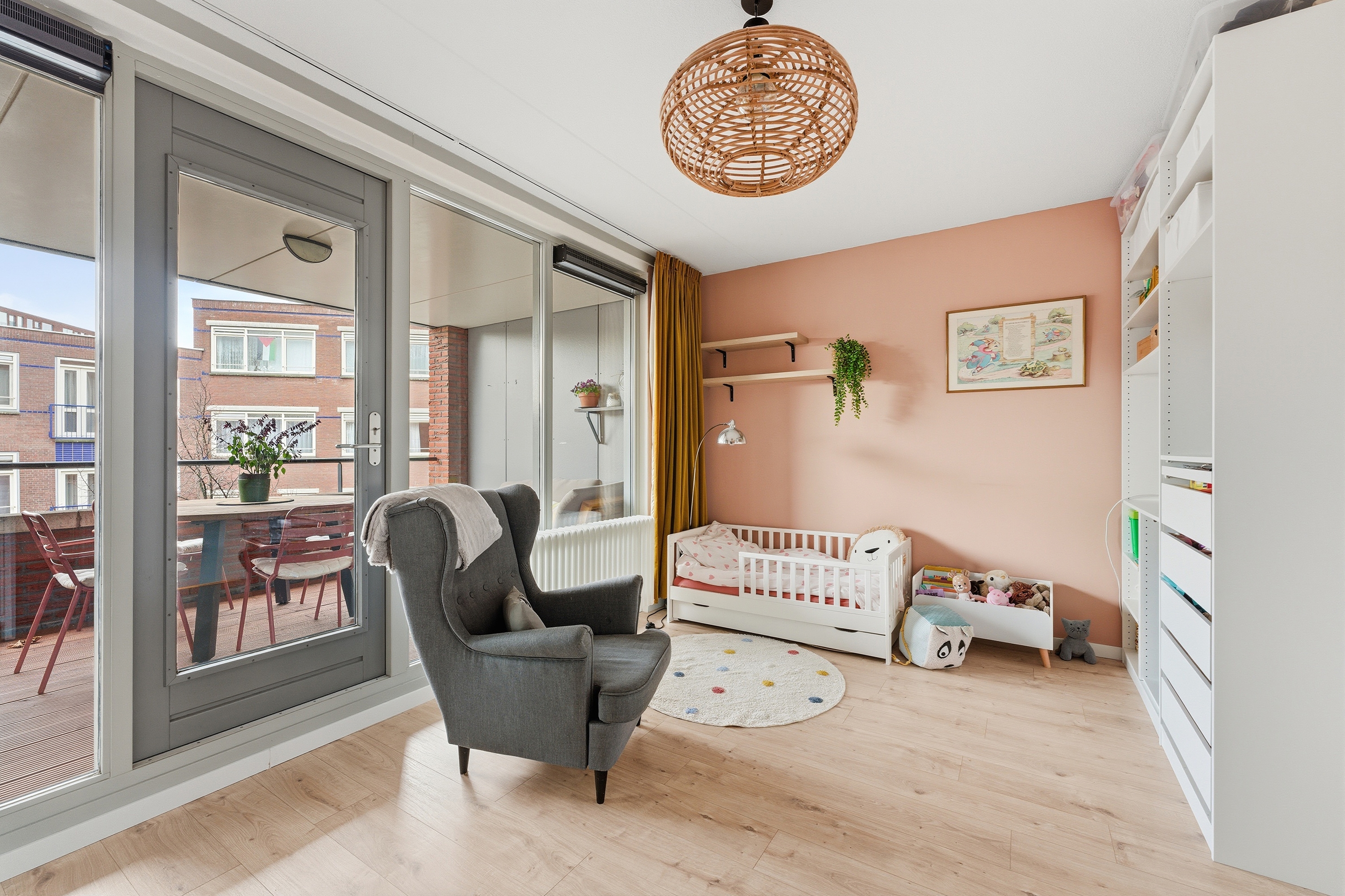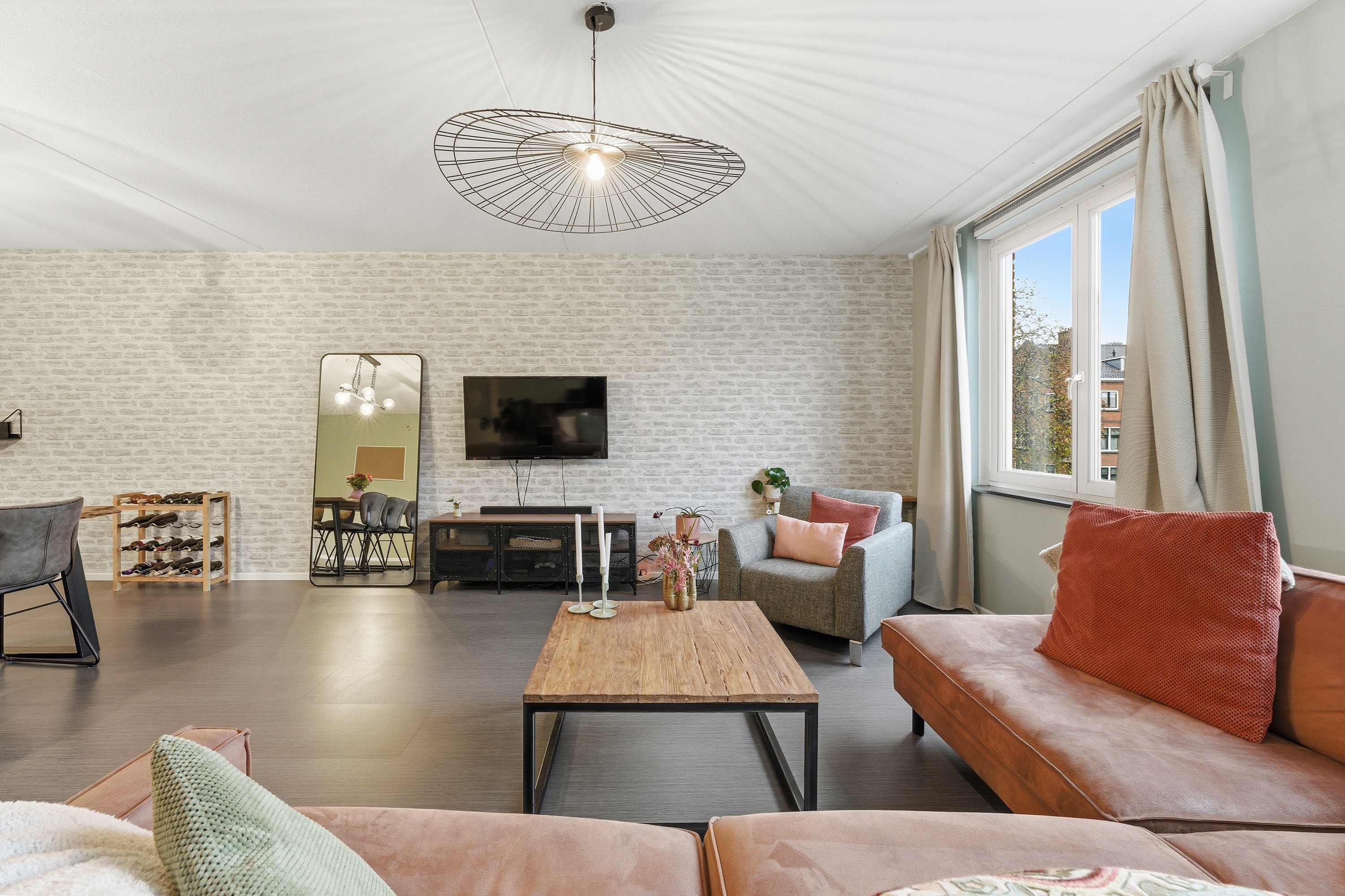 De woonkamer vormt het absolute hart van de woning: royaal, licht en uitnodigend. Dankzij de grote raampartijen valt er veel natuurlijk daglicht naar binnen en ontstaat er een open, warme sfeer. De moderne afwerking en neutrale kleuren zorgen voor een tijdloze uitstraling. Ook is er bij het raam een heerlijke zitplek gecreëerd, waar je heerlijke plek om bijvoorbeeld een boek te lezen. Via de deur in de woonkamer stap je zo het ruime, zonnige balkon op — een heerlijke plek om te ontspannen, een kop koffie te drinken of gezellig buiten te eten.