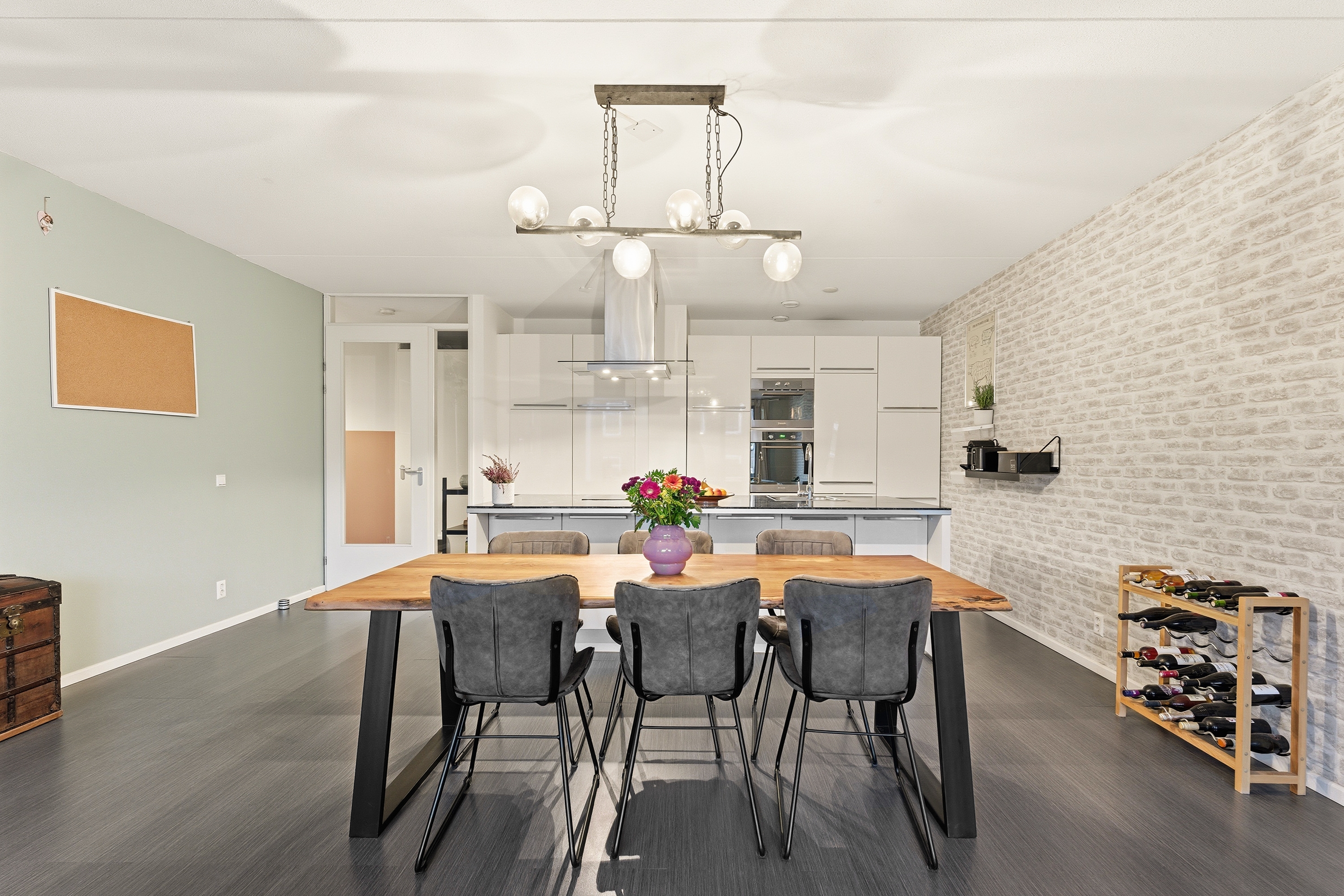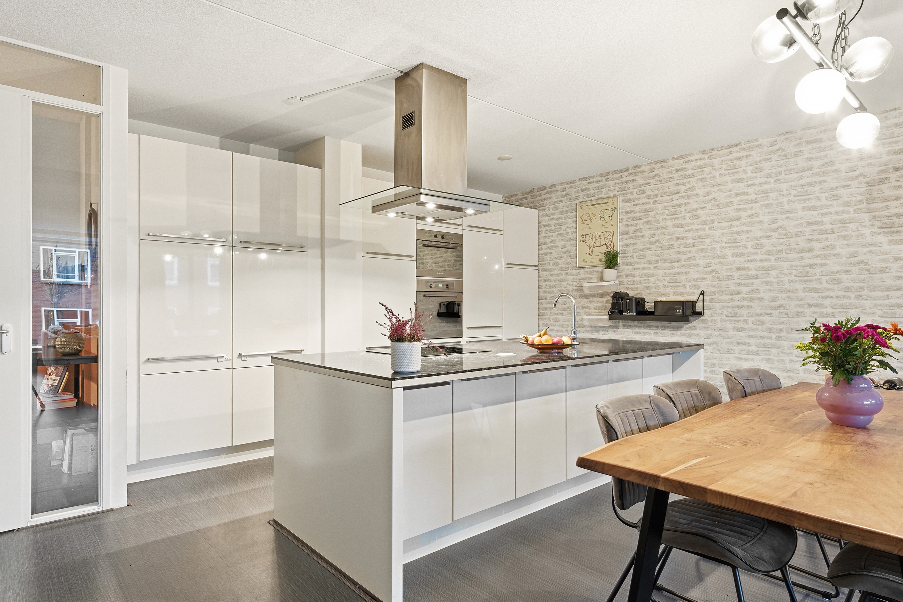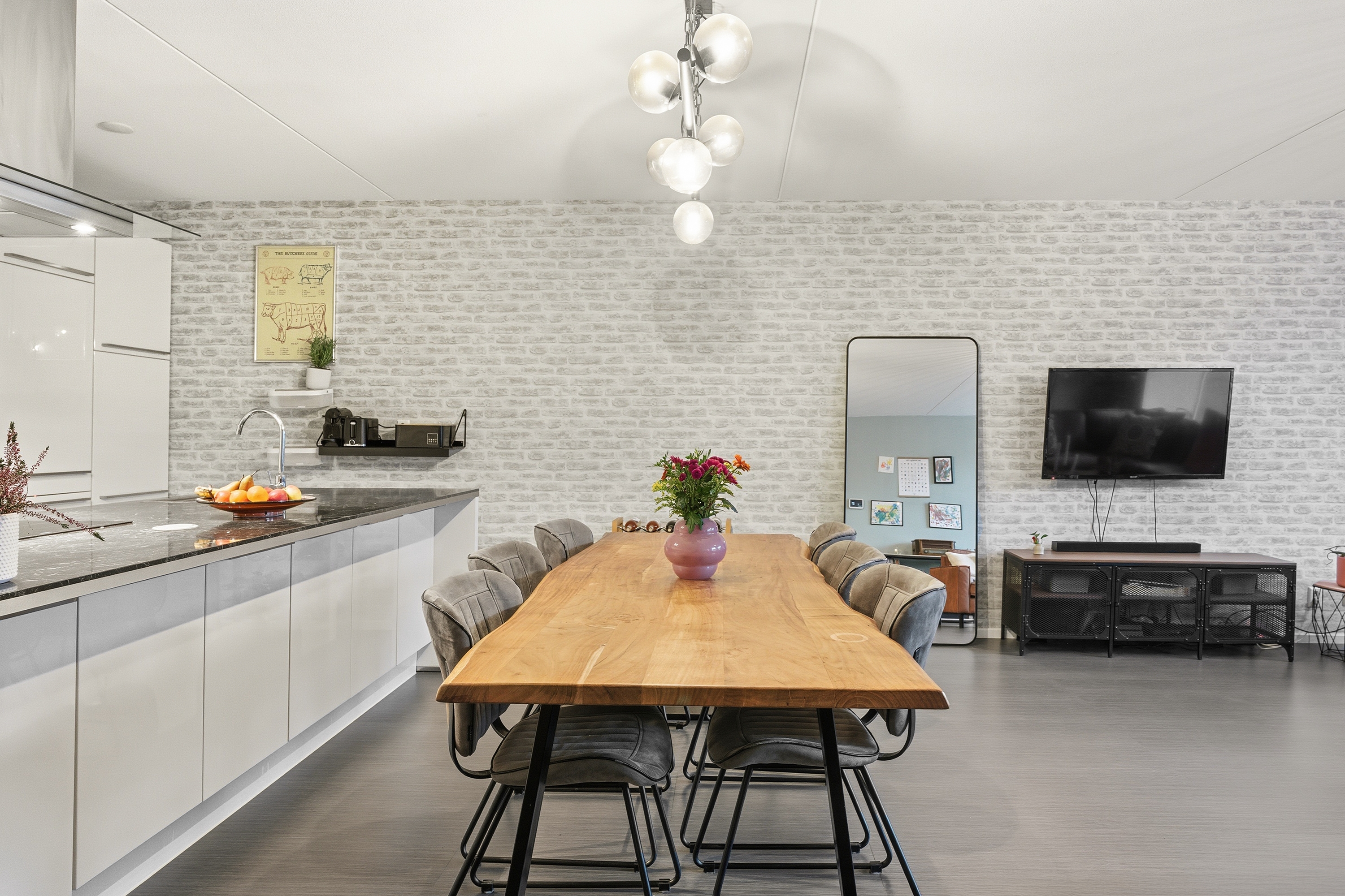 Aangrenzend aan de woonkamer ligt de luxe open keuken, uitgevoerd met een groot kookeiland dat direct opvalt. Deze moderne keuken is voorzien van diverse inbouwapparatuur, waaronder een inductiekookplaat, afzuigkap, koelkast, vriezer, vaatwasser, oven en combi-oven. De combinatie van het ruime werkblad, de hoeveelheid opbergruimte en de strakke vormgeving maakt dit een droomplek voor iedere kookliefhebber.