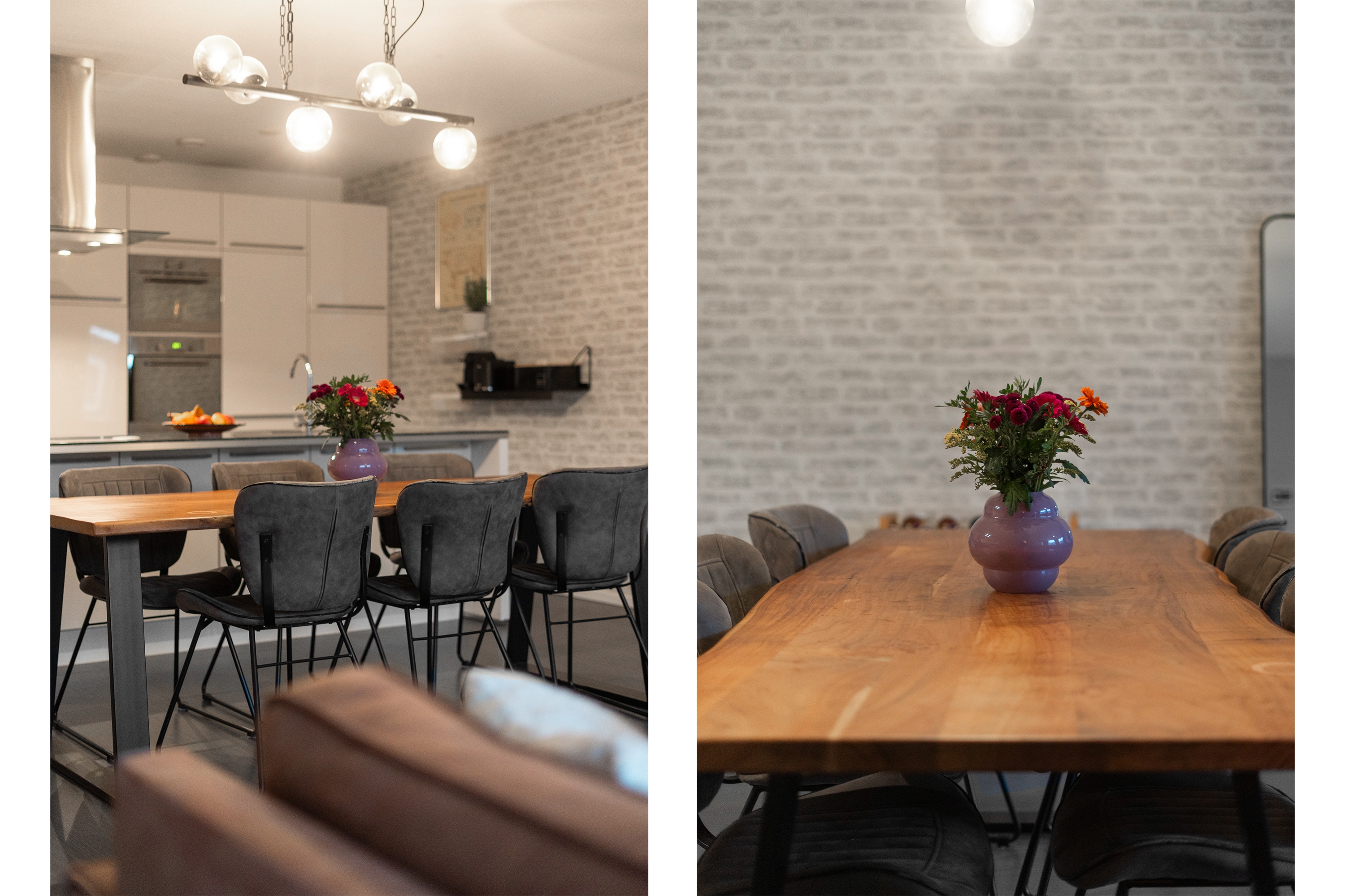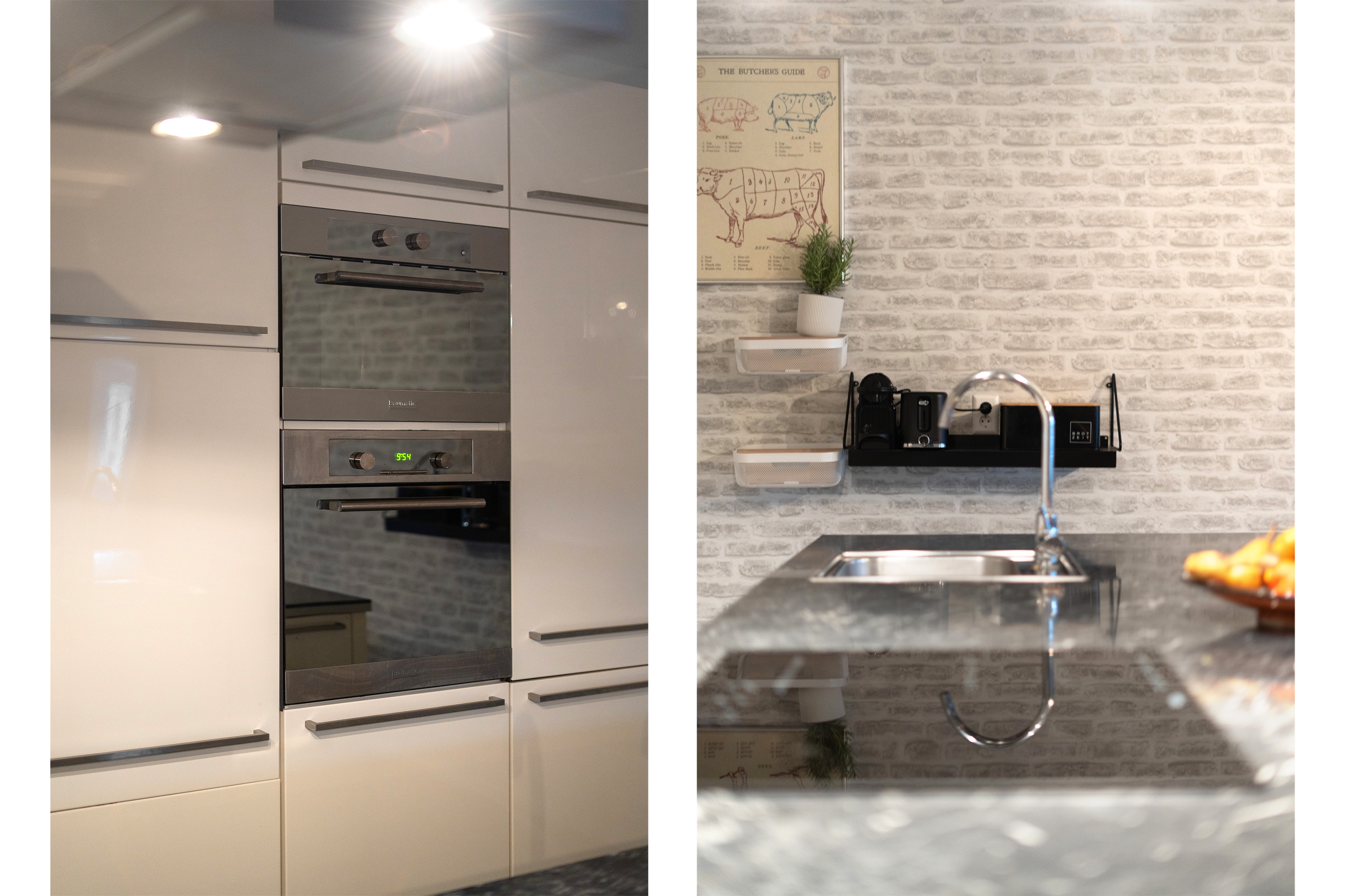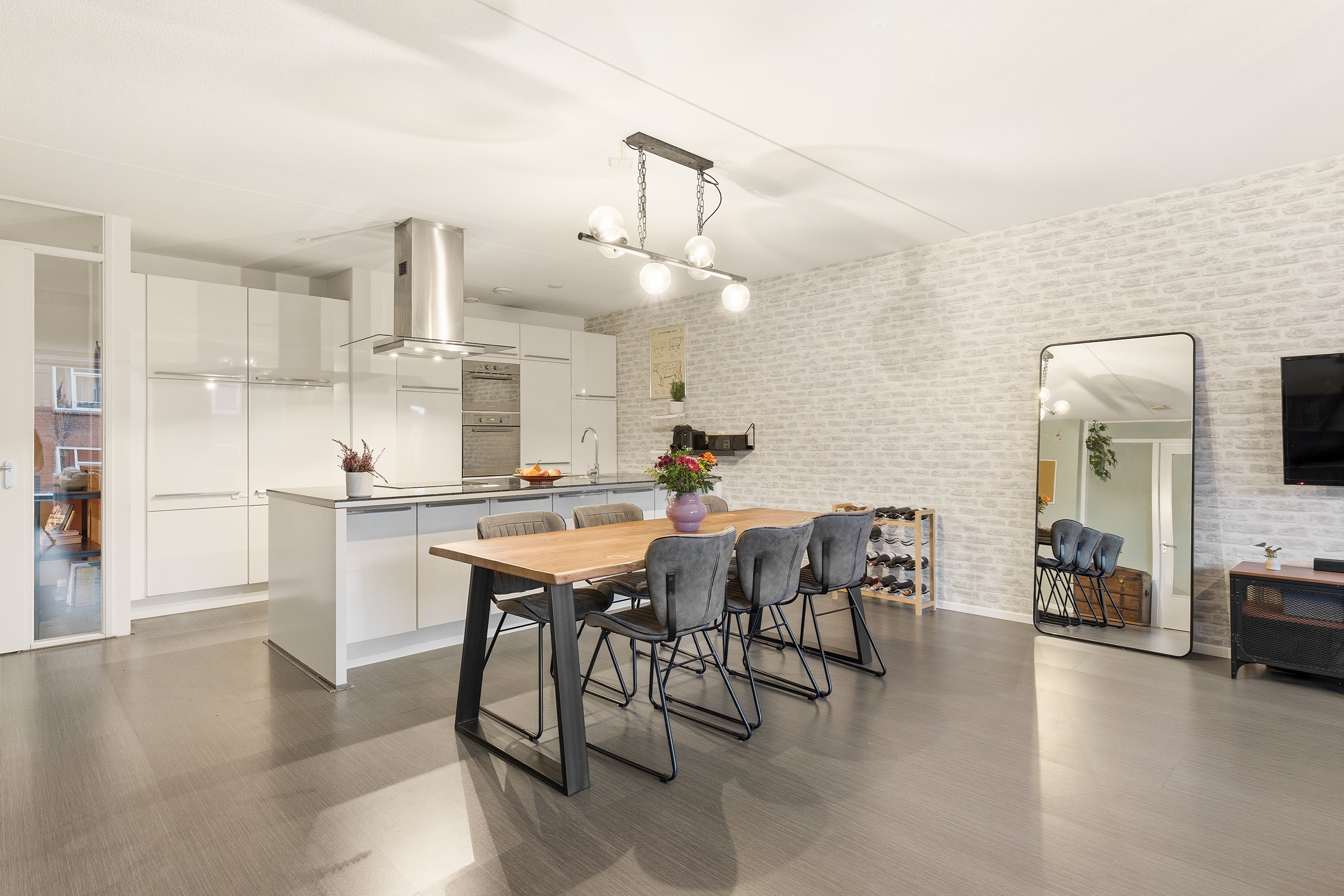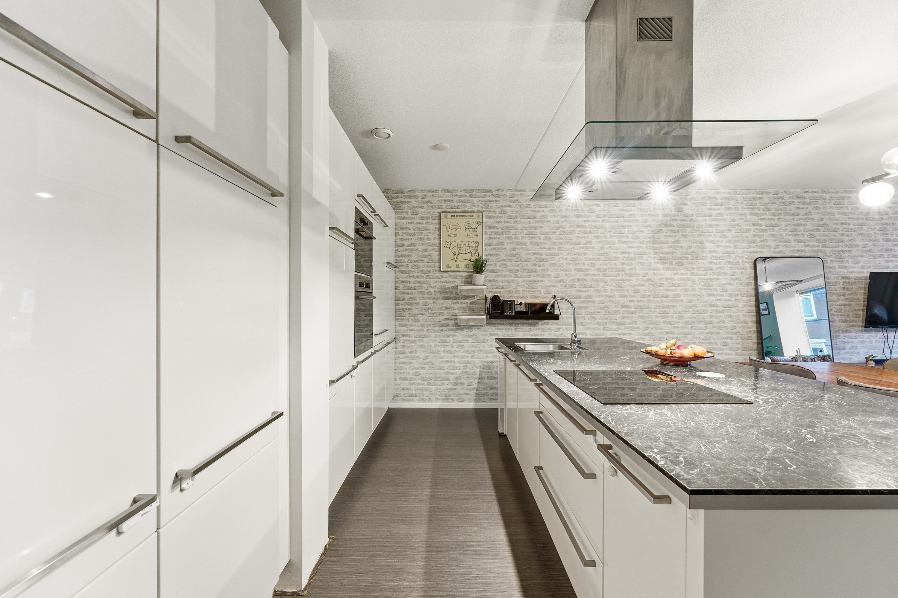 Aangrenzend aan de woonkamer ligt de luxe open keuken, uitgevoerd met een groot kookeiland dat direct opvalt. Deze moderne keuken is voorzien van diverse inbouwapparatuur, waaronder een inductiekookplaat, afzuigkap, koelkast, vriezer, vaatwasser, oven en combi-oven. De combinatie van het ruime werkblad, de hoeveelheid opbergruimte en de strakke vormgeving maakt dit een droomplek voor iedere kookliefhebber.