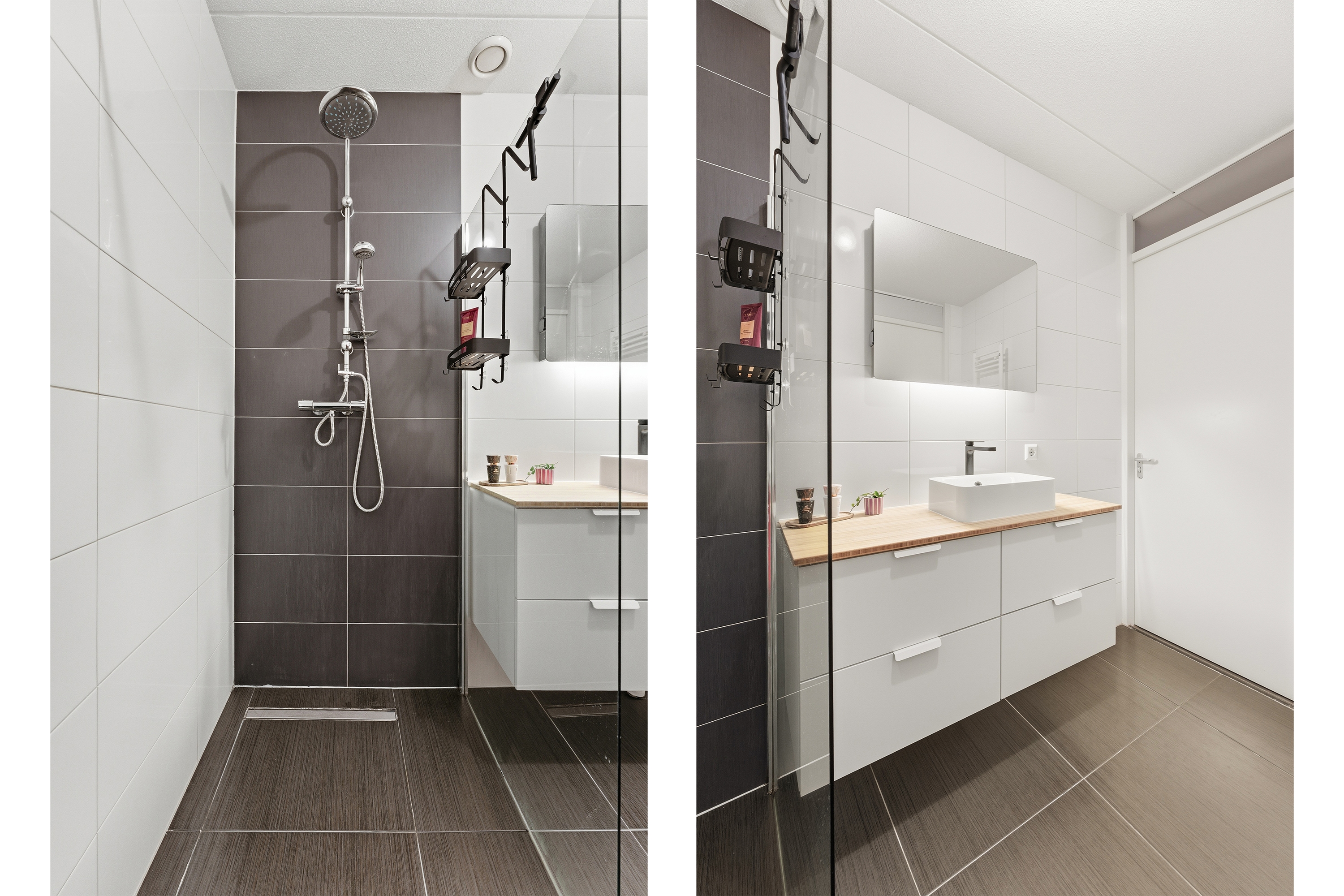 De volledig betegelde badkamer is modern ingericht en voorzien van een royale inloopdouche, een stijlvol wastafelmeubel, spiegel met verlichting, een handdoekradiator en eigentijdse tegels. Alles ademt kwaliteit en comfort.